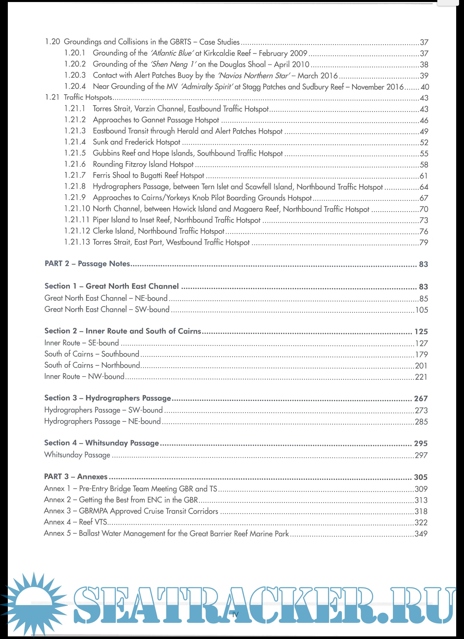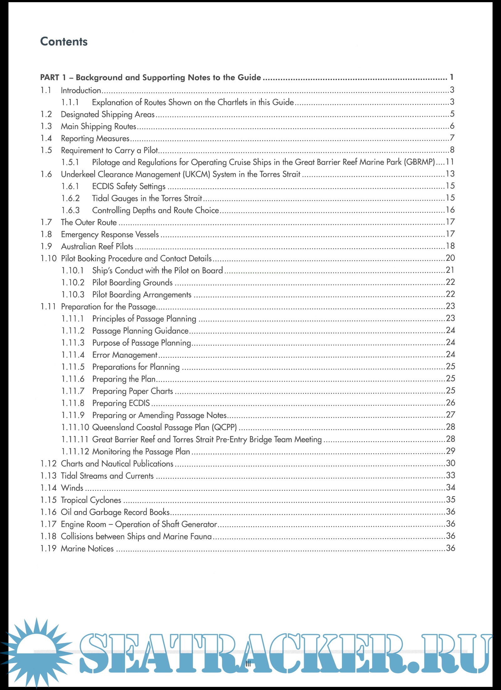 Year: 2019 Language: english Author: AMSA Genre: Guide Edition: 3 Format: PDF Quality: Scanned pages + text layer Pages count: 263 Description: The Great Barrier Reef is an area of global environmental and economic importance. As early as 1975, the Australian Government recognised its significance by creating the Great Barrier Reef Marine Park Authority (GBRMPA) to regulate all activities that take place within the marine park. Its scientific, cultural and historic importance led to the Park being added to the UNESCO World Heritage Site List in 1981, with the adjoining and connected Gondwana Tropical Rainforests added in 1986. The Park, and the adjoining area encompassing the Torres Strait up to the border with Papua New Guinea, was designated a Particularly Sensitive Sea Area (PSSA) in 1990, which led to the introduction of compulsory pilotage the following year. Consequently, passing through these areas can be a cause of concern for the mariner, particularly if the bridge team is unfamiliar with the region. Although the whole of the Torres Strait and Great Barrier Reef lies within the state of Queensland, regulation of activities within this area is covered by both state and federal legislation. The source information is not always easy to locate and interpret, particularly if the ship has not been able to obtain all the necessary documentation prior to departing the last port. This Guide contains the information the bridge team will need to properly prepare for the ship's transit through the area. All the data contained within this Guide has been collated and validated by Australian Reef Pilots, drawing on their considerable experience in all areas of the Marine Park. It is also their approved familiarisation and training guide. Australian Reef Pilots strongly recommend that this Guide is used, not only as part of the ship's pre-entry procedures, but also as a tool for familiarising and refreshing the bridge team each time the ship is planning a passage through the area. Its design, with pull-out chartlets, allows this Guide to be used in 'real time', giving the navigator the overview that can be lost with the introduction of ECDIS paperless ships. Additional info: https://seatracker.club/viewtop...?p=110064#110064