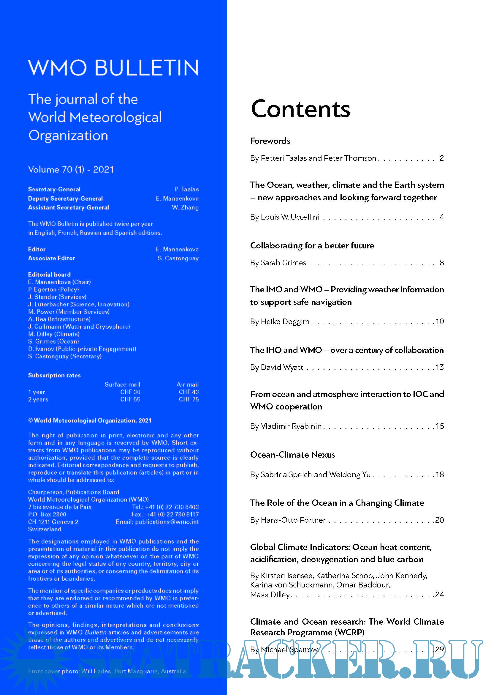 Year: 2021 Language: english Author: WMO Genre: Bulletin Format: PDF Quality: eBook Pages count: 114 Description: The WMO Bulletin is the official journal of the World Meteorological Organization. The Bulletin was first published in 1952 and is produced in English, French, Russian and Spanish. The Bulletin is currently issued twice yearly. WMO BULLETIN The journal of the World Meteorological Organization Volume 70 (1) - 2021