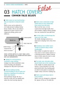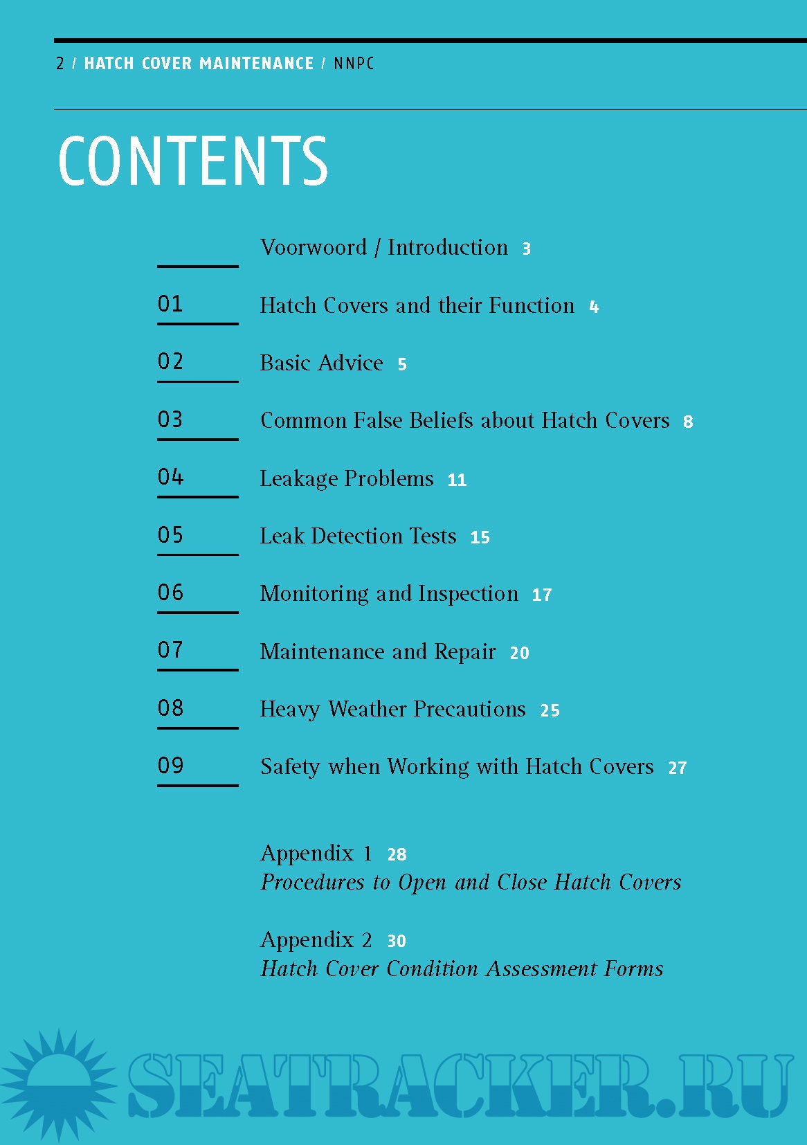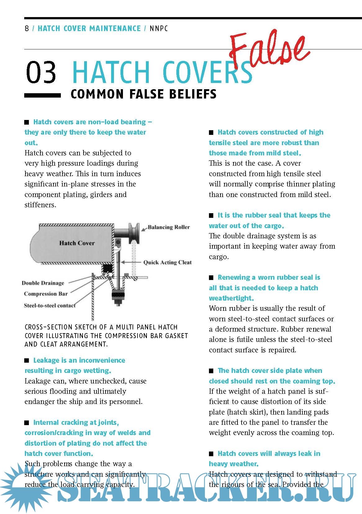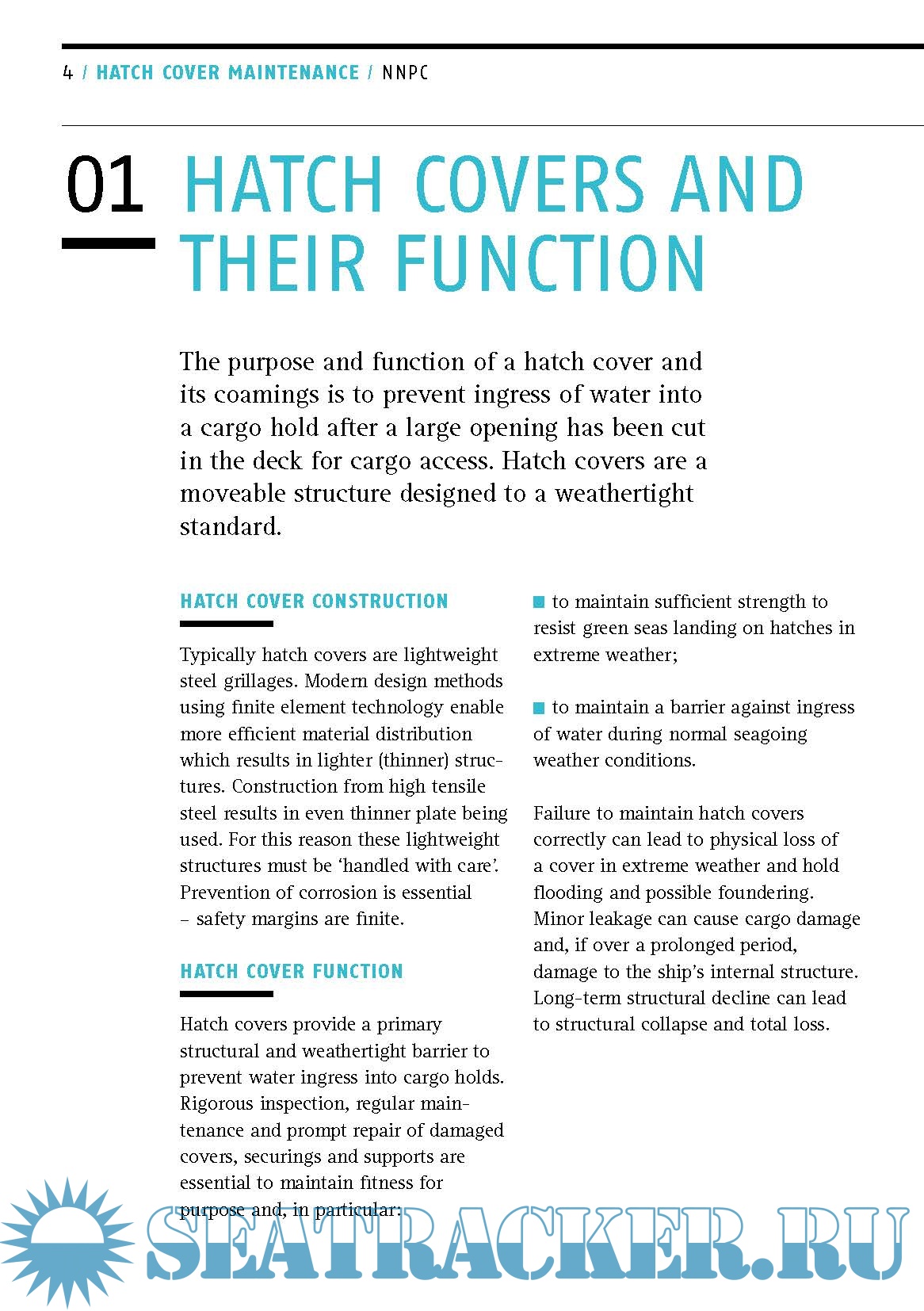 Year: 201x Language: english Author: NNPC Genre: Guide Format: PDF Quality: eBook Pages count: 32 Description: It is generally accepted that leaking hatch covers are a principal cause of cargo wetting. Hatches leak for a variety of reasons, but mainly because of poor maintenance or failure to close them properly. Leaking or badly maintained hatch covers can lead to more serious consequences than wet cargo – flooding, accelerated corrosion or even loss of the ship. These problems are addressed in the guide. It is the aim of this NNPC Master’s Guide to explain the key issues of hatch cover security and to steer mariners towards active maintenance. It is less expensive to keep hatch covers weather tight by regular maintenance, than to pay claims for wet damaged cargo. Besides that it is crucial for the safety on board ship.