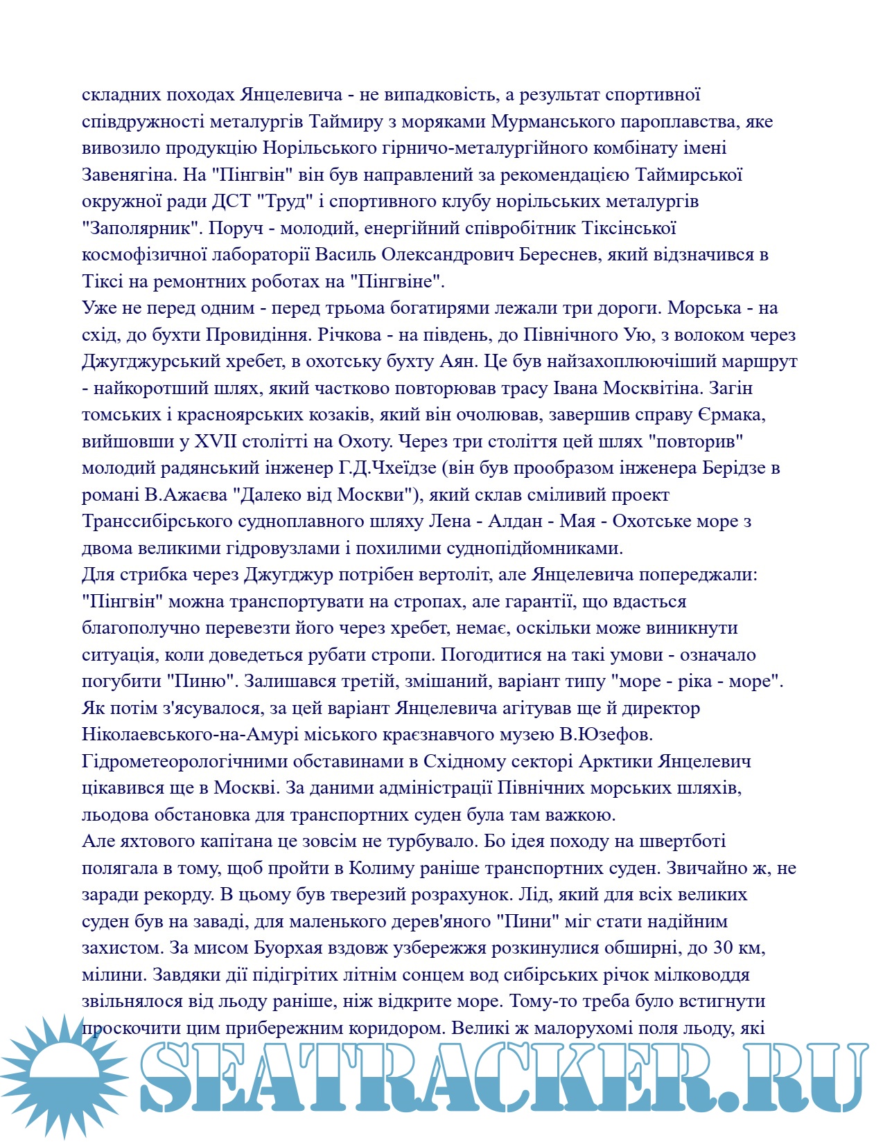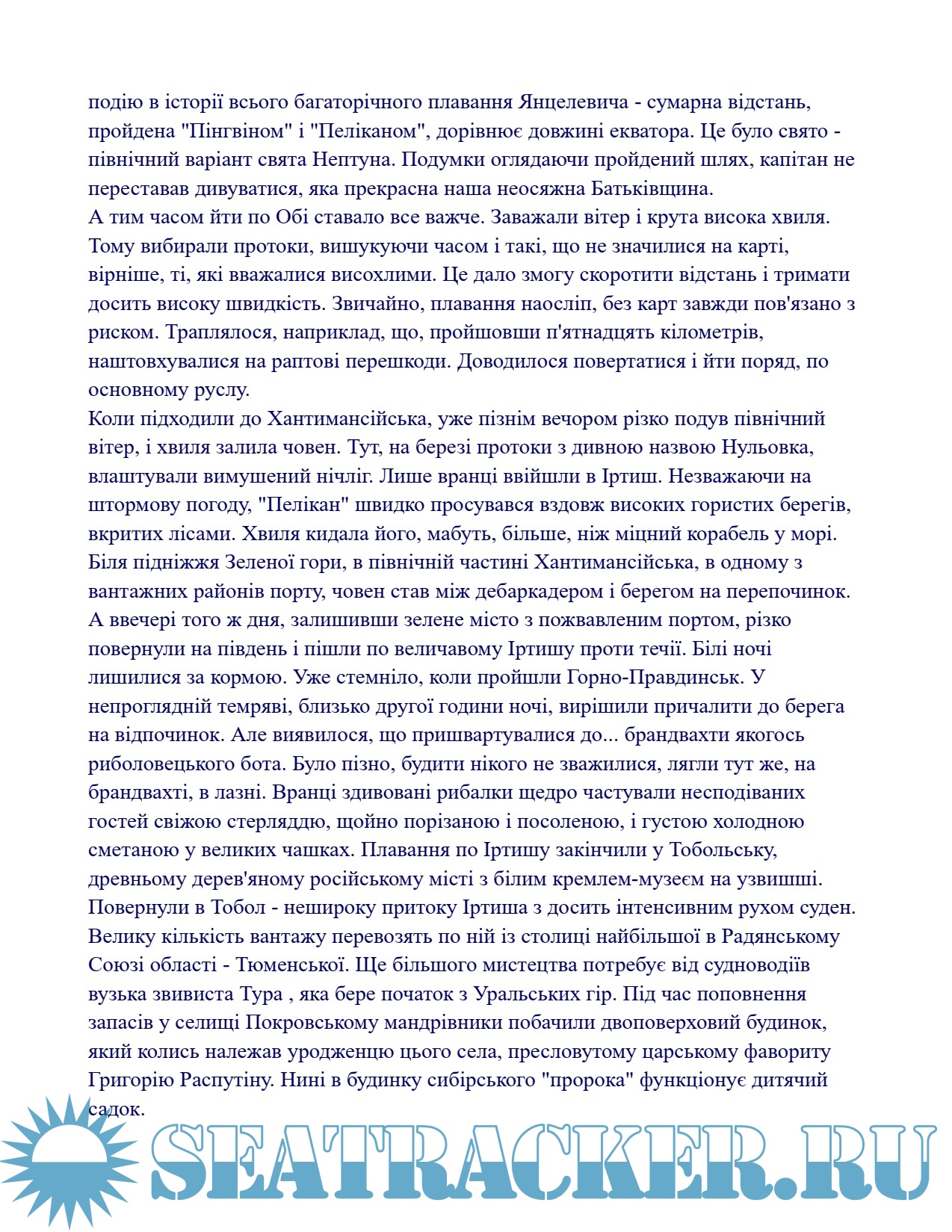 Описание: В селе Циблях, на Киевщине, живет удивительный человек. Участники советских антарктических экспедиций называли его не иначе, как "железным капитаном". С легкой руки участника экспедиций на "Ра" и "Тигрисе" Ю. Сенкевича журналисты окрестили его "тысяча первым Одиссеем". Сегодня его имя ставят в один ряд с именами выдающихся путешественников XX века - 3.Толля и Т. Хейердала, Ф. Чичестера и А. Бомбара.