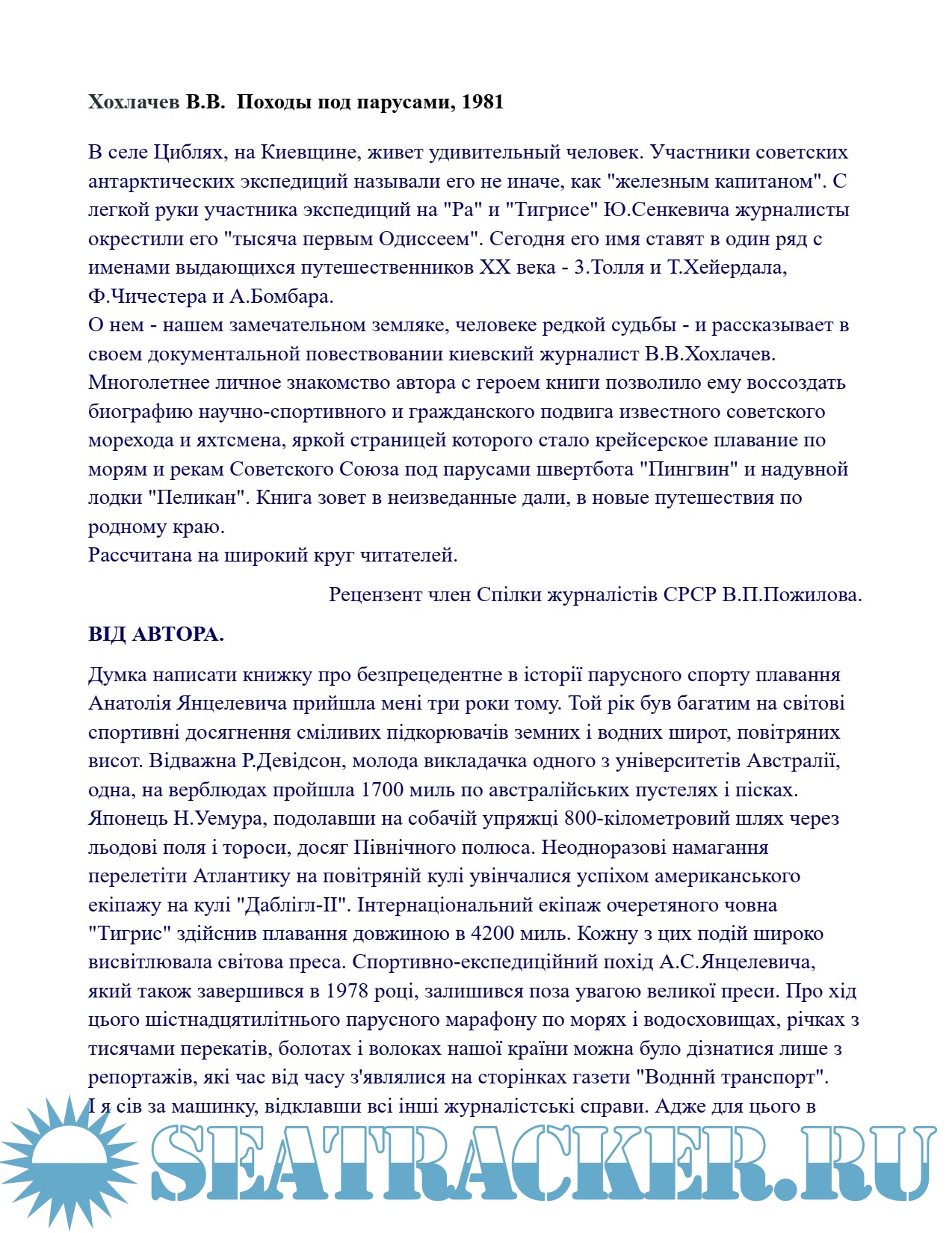 В.В. Хохлачев. Многолетнее личное знакомство автора с героем книги позволило ему воссоздать биографию научно-спортивного и гражданского подвига известного советского морехода и яхтсмена, яркой страницей которого стало крейсерское плавание по морям и рекам Советского Союза под парусами швертбота "Пингвин" и надувной лодки "Пеликан". Книга зовет в неизведанные дали, в новые путешествия по родному краю.