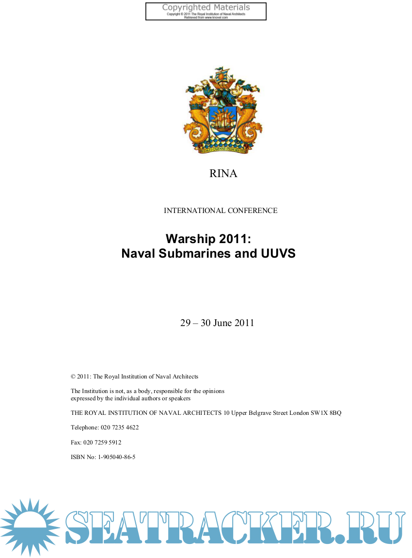 Year: 2011 Language: english Author: RINA Genre: International Conference Publisher: The Royal Institution of Naval Architects Edition: 29 – 30 June 2011 ISBN: 1-905040-86-5 Format: PDF Quality: eBook Pages count: 634 Description: Collection of papers regarding naval submarines and UUVs submitted to the International Conference in Bath, UK between 29 – 30 June, 2011.