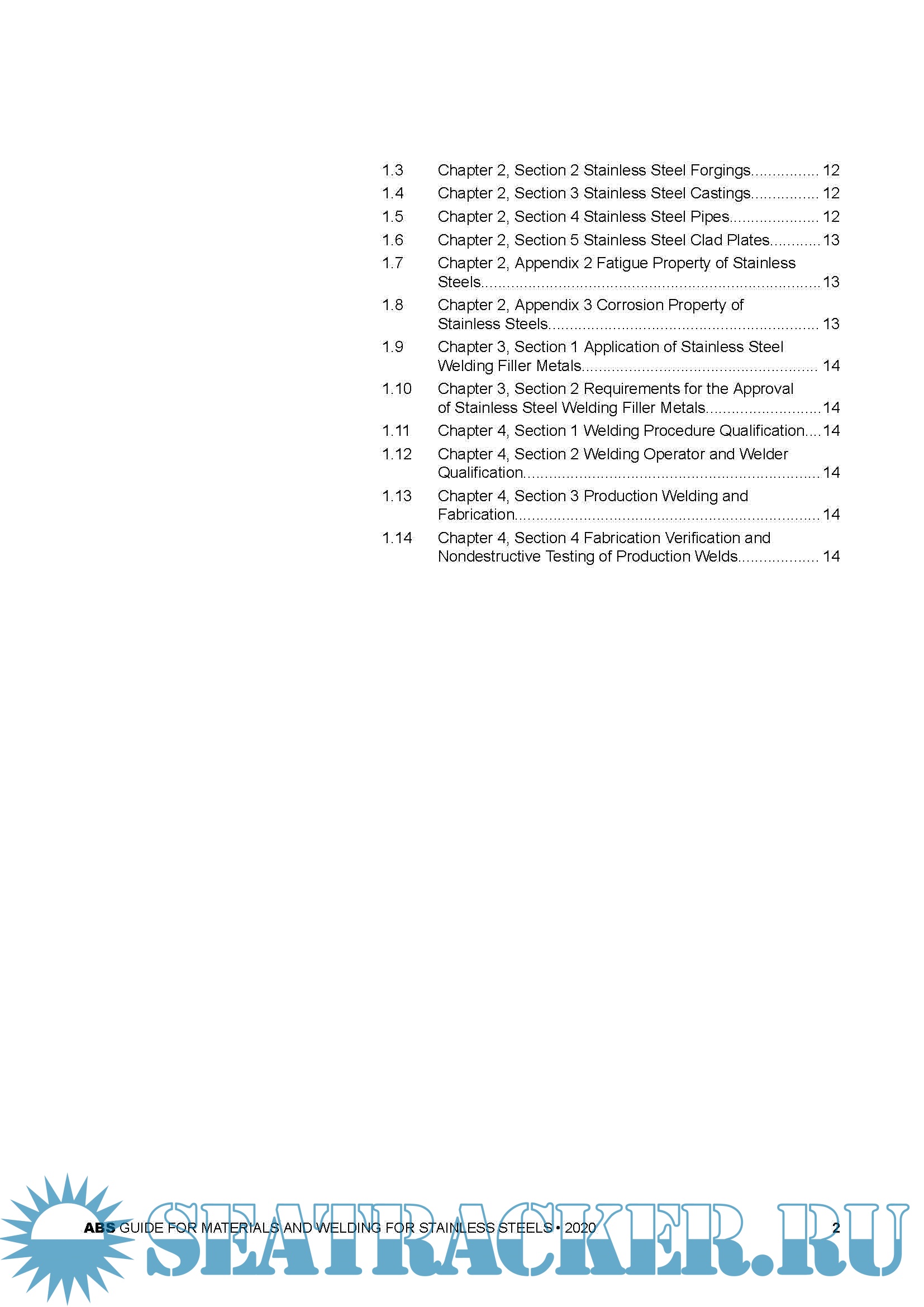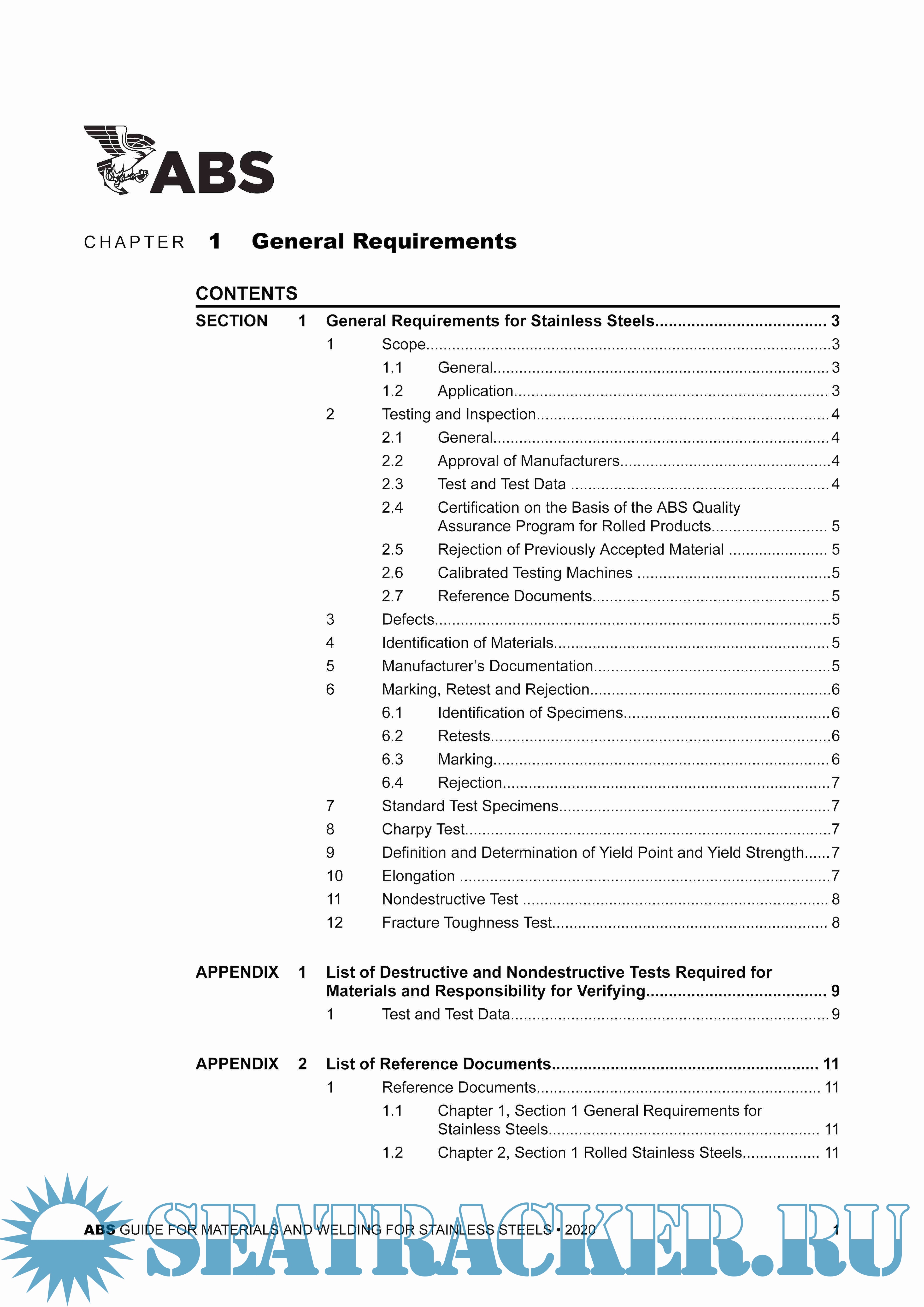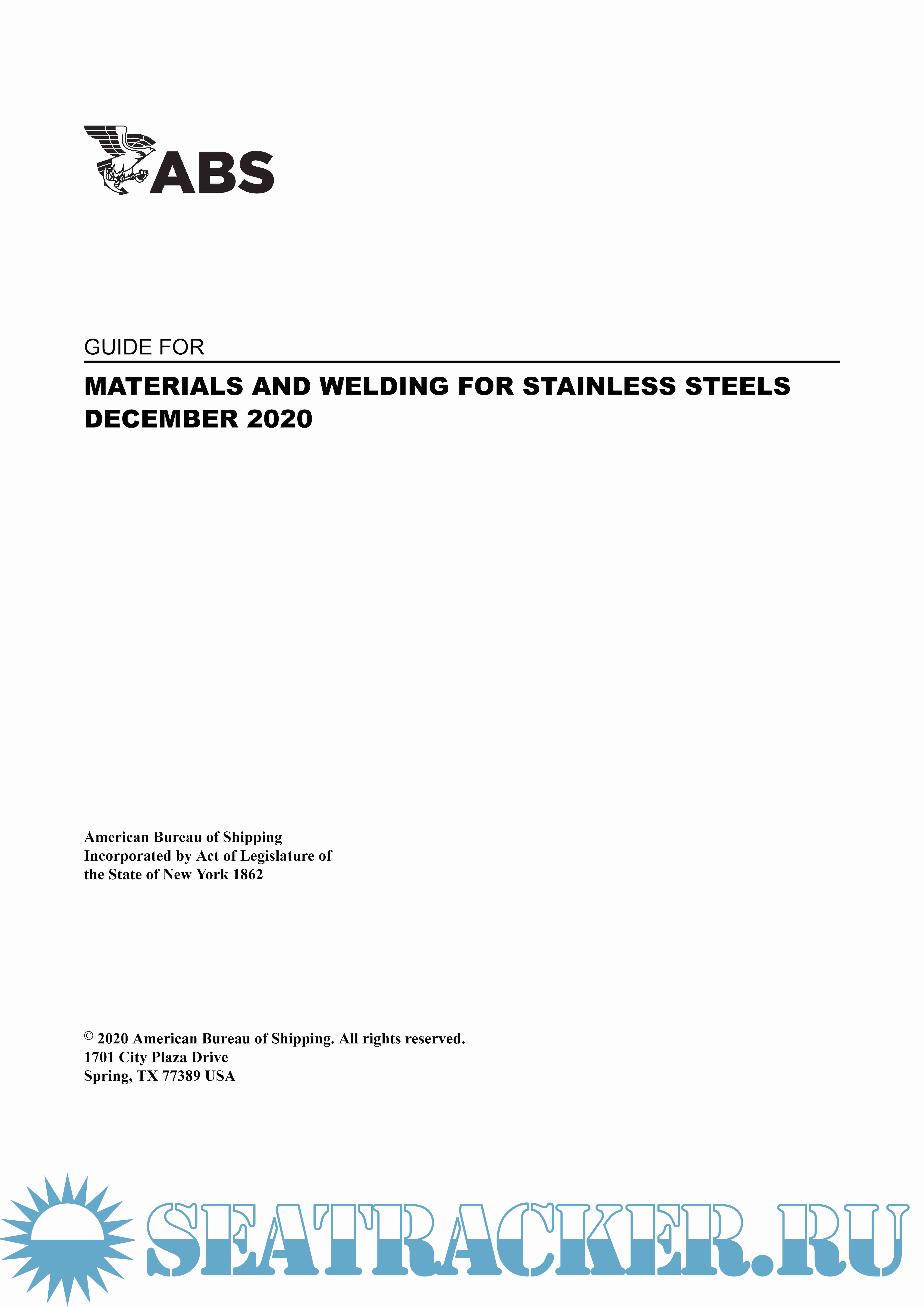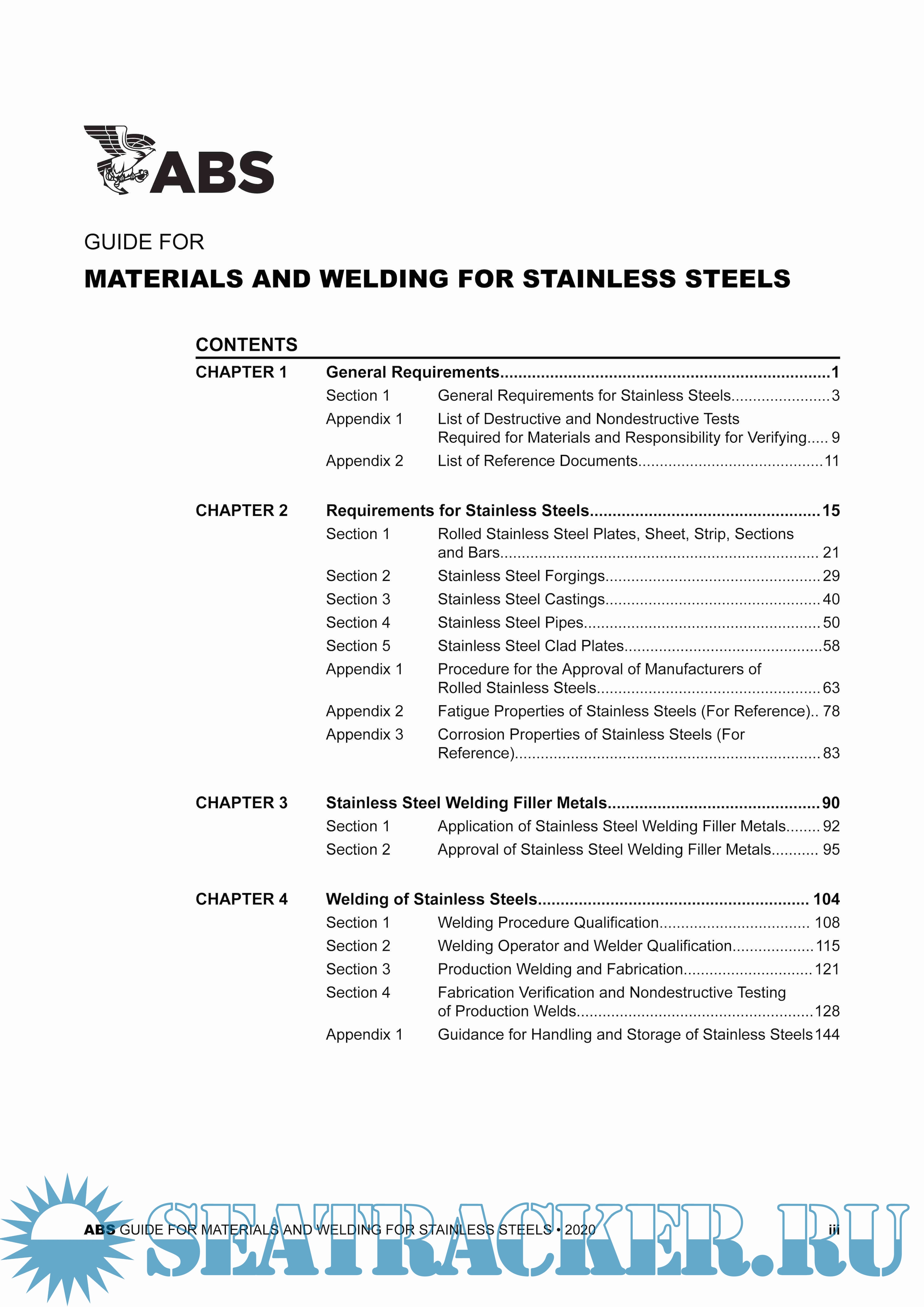 Year: 2020 Language: english Author: ABS Genre: Guide Publisher: ABS Format: PDF Quality: eBook Pages count: 151 Description: This Guide has been developed to give minimum requirements for properties, manufacturing processes and fabrication techniques applicable to common types of stainless steels used in the marine and offshore industries. This Guide covers four chapters pertaining to materials and welding for stainless steels: ● Chapter 1 contains general requirements for austenitic and duplex stainless steels. ● Chapter 2 contains the requirements for rolled materials, forgings, castings, pipes and stainless steel clad plates. ● Chapter 3 contains the requirements for various types of welding filler metals and the applicable base metals. ● Chapter 4 contains the requirements for welding procedures and welder qualification, production welding and fabrication, fabrication verification and nondestructive testing of production welds. The general requirements and practices in this Guide provide qualification of materials and quality control in production and fabrication from raw materials to the end use in ships, offshore units, pressure vessels, piping systems or components.