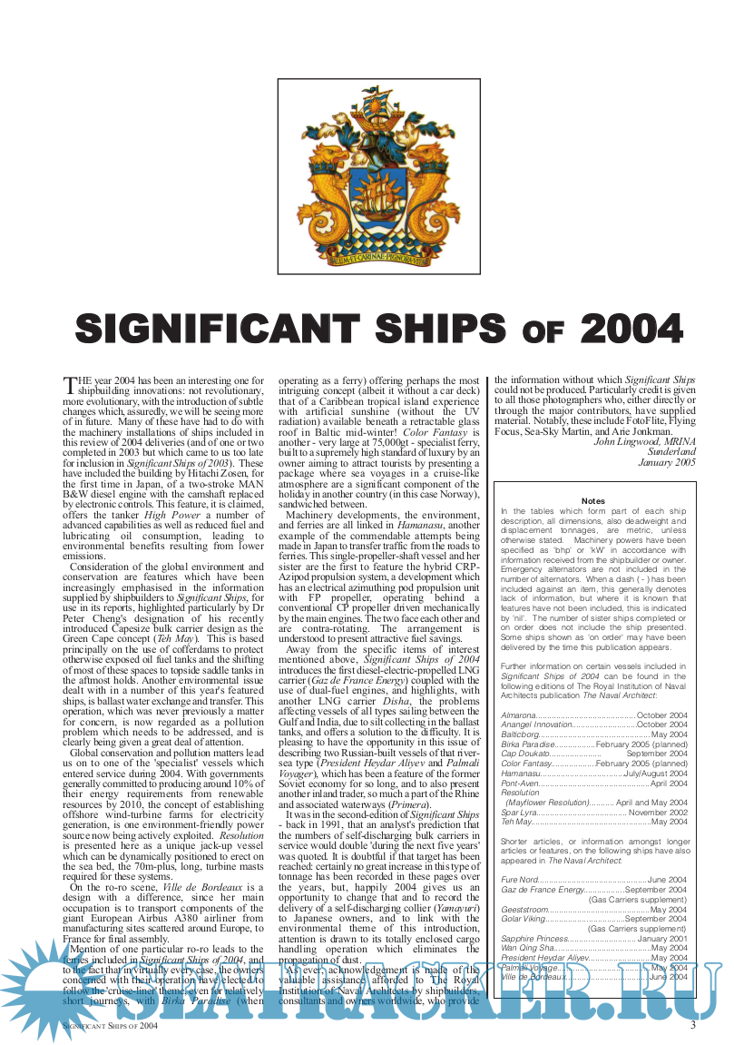 Description: One of RINA's most popular publications. Significant Ships has been published annually every February since 1990 and presents in one volume approximately 50 of the best commercial designs (of approx. 100 metres in length and above) completed by shipyards worldwide in the preceding year. Concise technical information, general arrangement plans and a colour illustration of each ship.
