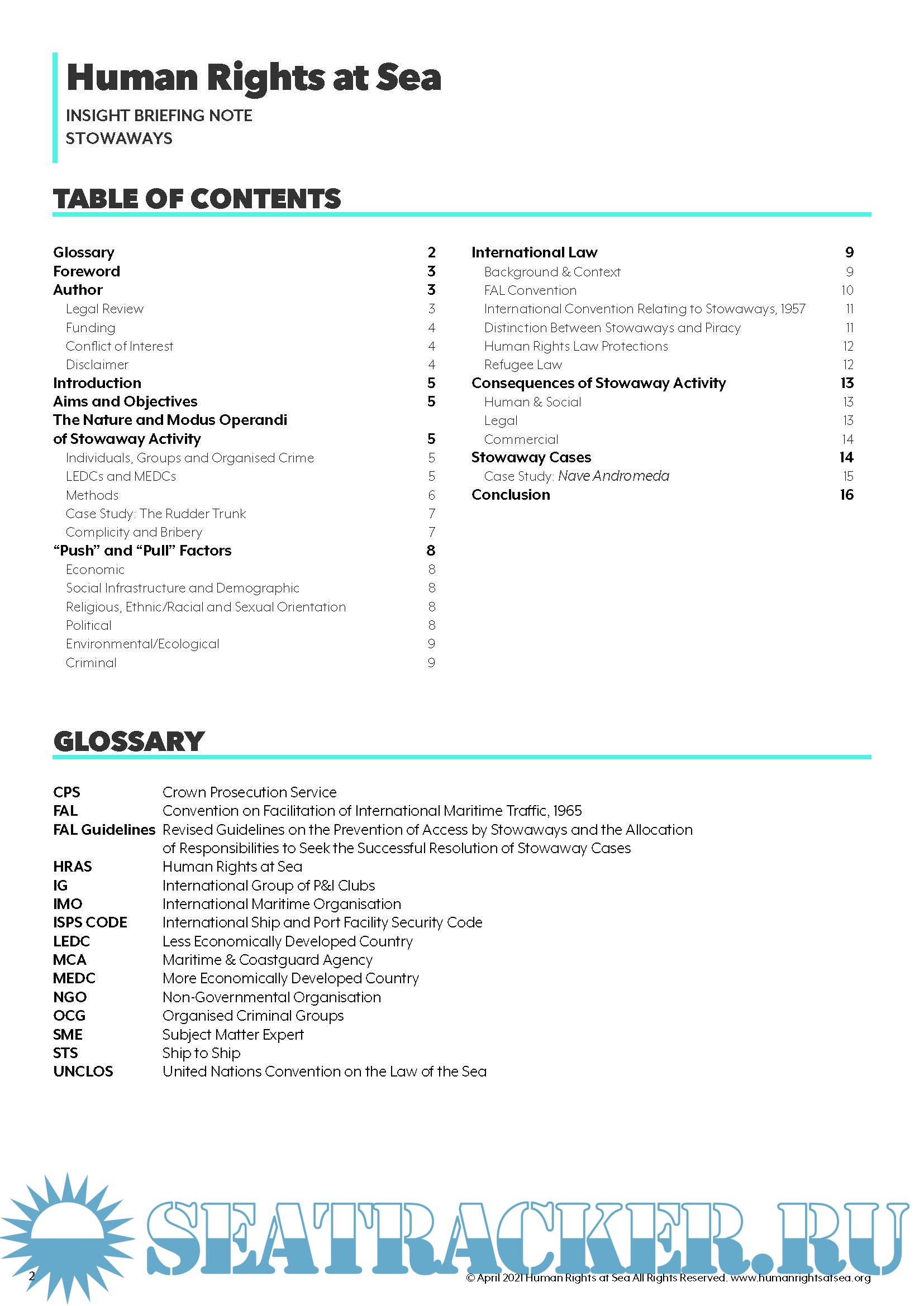 Year: 2021 Language: english Author: Human Rights at Sea Format: PDF Quality: eBook Pages count: 19 Description: Stowaways have been an expected, though unwanted feature of the maritime environment including within the shipping and fisheries industries since ships have travelled between countries and regions. The presence of stowaways on board commercial vessels, in particular, causes a plethora of legal, economic, and indeed political issues, the consequences of which come at cost in monetary and reputational terms to an array of interrelated industry stakeholders. These include owners, managers, insurers and the crew themselves. Yet, underlying these impacts lie human accounts behind the stowaways, each with its own set of unique human factors combining to impel the would-be stowaway to embark on such a perilous journey. This Insight Briefing Note aims to look at the broader issue of stowaways on commercial ships with a particular focus on the ‘push’ and ‘pull’ factors influencing the individuals’ decisions to resort to potential criminal means to achieve their ends. Included questionnaire has been prepared by North P&I to assist in establishing, principally, the true nationality of a stowaway who is without valid travel documentation and to facilitate issuance of a temporary travel document from his country of origin in order that the stowaway can be disembarked and repatriated. Every effort, therefore, should be made to obtain a truthful answer to each of the questions.