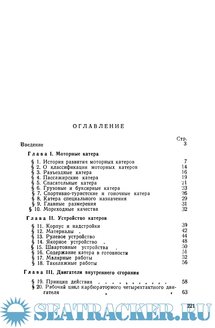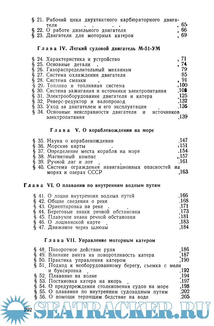 Введение Моторные катера Устройство катеров Двигатели внутреннего сгорания Легкий судовой двигатель М-51-УМ О кораблевождении на море О плавании по внутренним водным путям Управление моторным катером Литература Приложение