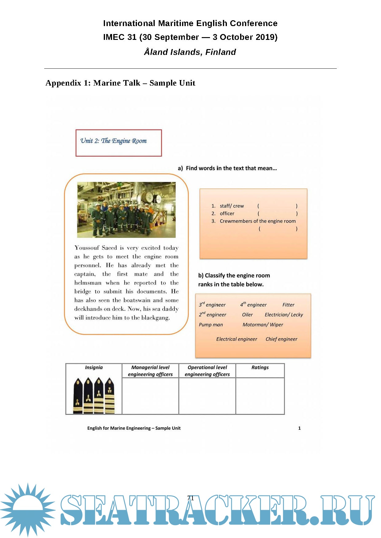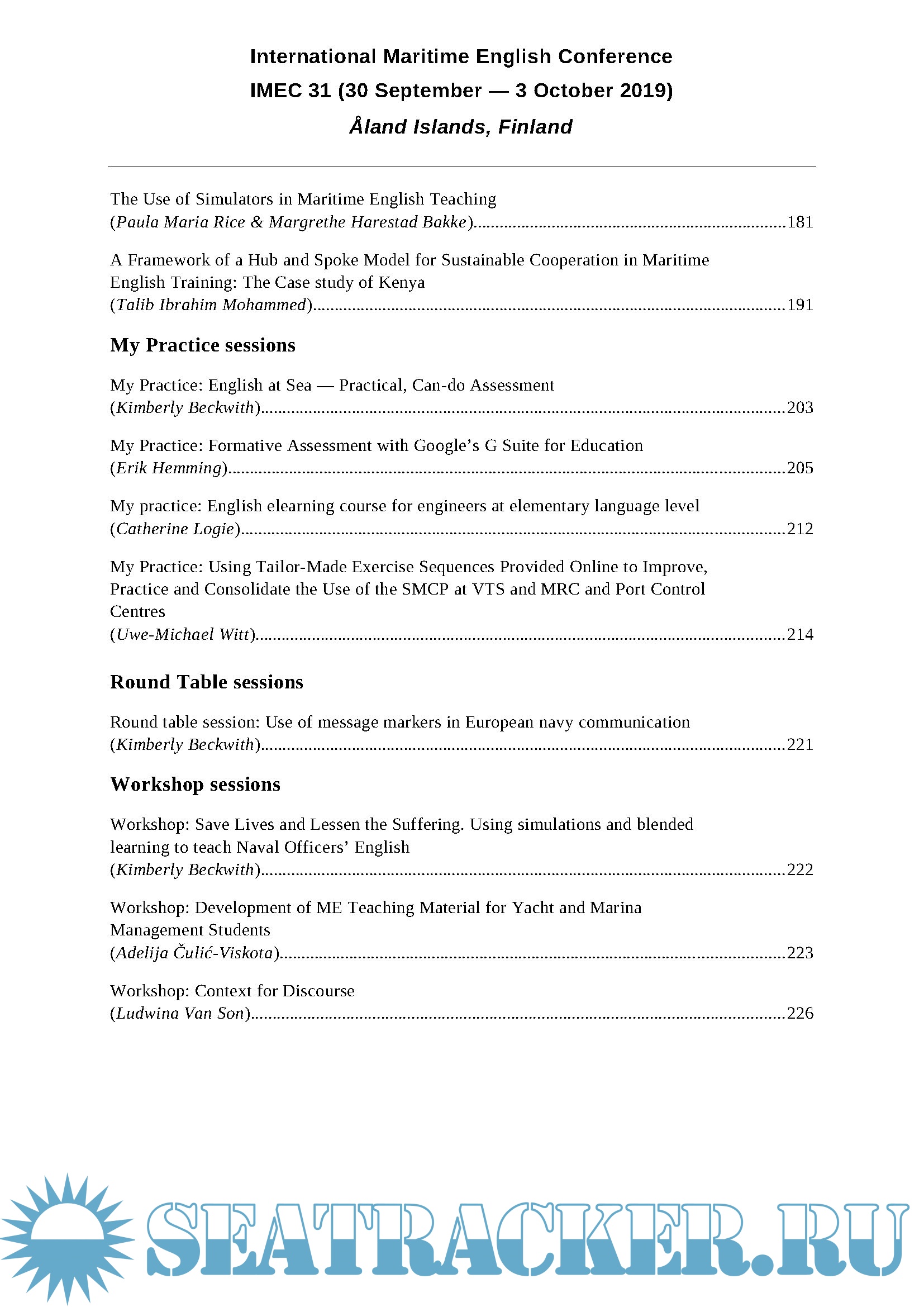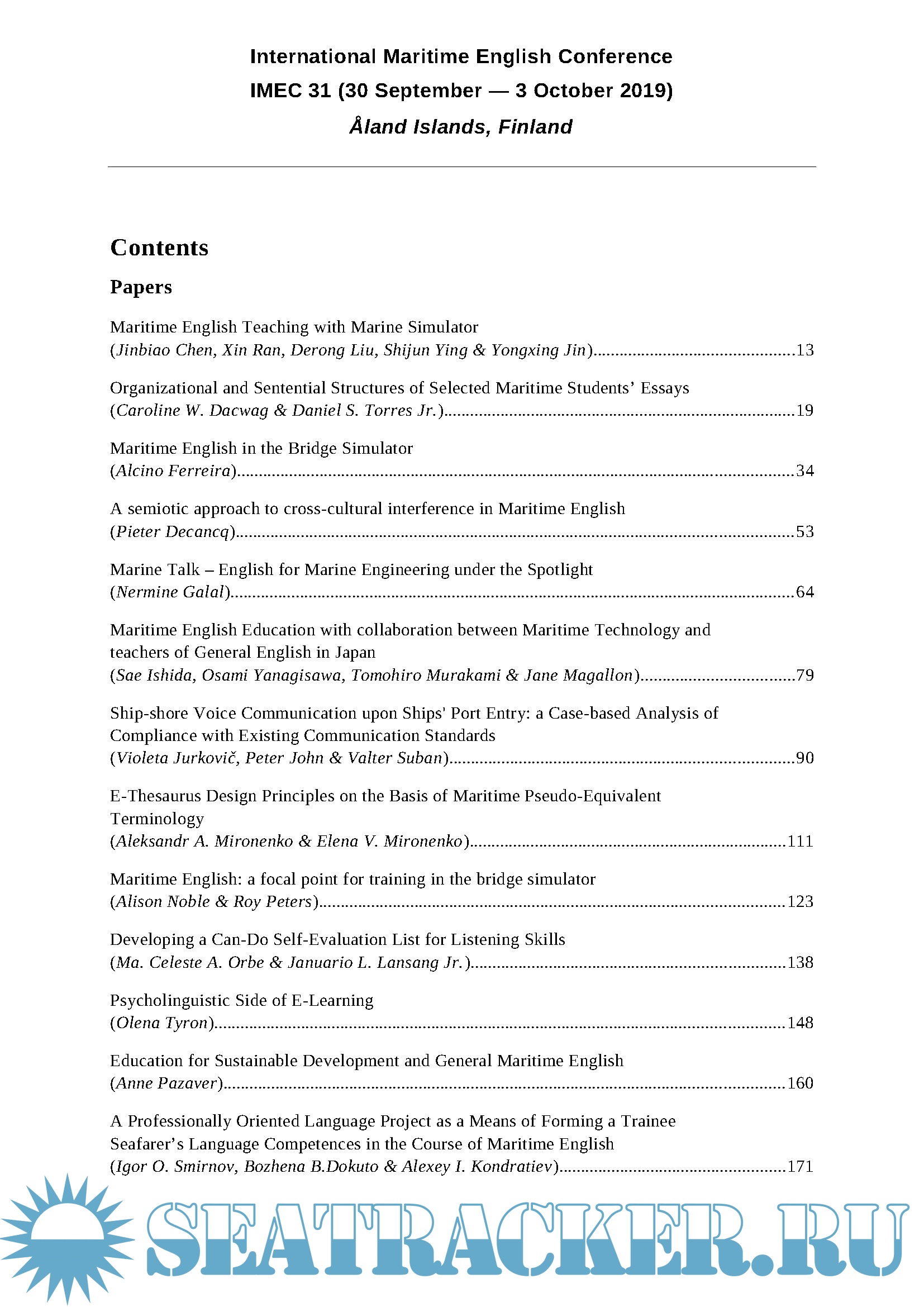 Year: 2019 Language: english Author: IMLA Format: PDF Quality: eBook Pages count: 227 Description: International Maritime English Conference Maritime Communication and culture matters. The International Maritime English Conference is a no-border forum: a round table for discussions on sea-related communication problems concerning a universally accepted language, that of Maritime English. IMEC provides a global forum for teachers and all other parties interested in Maritime English learning, teaching and usage for shipping industry purposes who are welcome to freely present their achievements, share experiences, exchange ideas and make suggestions through the IMEC website, LinkedIn and Facebook pages, and at the annual conferences. Since its establishment IMEC has held 31 conferences worldwide. The IMLA 2020 Joint Conference with IMEC, ICERS and INSCL, scheduled for 1 - 5 September 2020 at the World Maritime University (WMU), Malmö Sweden, has been postponed due to the COVID-19 outbreak.