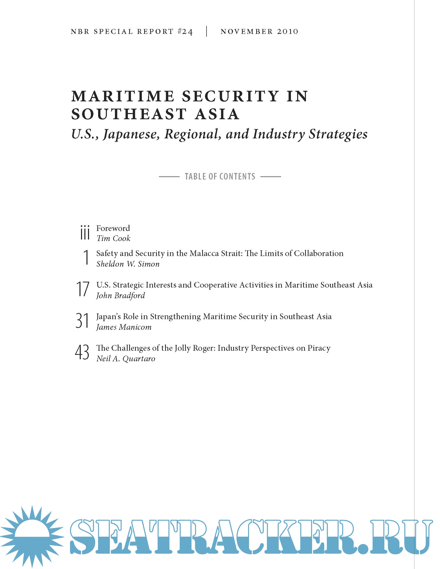 Year: 2010 Language: english Author: The National Bureau of Asian Research (NBR) Format: PDF Quality: eBook Pages count: 60 Description: Pirate activity in strategically important waterways around the globe, from the Strait of Malacca to the waters off the Horn of Africa, has garnered significant attention recently from states dependent on these waters for international trade and the free movement of goods. State responses have ranged from independently dispatching naval forces to patrol major sea lines of communication to multinational patrols and information-sharing mechanisms to increase domain awareness. Less visible but of equal—or perhaps even greater—importance, are the efforts of shipowners, operators, and maritime industry groups toward increasing ship security and combating pirate attacks.