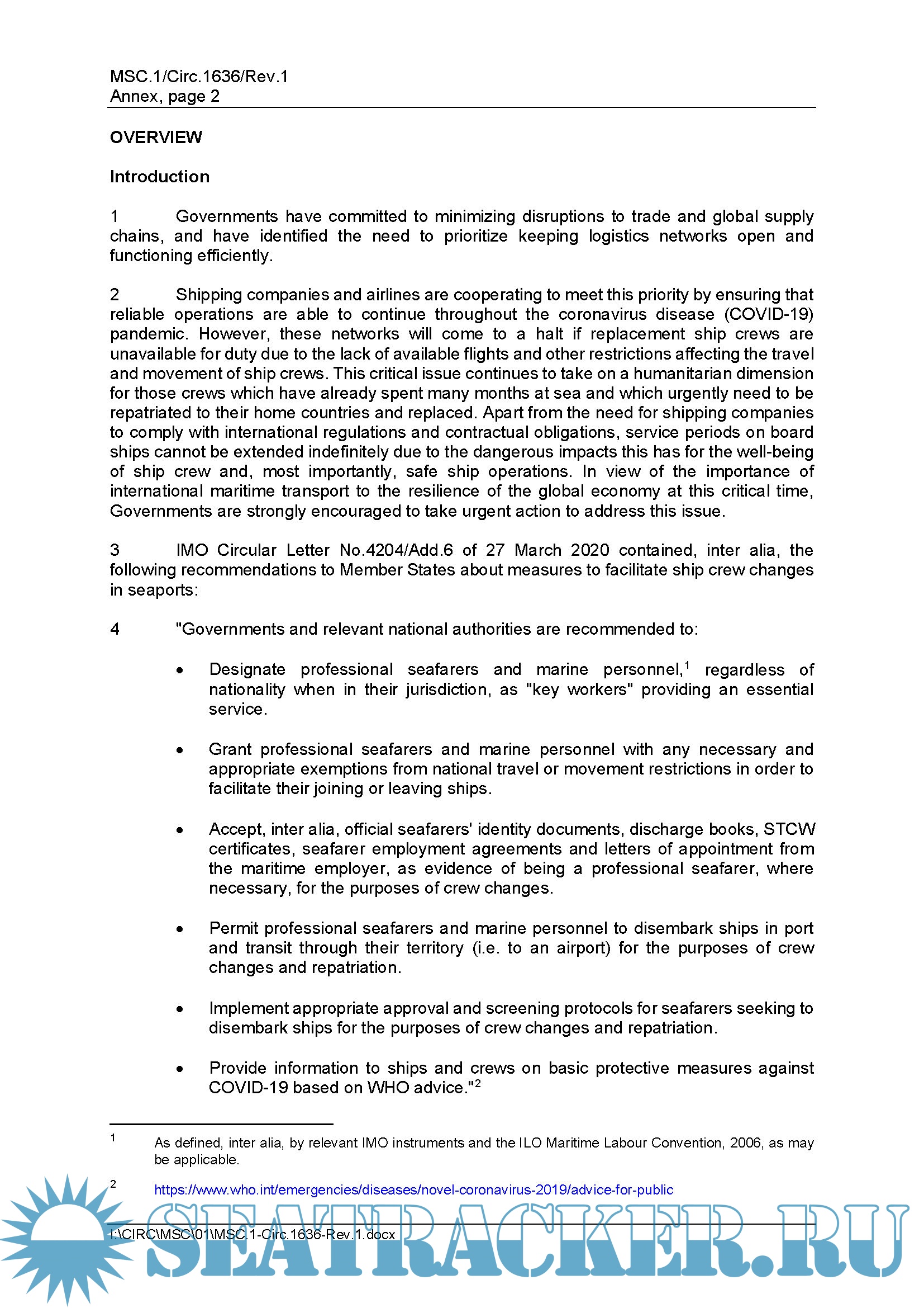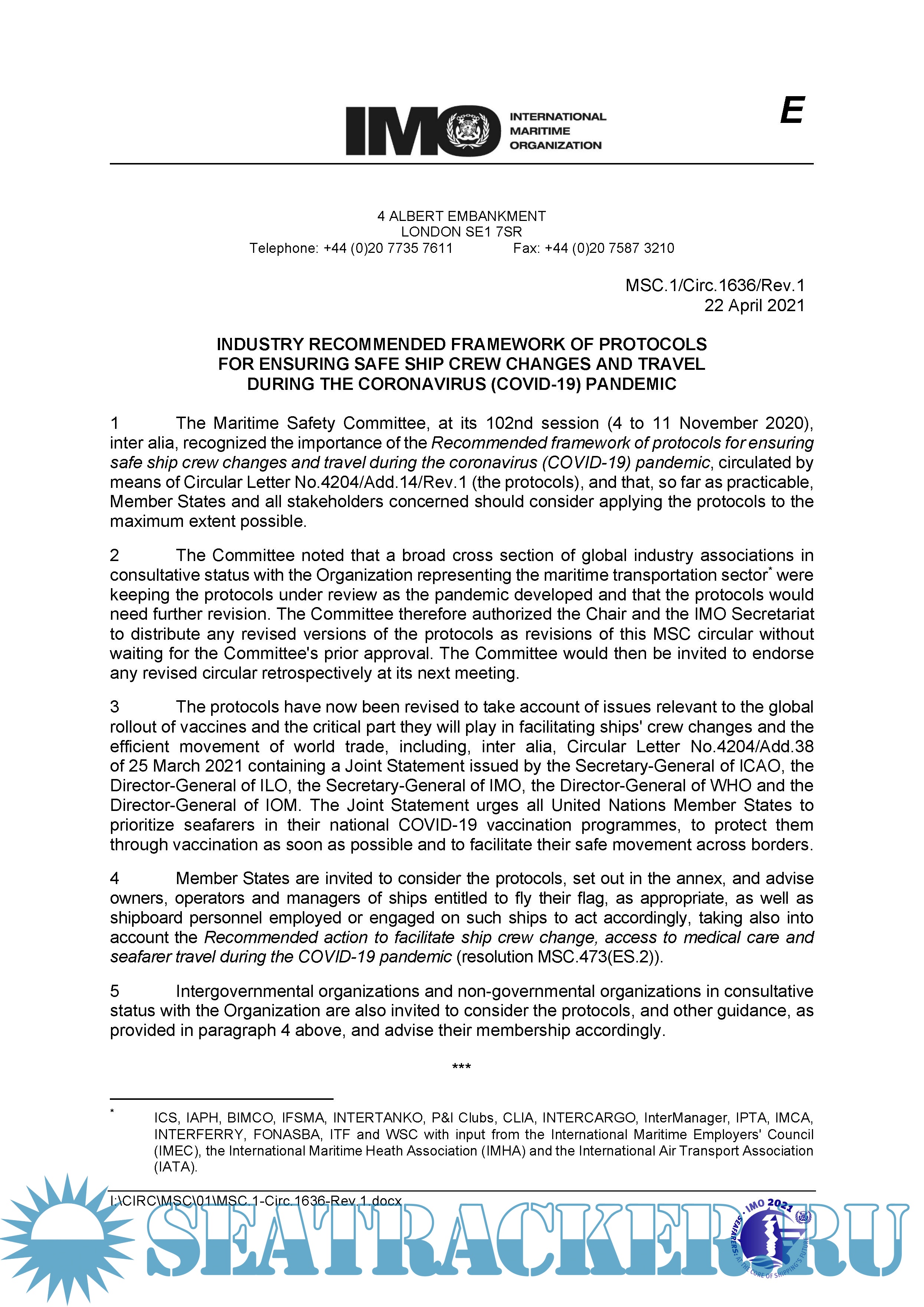The updated guidance in MSC.1/Circ.1636/Rev.1 of 22 April 2021 considers the issues relevant to the global rollout of vaccines and the critical part they will play in facilitating crew changes and the efficient movement of world trade.