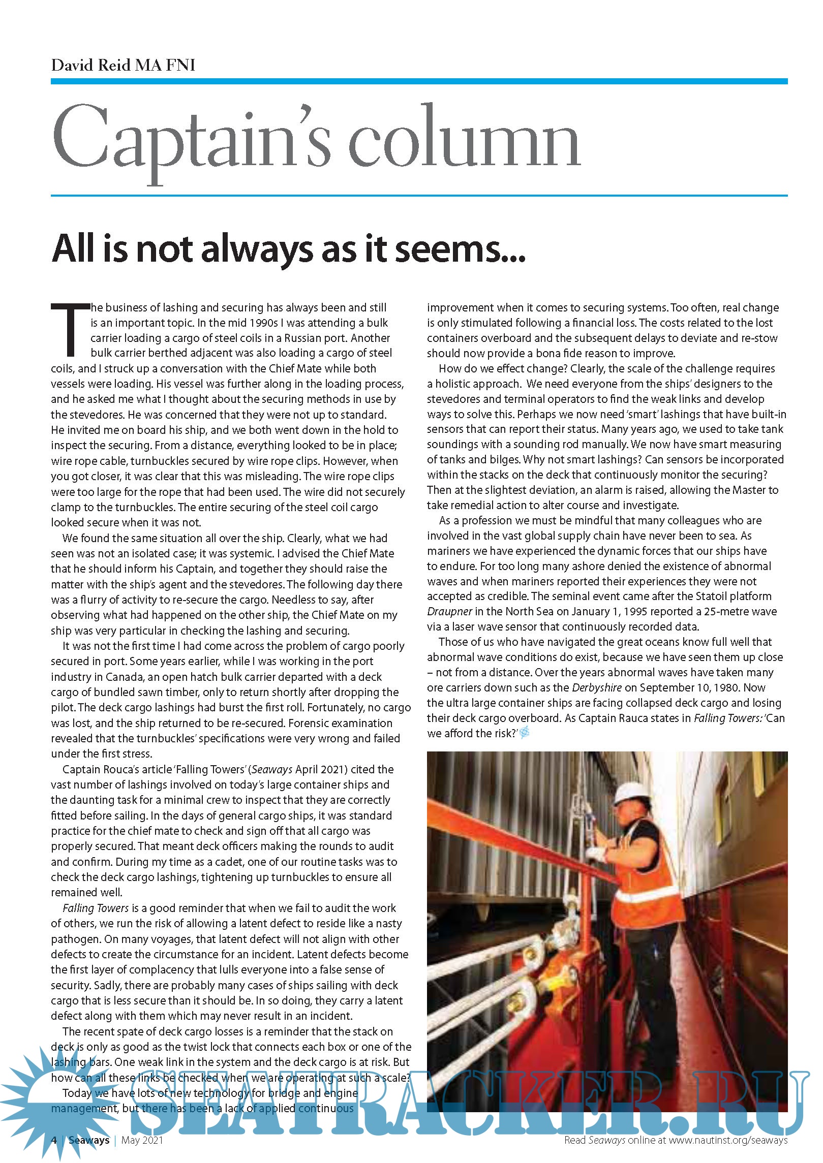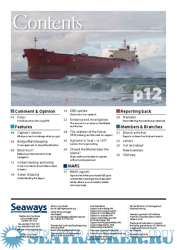 Year: 2021 Language: english Author: The Nautical Institute Genre: Periodical (magazine) Format: PDF Quality: eBook Pages count: 40 Description: Edition May, 2021 Seaways Recognised as one of the leading maritime journals, Seaways is sent out to all members monthly. It is the international journal of The Nautical Institute and has the most vibrant professional correspondence section to be found anywhere in the industry. The vitality of the journal is shared by those who contribute to it and those who read it. It is designed to advance high professional standards and promote fellowship within the profession. This is achieved through contributions and debate directed at a practical level, designed to improve the safe and efficient operation of ships and other maritime ventures.Seaways is the vehicle which links professionals worldwide and enables members to be kept up-to-date with changes in legislation, management and technical procedures, new ideas and books, and announcements. It is also a steadying influence on impractical proposals.
