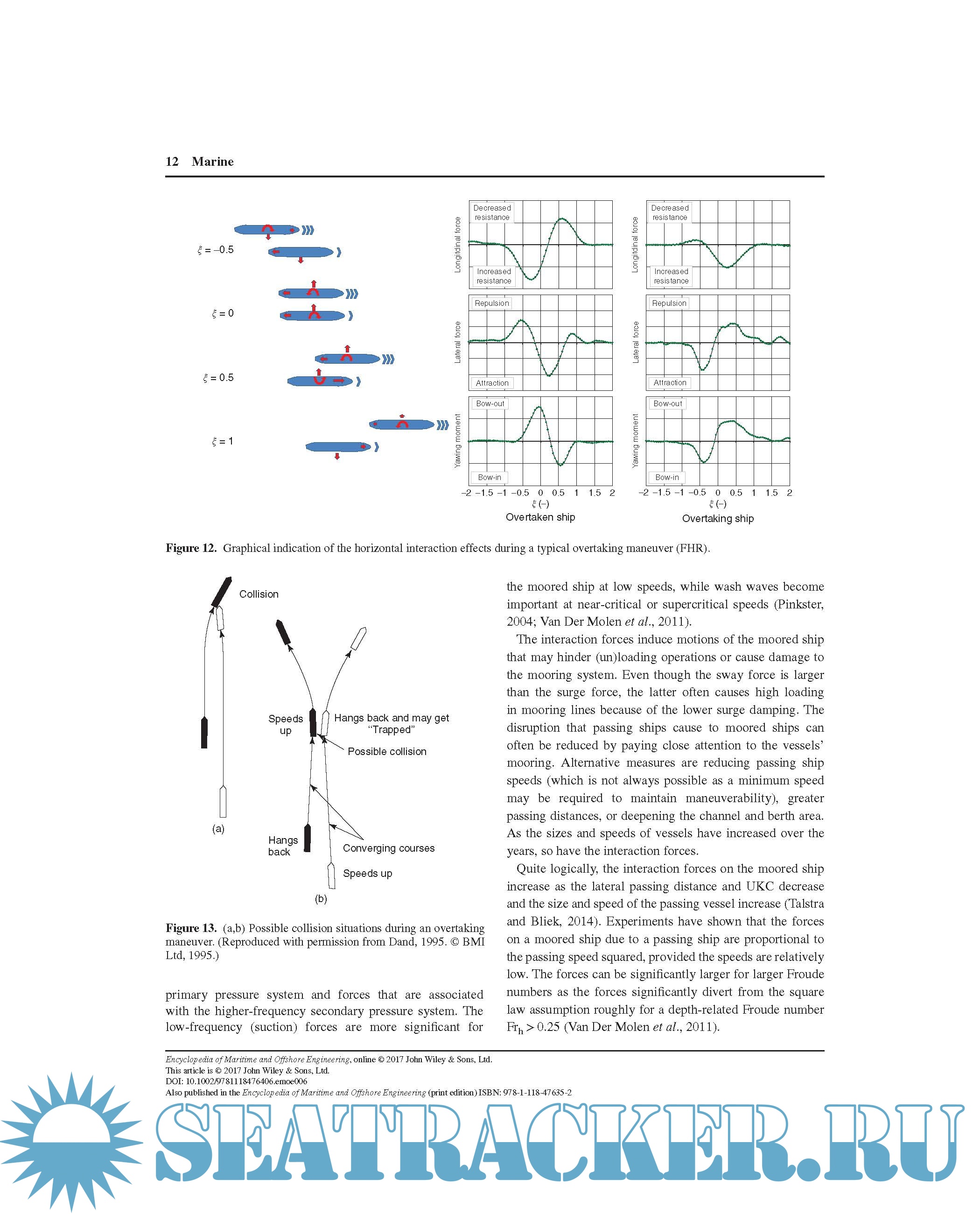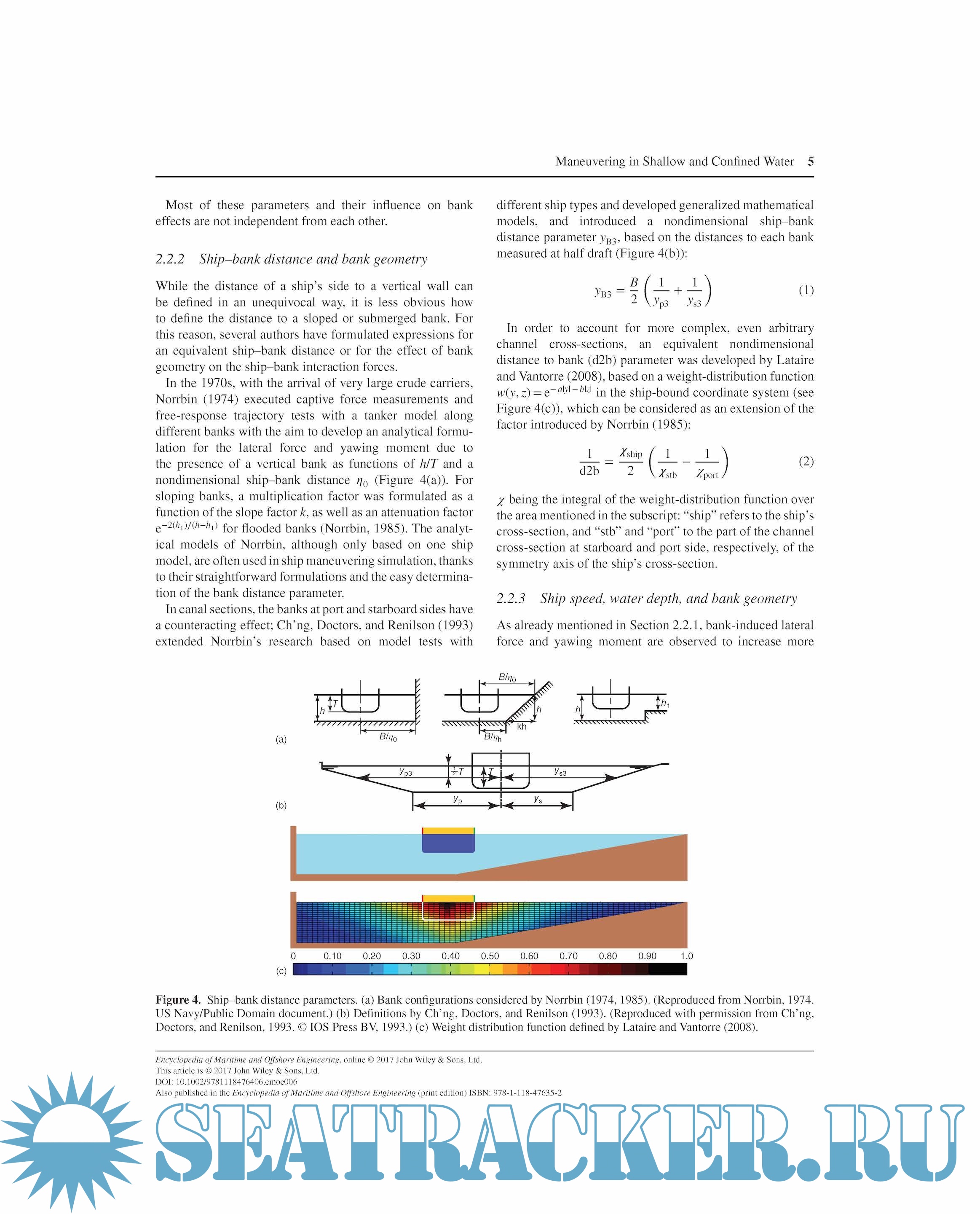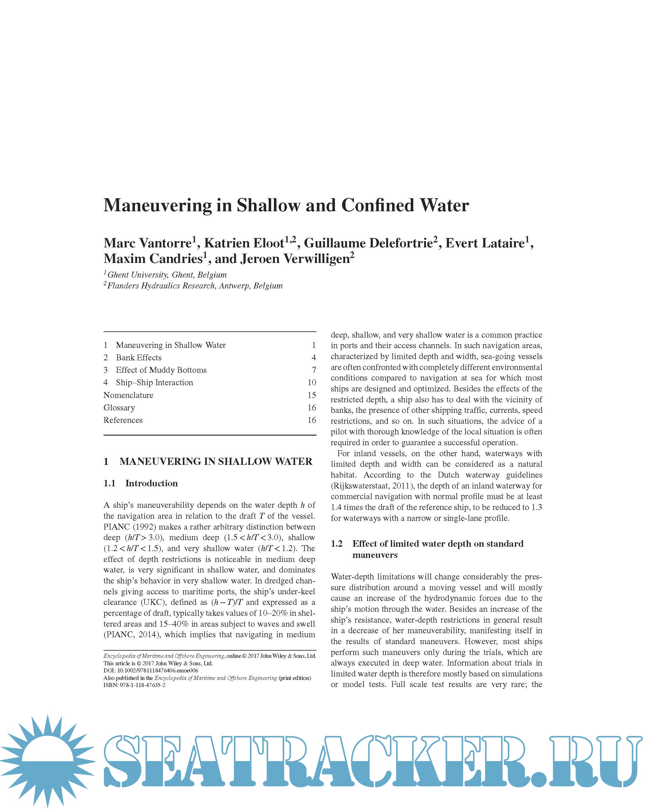 Year: 2017 Language: english Author: Marc Vantorre, Katrien Eloot Format: PDF Quality: eBook Pages count: 18 Description: The maneuvering characteristics are highly affected by the under‐keel clearance. In shallow water, the results of standard maneuvers reveal a decreased maneuverability and an increased straight‐line stability. This modified behavior is mainly to be ascribed to the modified flow around the hull, but also the control forces exerted by rudder and propeller are different compared to the deep‐water case. Besides the effect of vertical limitations, a ship navigating parallel to the horizontal boundaries of navigation areas will also experience the so‐called bank effects, that is, disturbing forces and moments due to the asymmetry of the flow around the hull.