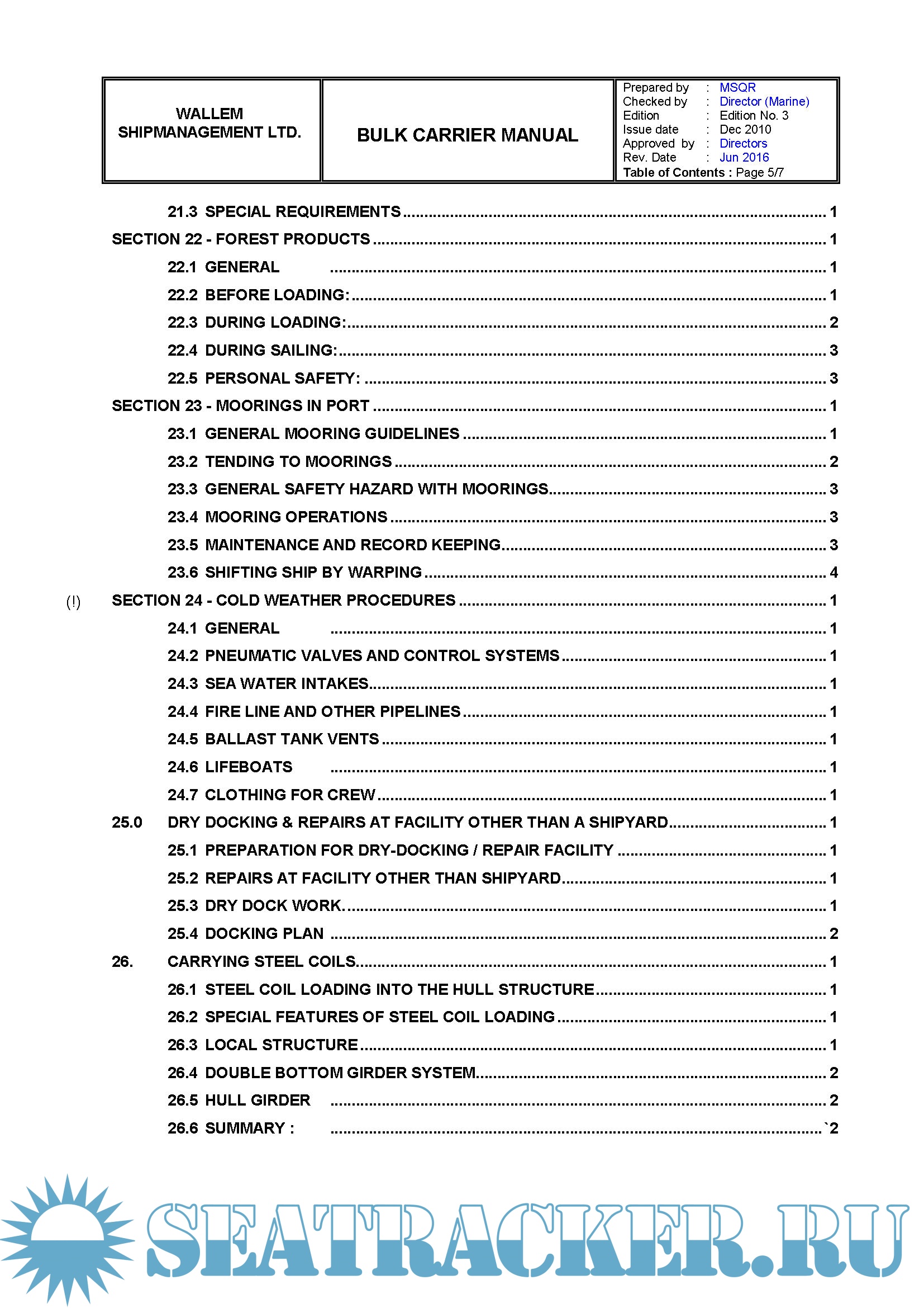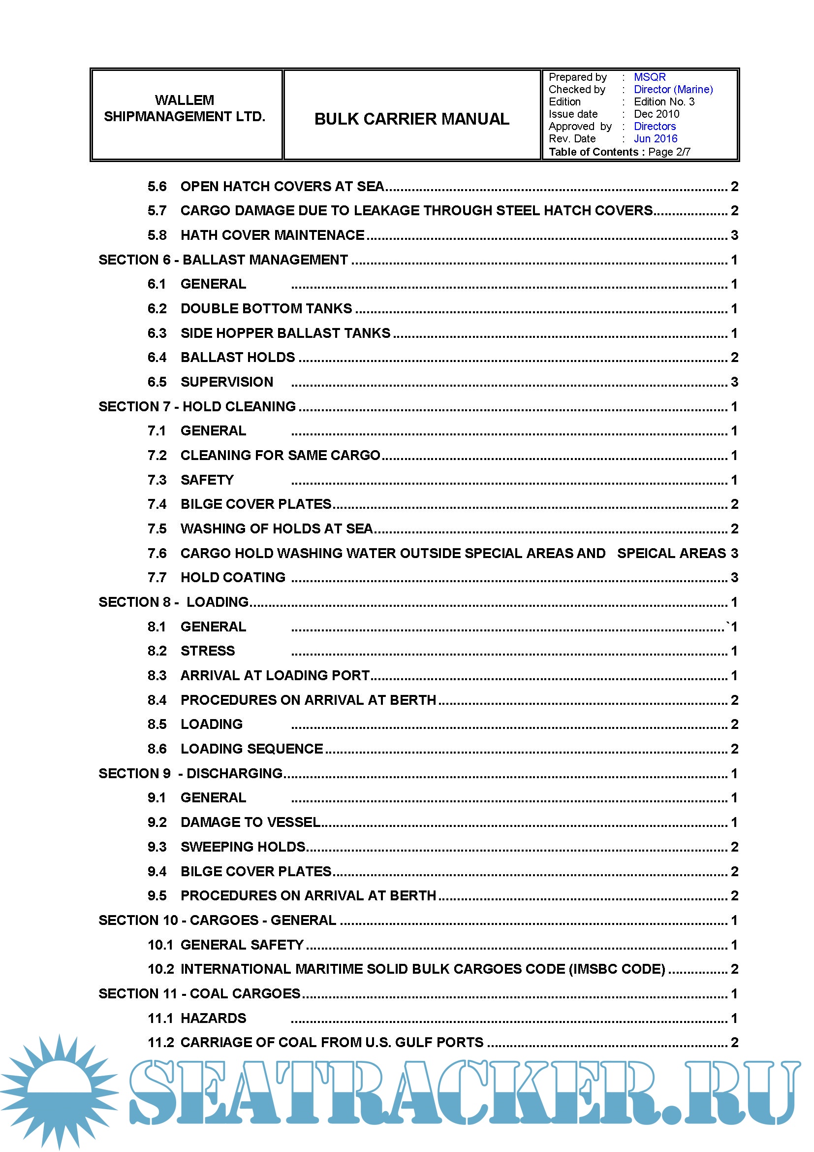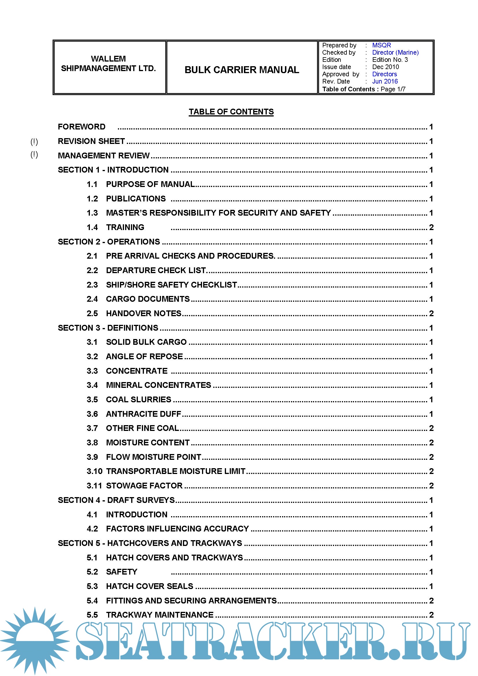 This Manual details the policies and measures adopted by the Company for safe and efficient operation of Bulk Carriers under its management and control.