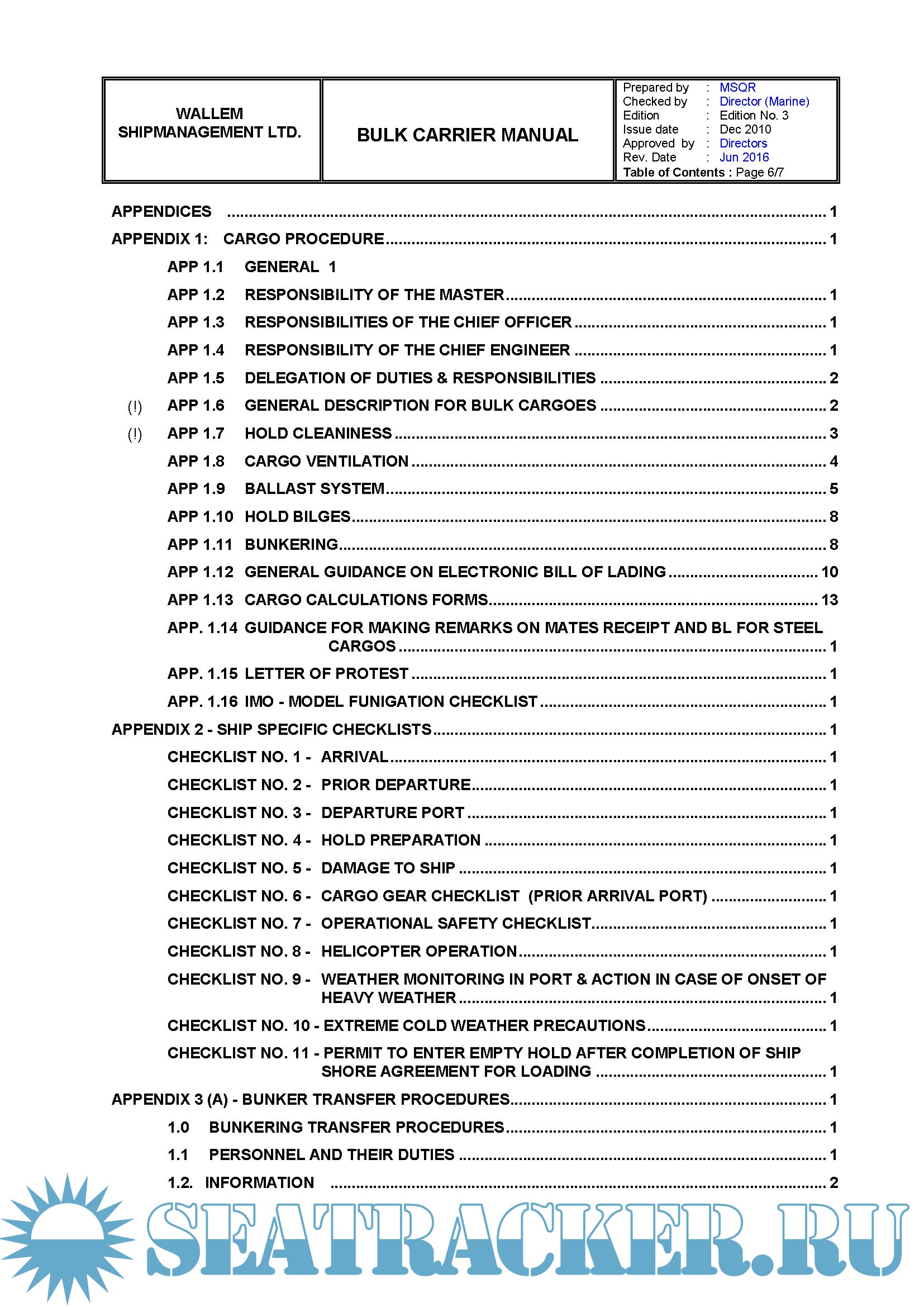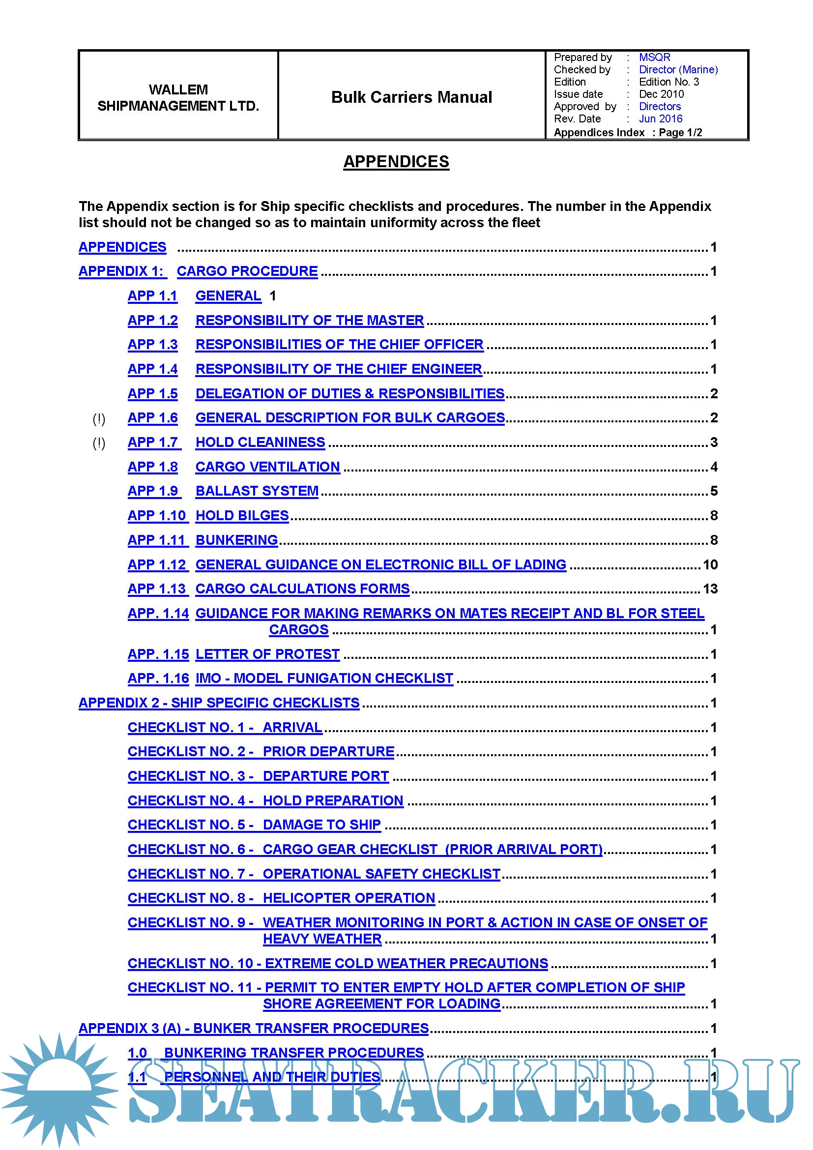 Description: The purpose of this manual is to provide guidance to the Master, Officers and approriate ratings on the procedures to be followed on board a bulk carrier in order to attain safe and efficient Bulk Carrier Operations.