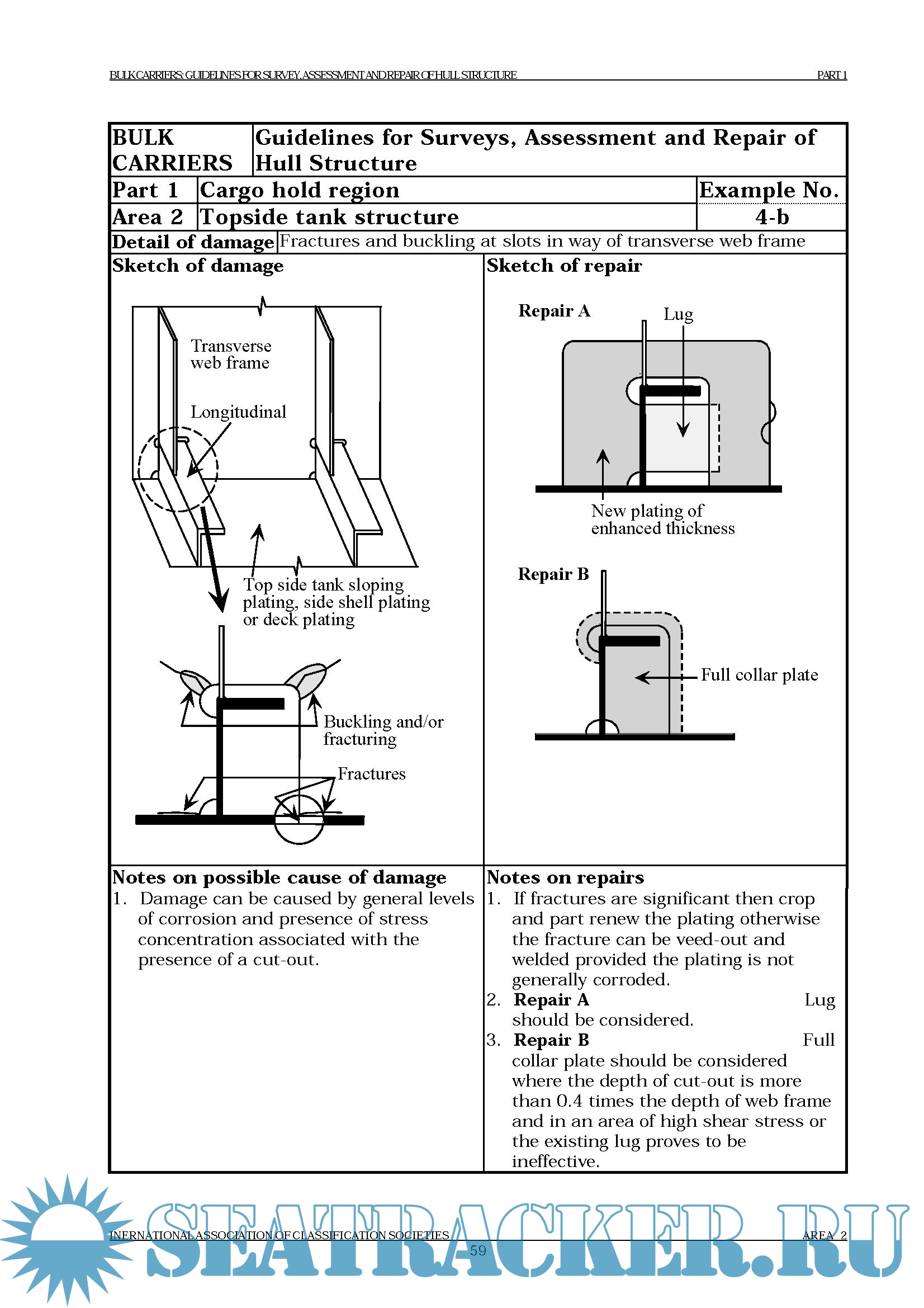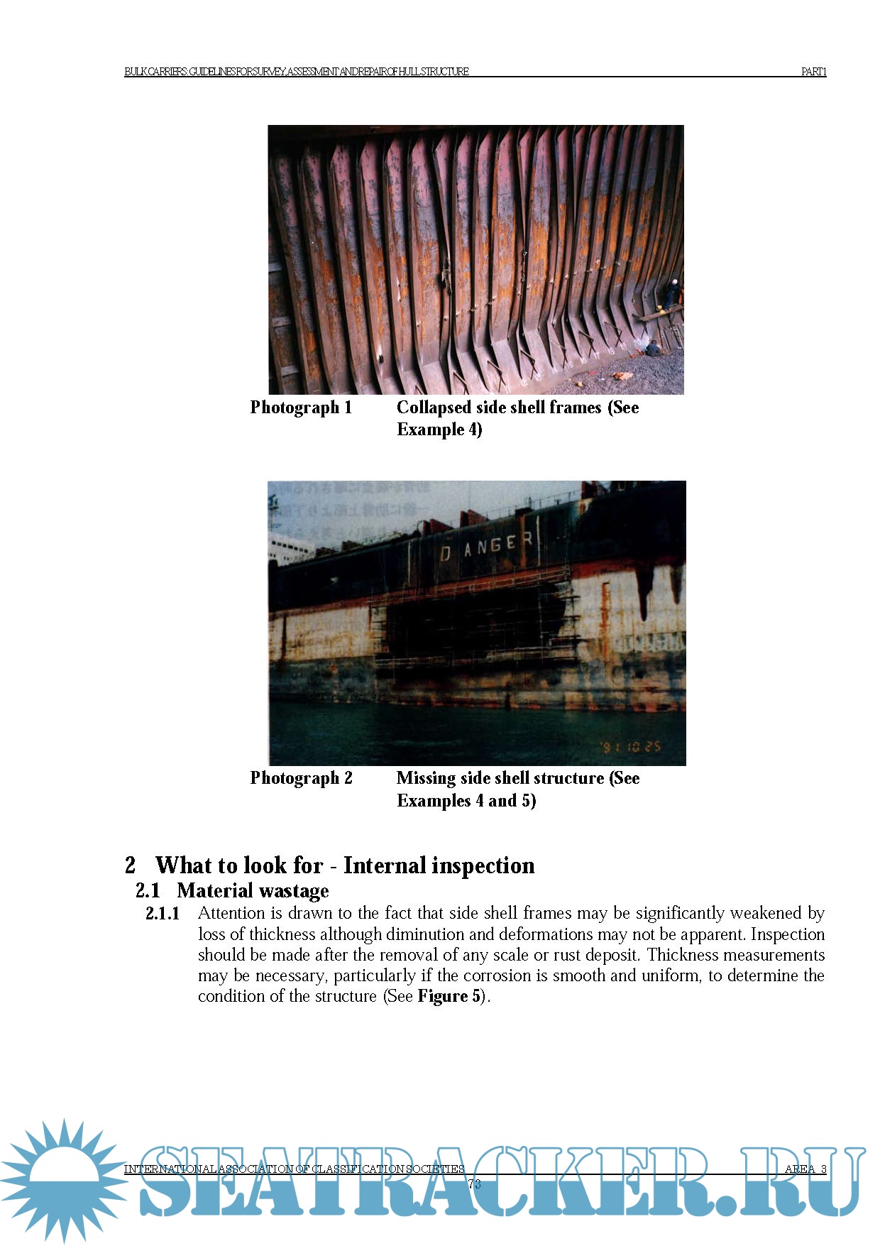 Chapter 1: Introduction Chapter 2: Class Survey Requirements 2.1 General 2.2 Annual surveys 2.3 Intermediate surveys 2.4 Special surveys 2.5 Drydocking (Bottom) surveys 2.6 Damage and repair surveys Chapter 3: Technical Background for Surveys 3.1 General 3.2 Definitions 3.3 Structural damages and deterioration 3.4 Structural detail failures and repairs 3.5 IACS Early Warning Scheme (EWS) for reporting of significant hull damage Chapter 4: Survey Planning, Preparation and Execution 4.1 General 4.2 Survey programme 4.3 Principle for planning document 4.4 Conditions for survey 4.5 Access arrangement and safety 4.6 Personal equipment 4.7 Thickness measurement and fracture detection 4.8 Survey at sea or at anchorage 4.9 Documentation on board Chapter 5: Structural Detail Failures and Repairs 5.1 General 5.2 Catalogue of structural detail failures and repairs .