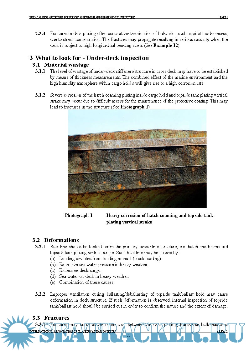 Year: 2007 Language: english Author: IACS Format: PDF Quality: eBook Pages count: 181 Description: These guidelines focus on IACS Member Societies' survey preparation guidelines and concentrate on bulk carrier ships that carry dry cargo, including ore, in bulk. The book provides an outline of survey planning, preparation and execution (including Class requirements and technical background), as well as examples of structural deterioration and damage related to each structural area, demonstrating what to be aware of as well as possible causes and repair methods. Published Date: Corr 1. September 2007