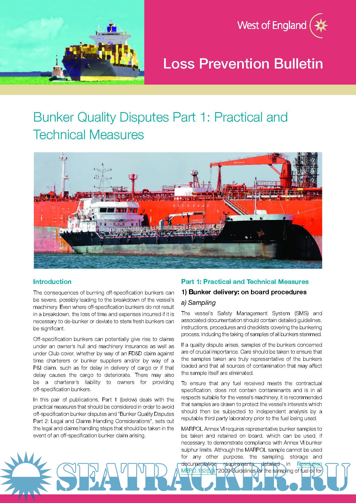 Description: When a vessel has been provided with off-specification bunkers the consequences can be severe, possibly leading to the breakdown of the vessel’s machinery. Even if off-specification bunkers do not result in a breakdown, the loss of time and expenses incurred if it is necessary to de-bunker or deviate to stem fresh bunkers can be significant.