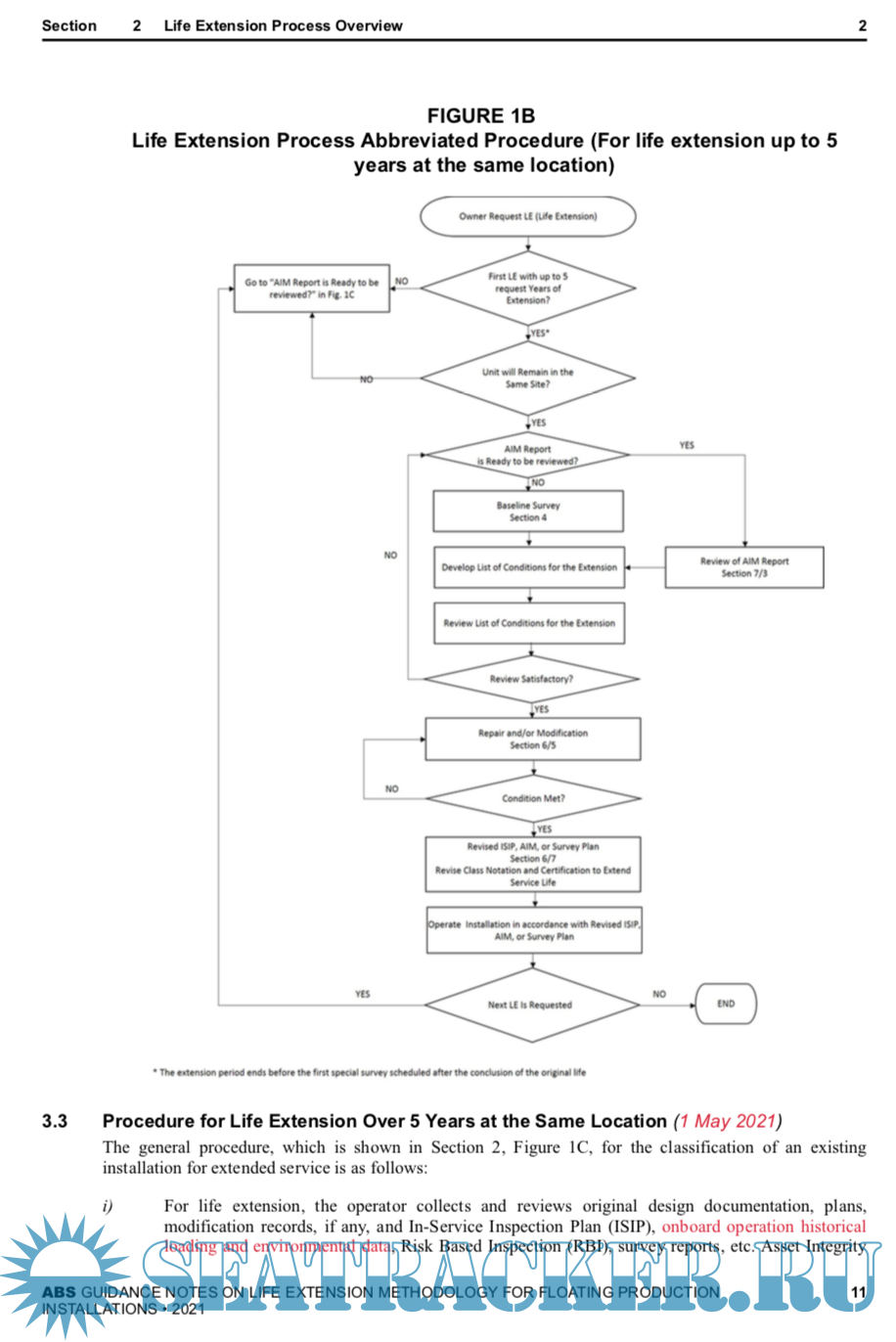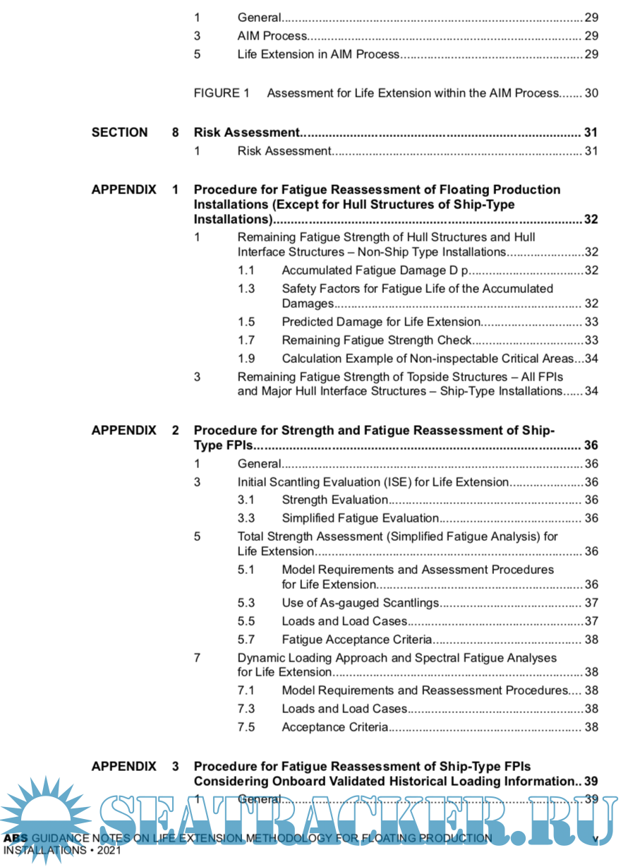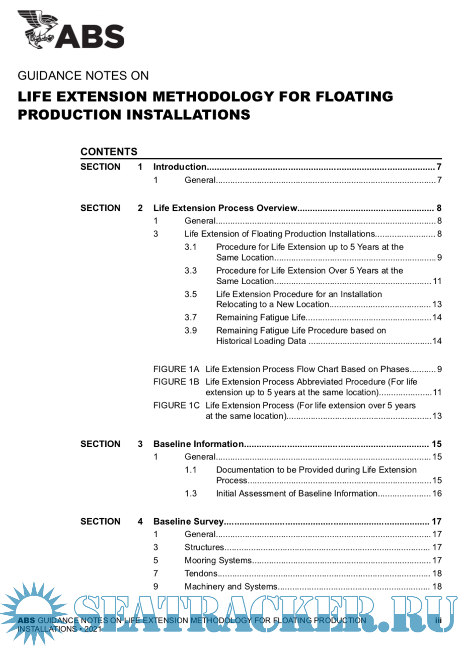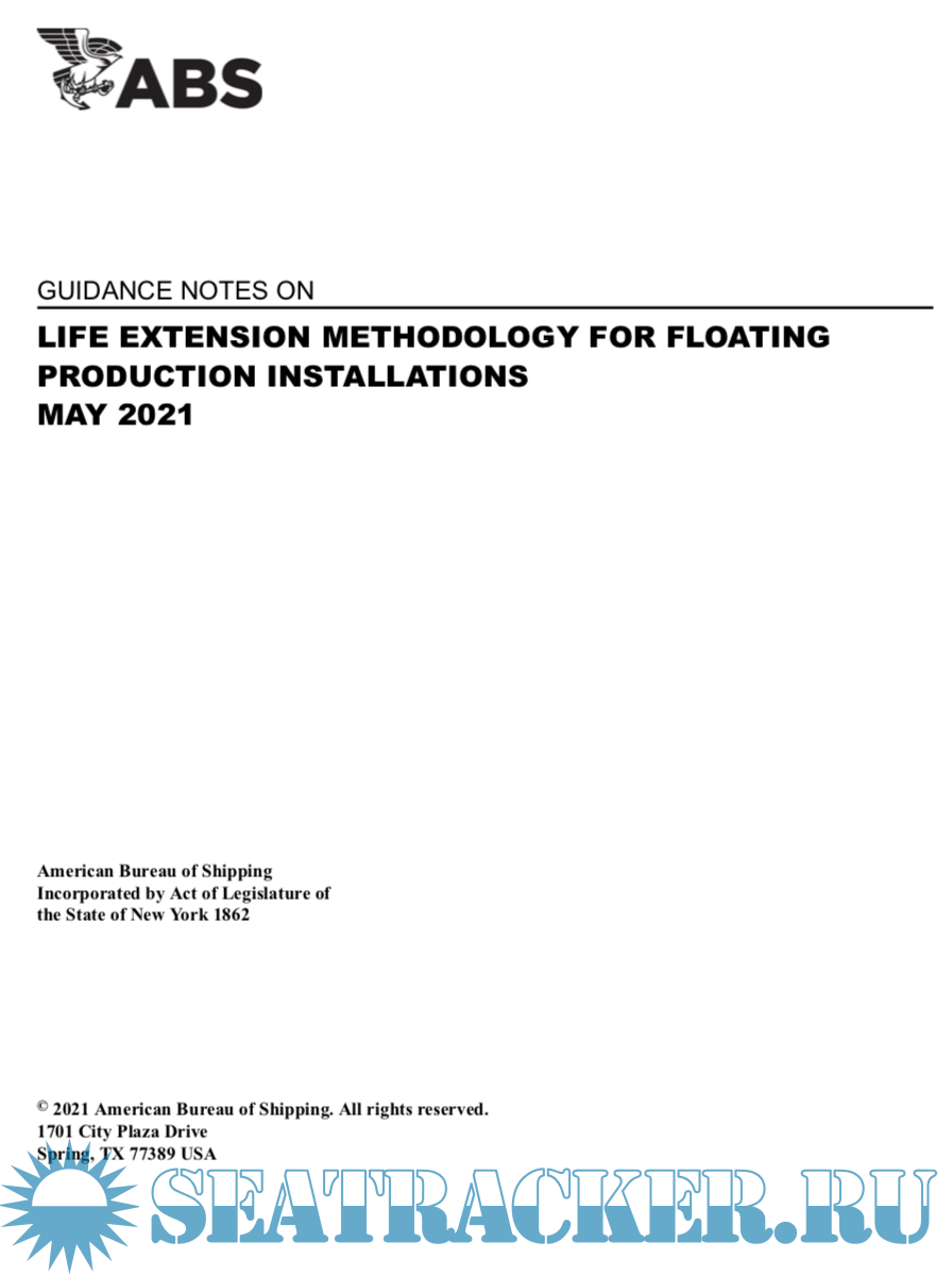 Year: 2021 Language: english Author: ABS Genre: Methodological guide Publisher: ABS Format: PDF Quality: eBook Pages count: 51 Description: The Guidance Notes on Life Extension Methodology for Floating Production Installations have been developed to provide guidance for assessment of existing floating production installations when the intended period of operation at the original site or the cumulated operating time at both the original and relocated sites is extended beyond the original design life period. These Guidance Notes supplement the requirements for life extension and relocation of floating production installations in accordance with the ABS Rules for Building and Classing Floating Production Installations (FPI Rules). These Guidance Notes outline the life extension process that includes a reassessment of the structure, mooring system, stability, and machinery and systems, etc., for the entire installation. This reassessment includes engineering and survey activities. In the May 2021 edition, a new Appendix 3 introduces a methodology for addressing Remaining Fatigue Life for FPSOs based on Loading Historical Data acquired on board during the vessel’s Service Life. These Guidance Notes become effective on the first day of the month of publication.