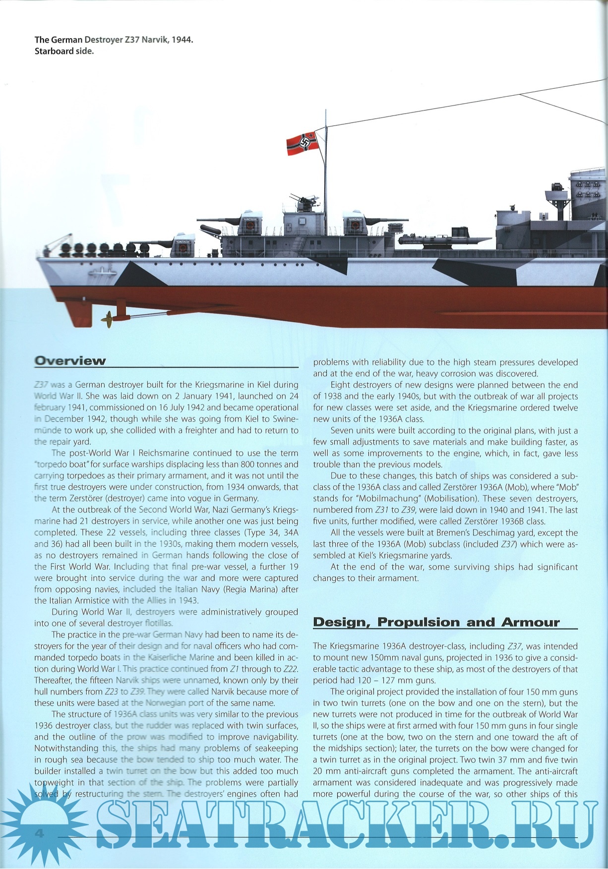 Description: Z37 was a German destroyer built for the Kriegsmarine in Kiel during World War II. She was laid down on 2 January 1941, launched on 24 February 1941, commissioned on 16 July 1942 and became operational in December 1942, though while she was going from Kiel to Swinemünde to work up, she collided with a freighter and had to return to the repair yard.