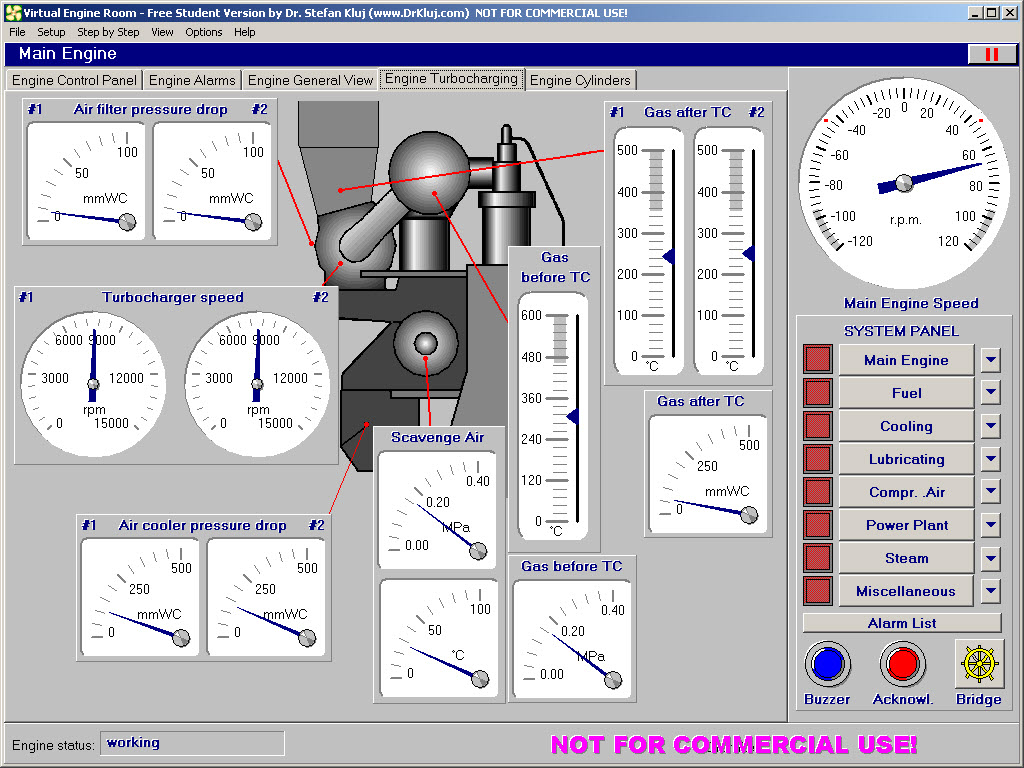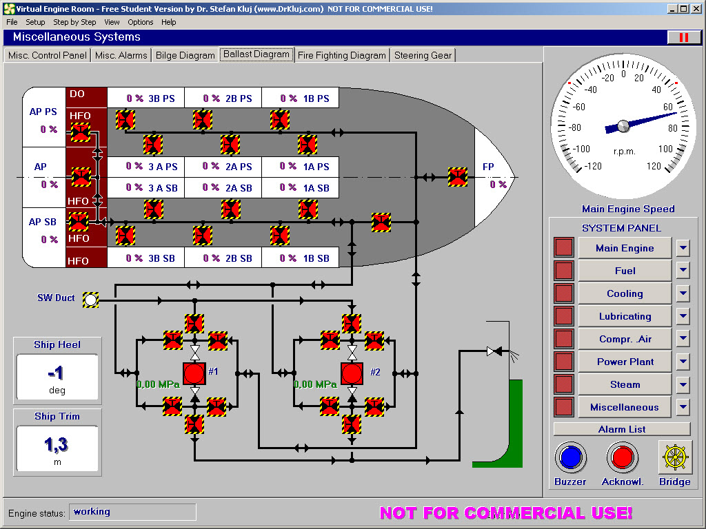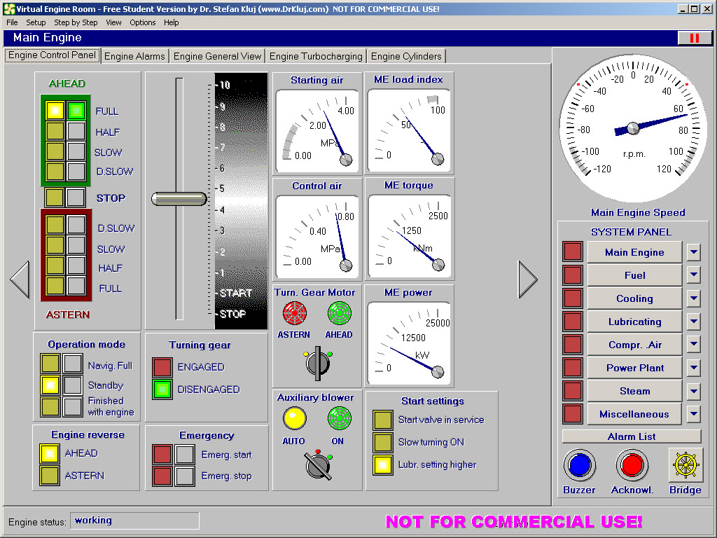 Virtual Engine Room Student - Бесплатная версия, которая включает в себя подробную пошаговую инструкцию, которая поможет пользователю при работе с программой. Выполнение команды может быть остановлено в любое время, но полученные результаты (по состоянию машинного отделения) не могут быть сохранены для будущего продолжения.