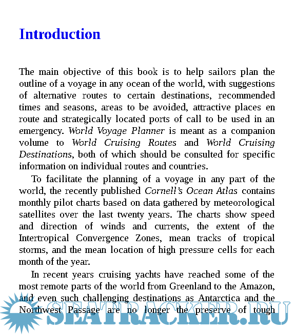 Year: 2012 Language: english Author: Jimmy Cornell Genre: Guide Publisher: Adlard Coles Nautical Edition: First ISBN: 978-1-4081-5631-5 Format: EPUB Quality: eBook Pages count: 1150 Description: Planning a voyage from anywhere in the world to anywhere in the world. This book is not only a valuable tool for sailors planing a voyage but it should appeal also to those who are still at the dreaming stage, in spirit already roaming the oceans. Cornell weighs up the pros and cons of various routes in every ocean, whether a one-way or round trip. All this in a style that comes obviously from the pen of a professional with great personal experience. This book provides more than just knowhow: it entertains and is pure enjoyment. In one word: it makes you want to go, and this is what makes Jimmy Cornell’s book so special.