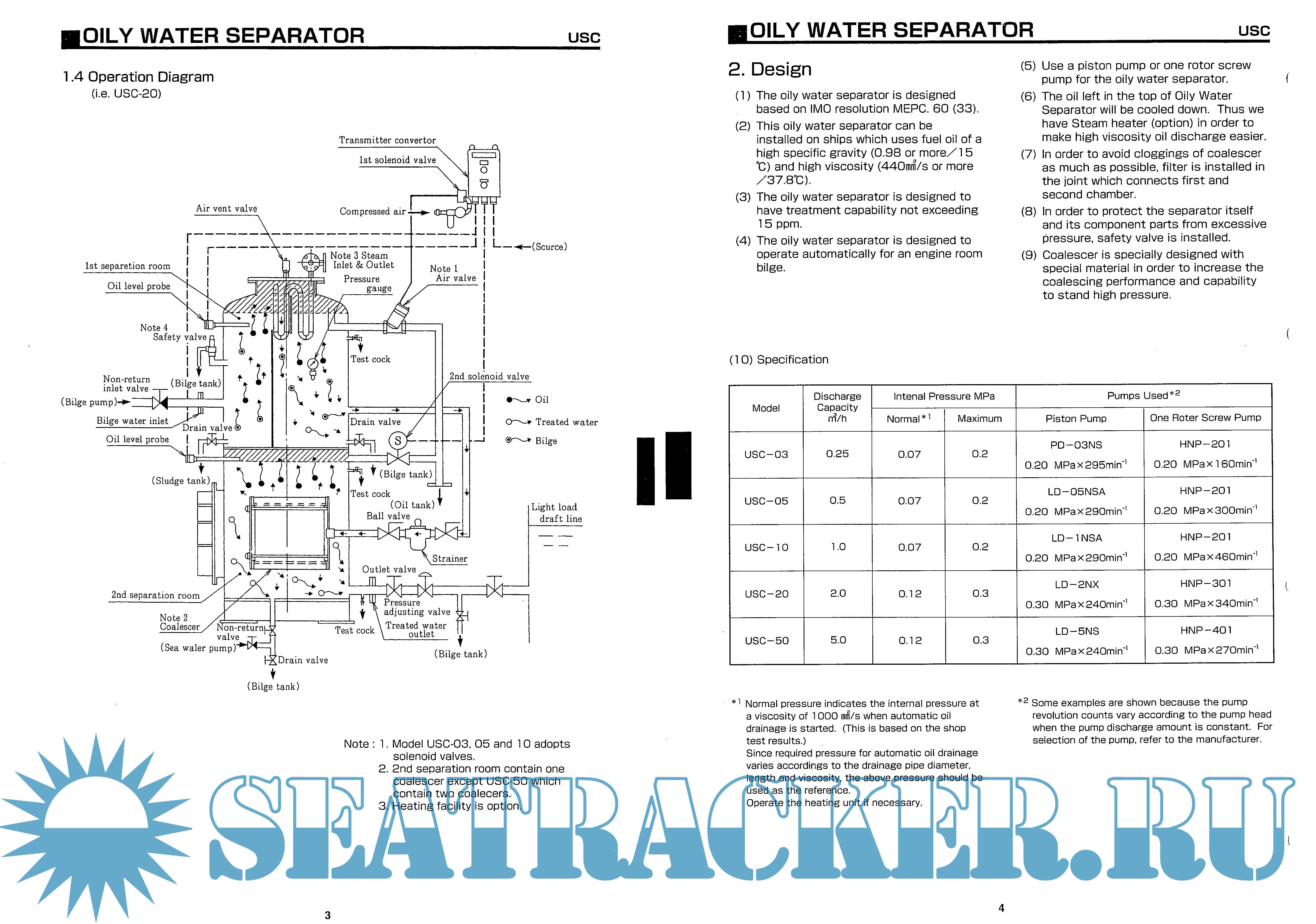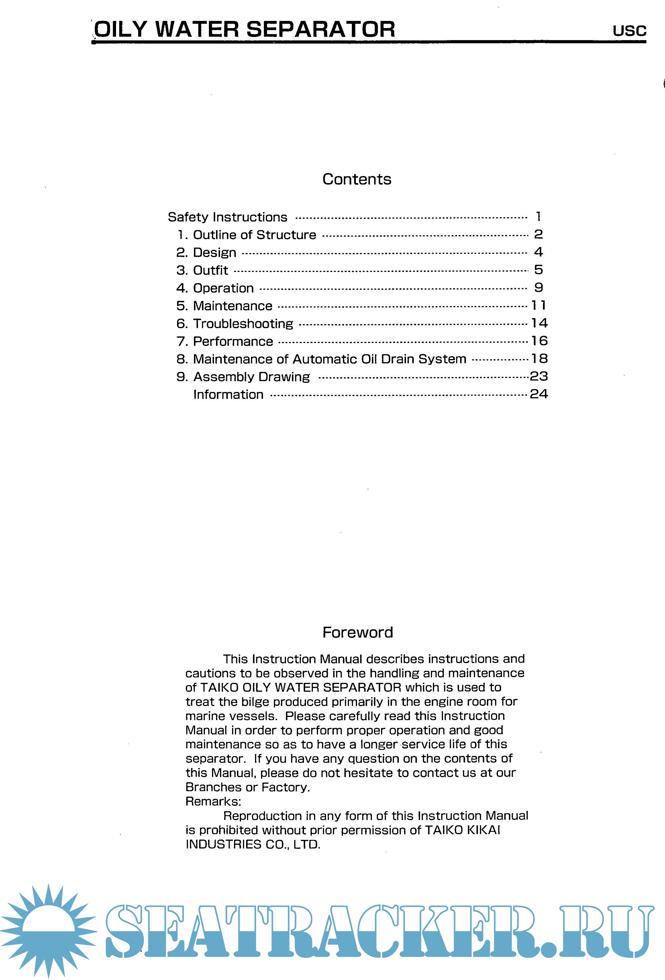 Description: This Instruction Manual describes instructions and cautions to be observed in the handling and maintenance of TAIKO OILY WATER SEPARATOR which is used to treat the bilge produced primarily in the engine room for marine vessels. Please carefully read this Instruction Manual in order to perform proper operation and good maintenance so as to have a longer service life of this separator.