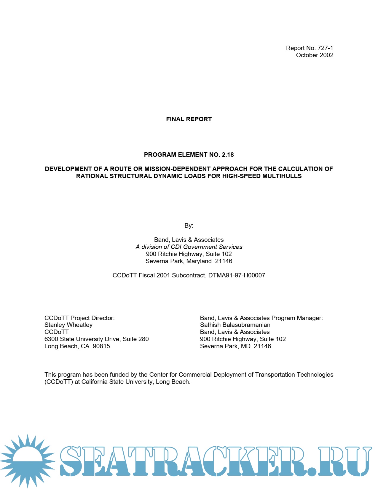 Description: This report describes the development of A route or mission-dependent approach for the calculation of rsdls for high-speed multihulls. The work was prepared by Band, Lavis and Associates under subcontract to the Center for Commercial Deployment of Transportation Technologies. The principal contributors to this work were Andrew Eisele, Manish Gupta and Mark McCain.