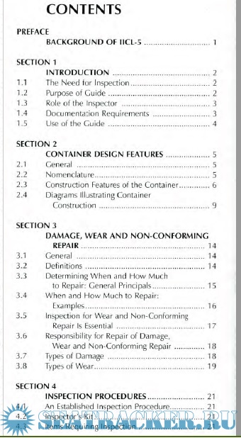 Year: 2006 Language: english Author: The Institute of International Container Genre: Technical book Publisher: The Institute of International Container Edition: 5th ISBN: 9999335748 Format: PDF Quality: Scanned pages Pages count: 173 Description: Provides criteria for determining if damage to containers requires repair. Includes updates and harmonization of several inspection criteria and processes that have developed over recent years. Benefits of the IICL 5 standard also include simplification and efficiency improvement of procedures for container inspections performed at container depots around the world.