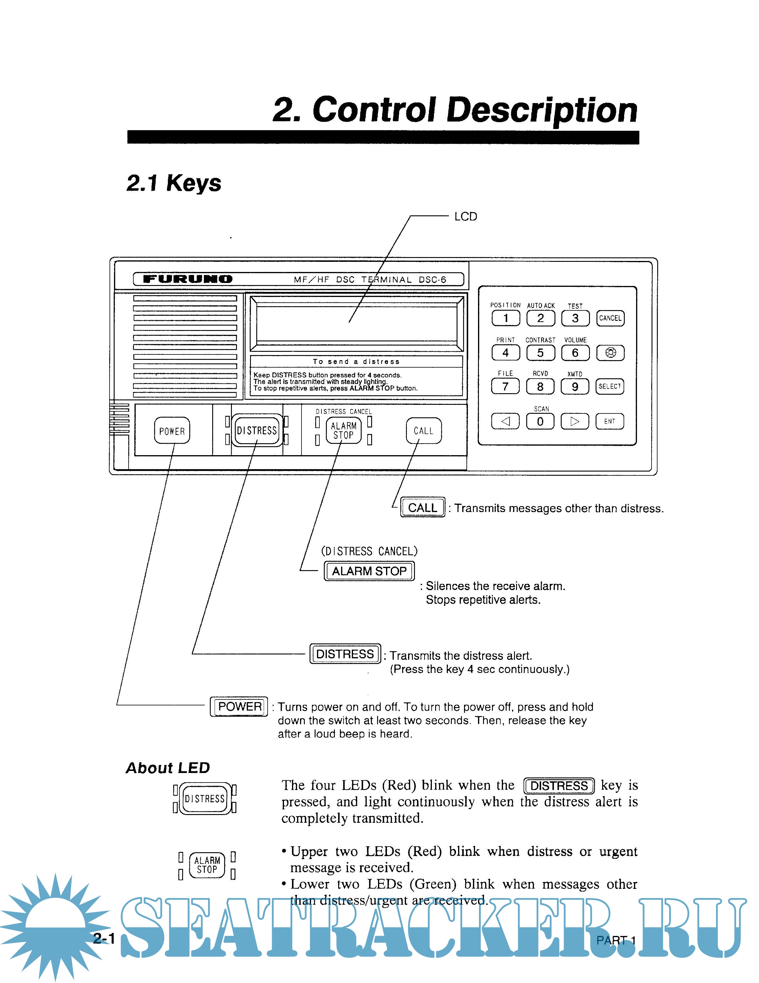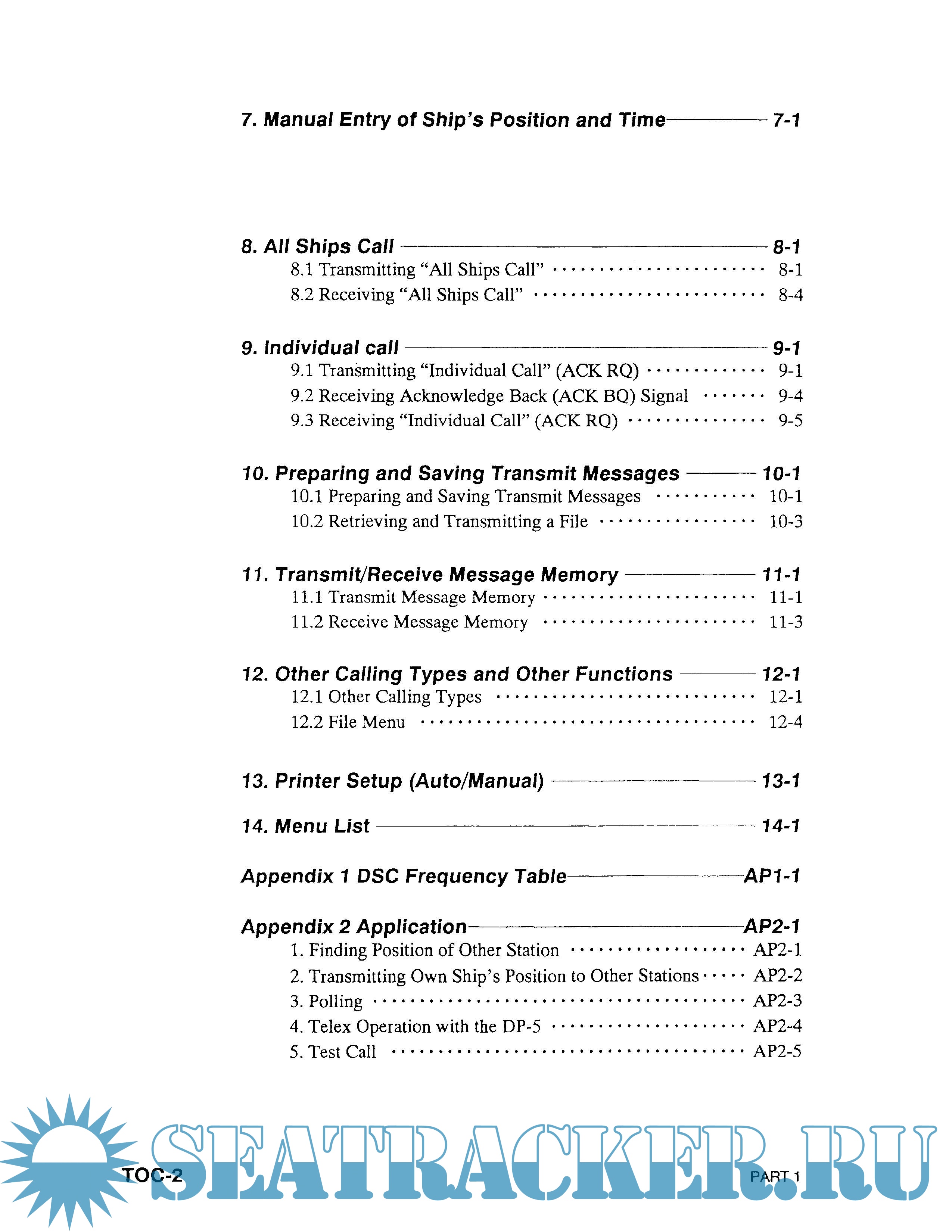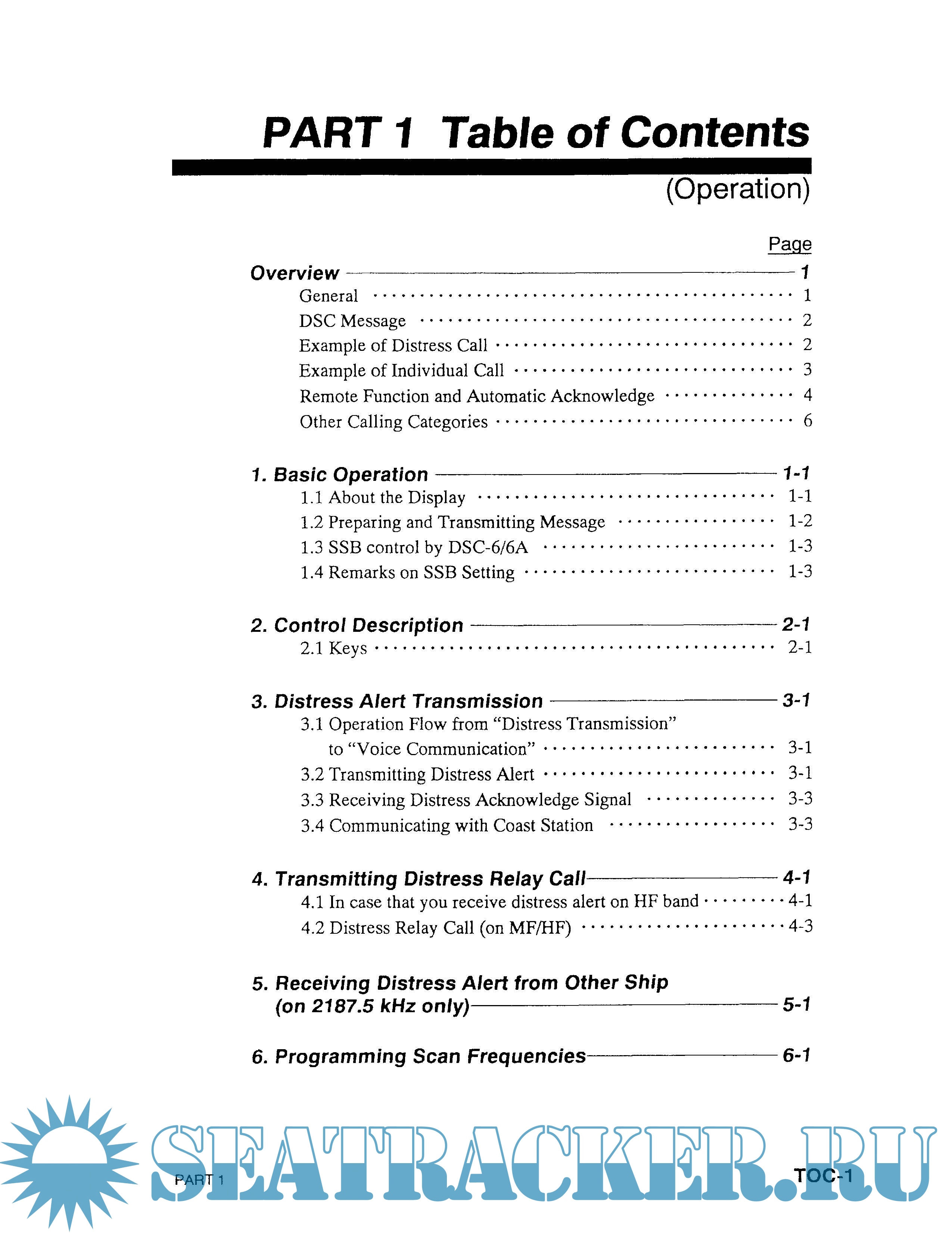 Year: 1994 Language: english Author: FURUNO Genre: Manual Publisher: FURUNO Format: PDF Quality: Scanned pages Pages count: 2 + 32*2 + 79*2 Description: The FURUNO DSC-6/6A DSC Terminal provides the full range of distress and general calls on MF/HF bands, in full compliance with GMDSS requirements for class A DSC terminals. This manual mainly consists of two pans: PART 1, Operation, and PAR T 2, Maintenance. PART 1 provides operating information. For sake of easy understanding, instruction is arranged by type of operation. Once you become acquainted with the basic rules of operation, the function and logical layout of the DSC-6/6A man-to-machine dialogue will become more apparent. Therefore, please read “Overview" and “1. Basic Operation" to acquaint yourself with the basics of this unit. This part contains the information necessary for conducting checks of the equipment. If you think something is wrong with the unit, refer to this part.