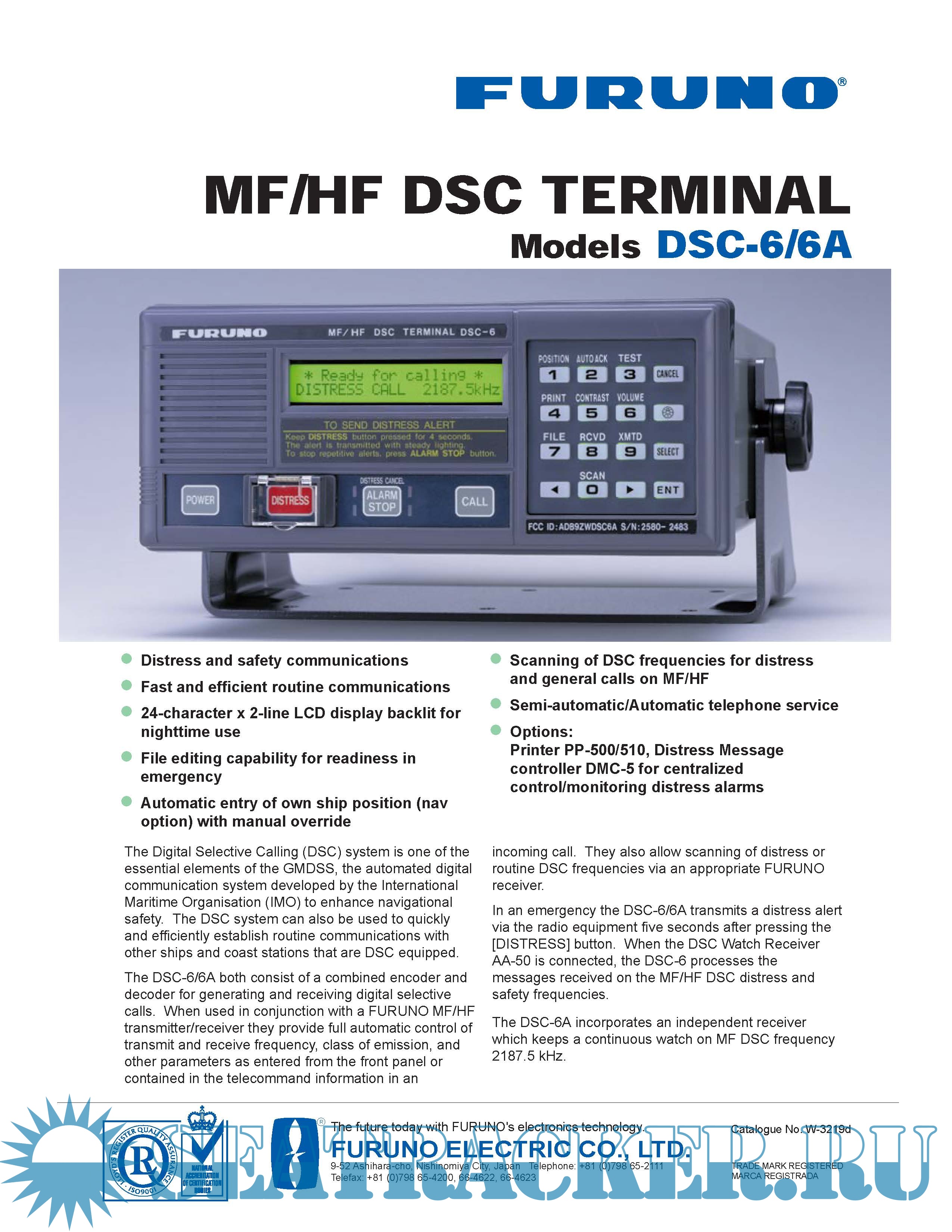 Description: The FURUNO DSC-6/6A DSC Terminal provides the full range of distress and general calls on MF/HF bands, in full compliance with GMDSS requirements for class A DSC terminals.