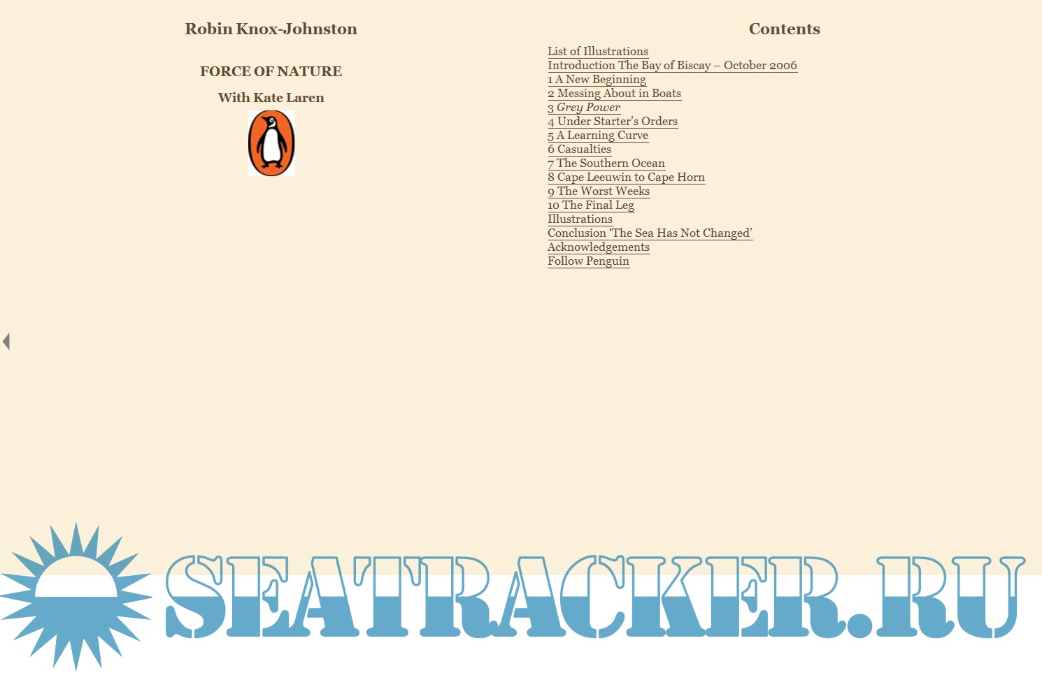 Description: In January 1969, aboard his home-built wooden boat Suhaili, Sir Robin Knox-Johnston became the first person ever to sail solo, non-stop around the world. 25 years later, Sir Robin again completed a record-breaking circumnavigation, co-skippering Enza with Kiwi yachting legend Sir Peter Blake. His place in sailing's pantheon of greats was assured. Then, after the tragic death of his wife Sue, Sir Robin decided he would try again. In October 2006, at the age of 67 - when most people are settling in to a well-earned retirement - Sir Robin embarked on another gruelling single-handed race around the world. Compared to his rivals he lacked recent experience and a large shore-based support team. There were some who believed that this time he might have bitten off more than he could chew. Then early on, it looked like their worst fears might be realised.Within days of setting off, near-Hurricane-strength storms in the Bay of Biscay capsized his 60' yacht Saga Insurance. But it wasn't just Sir Robin who suffered. Three-quarters of the entire fleet had to run for shelter. When they re-emerged, all faced months of hardship and intensity ahead. "Force of Nature" is Sir Robin's first-hand account his extraordinary return to the ultra-competitive, punishing world of single-handed offshore racing. It turned out to be a very different journey to the one he undertook about Suhaili, yet his experience aboard her remains a touchstone throughout this story. It's a story of courage, ingenuity and resilience played out against the World's oceans. But most of all it's a powerful reminder that age is nothing but a number; no barrier to realizing one's dreams.