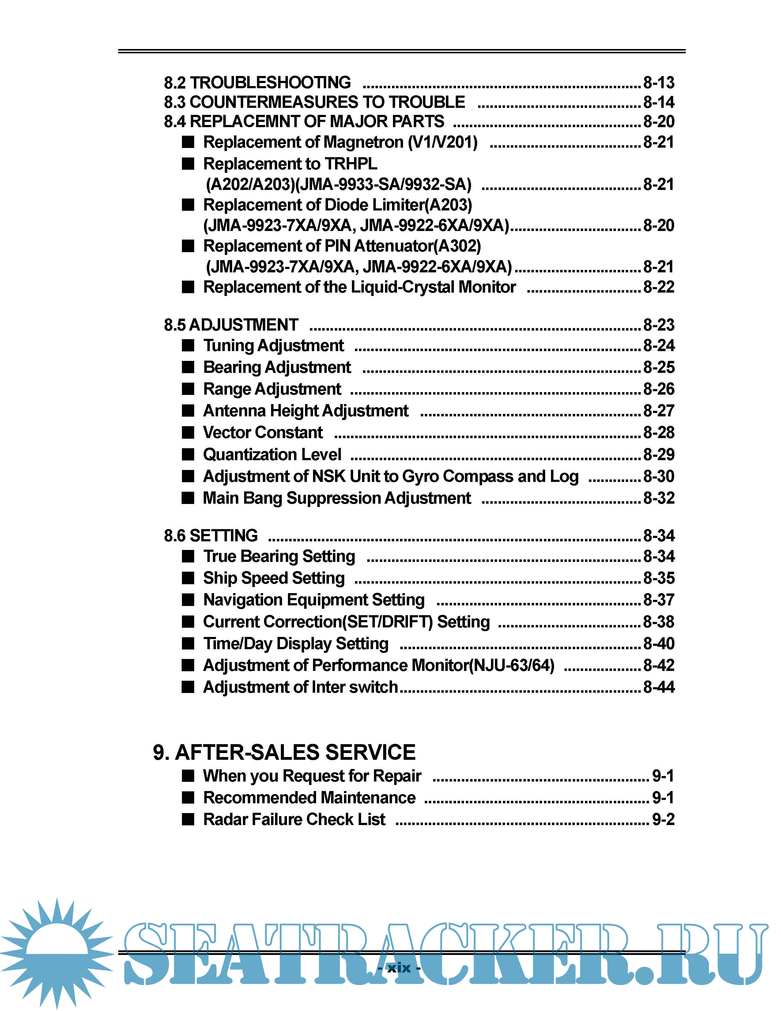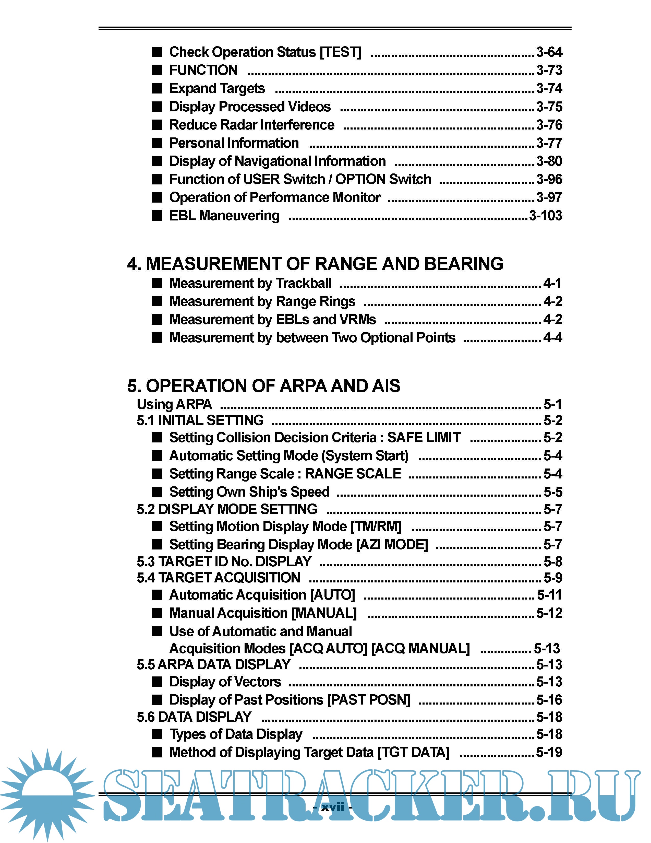 Year: 200X Language: english Author: JRC Genre: Manual Publisher: JRC Format: PDF Quality: Scanned pages Pages count: 404 Description: This equipment is a marine radar equipment designed to obtain safe operation of marine ships. This equipment consists of a radar signal transmitter-receiver unit, a CRT display unit and a scanner unit as its main units. • Before operating the equipment, be sure to read this instruction manual carefully for correct operation. • Maintain this instruction manual so that operators can refer to it at any time. • Refer to this manual when any inconvenience or defect occur.