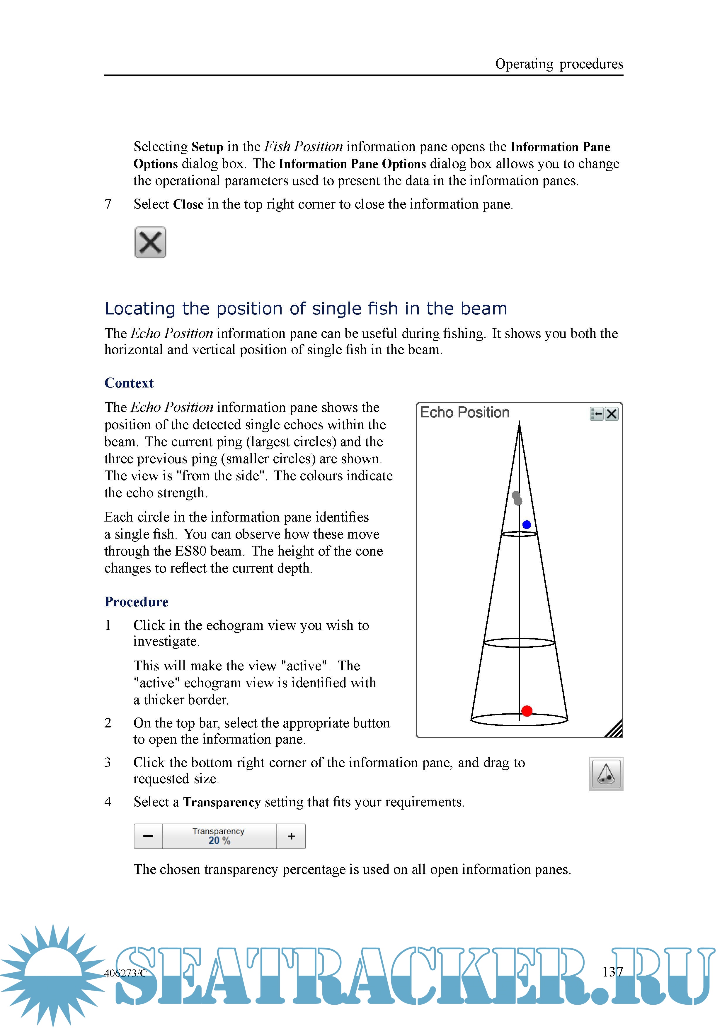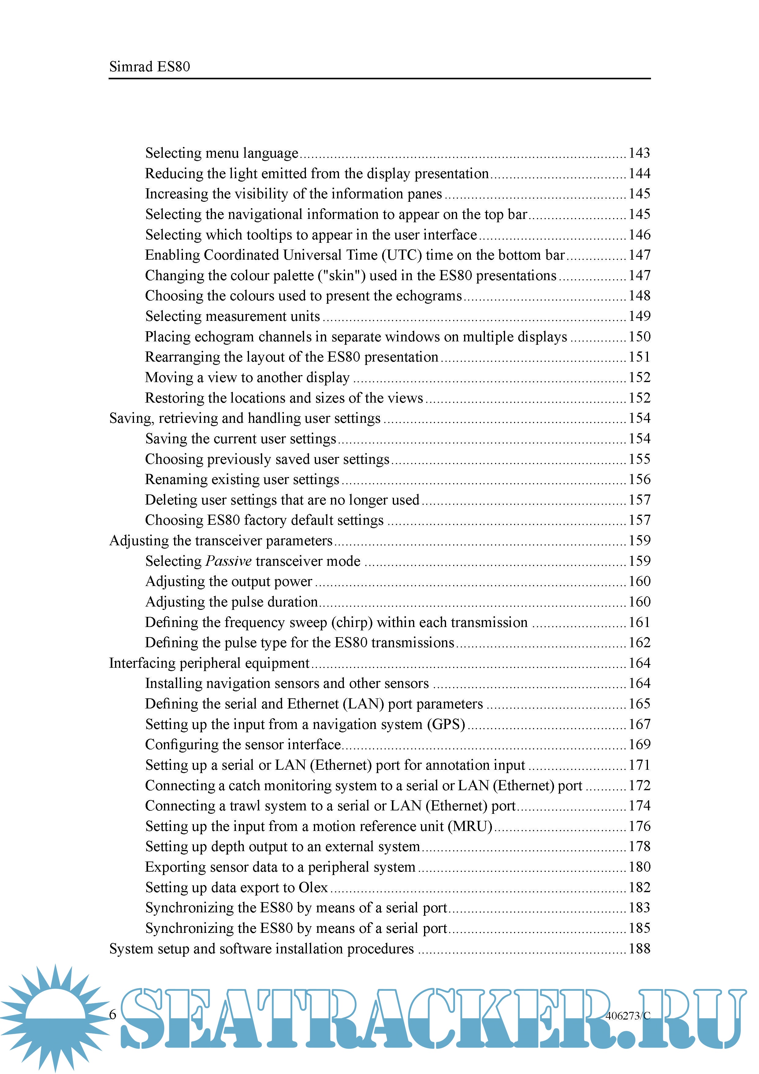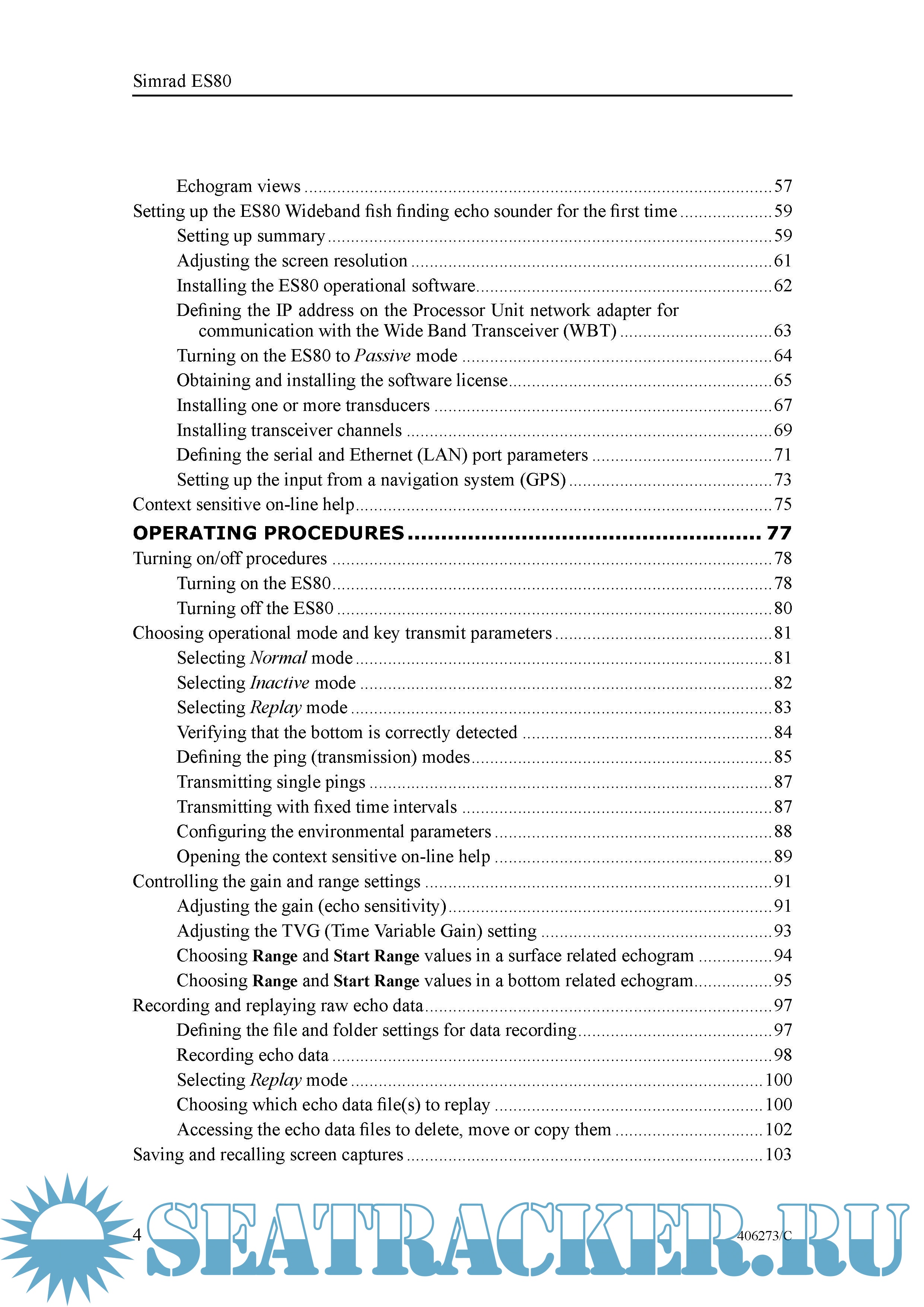 Description: The purpose of this manual is to provide the descriptions and procedures required to allow for safe and efficient use of the Simrad ES80. The manual also offers a thorough understanding of the various ES80 operational settings and adjustments.