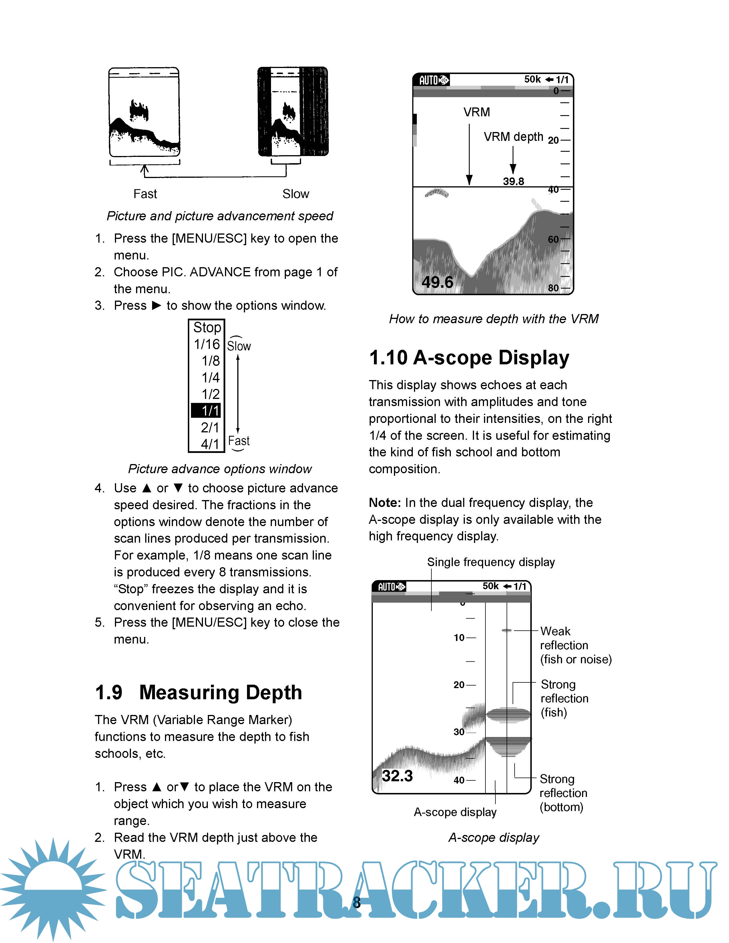 • Automatic function permits unattended adjustment of range and gain. The range scale and gain automatically change to display the bottom in the darkest gray tone on the lower half of the screen.