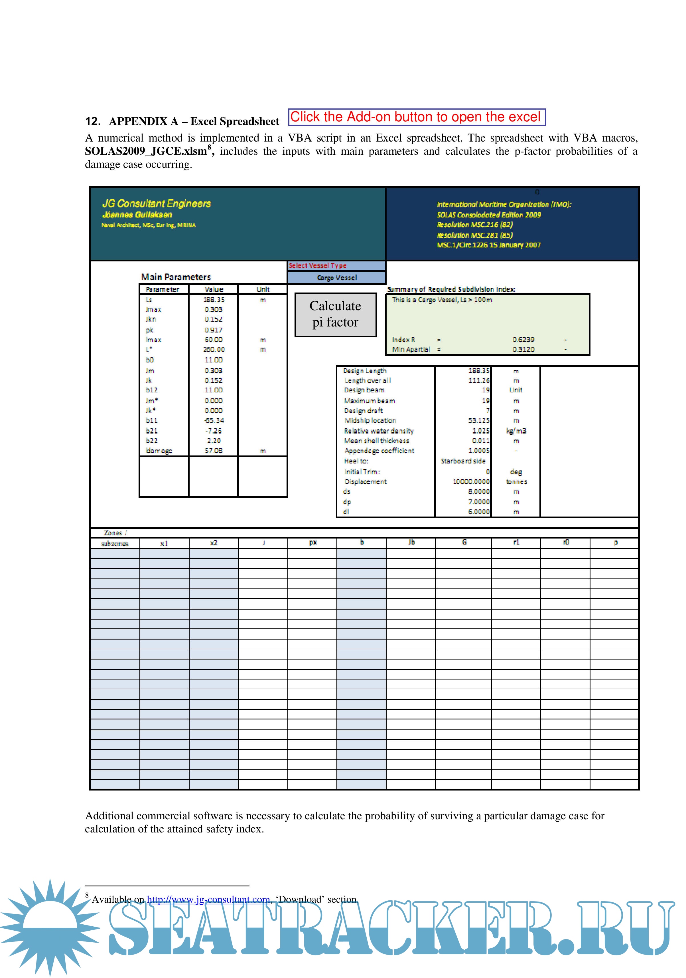 A numerical method is implemented in a VBA script in an Excel spreadsheet. The spreadsheet with VBA macros, SOLAS2009_JGCE.xlsm8, includes the inputs with main parameters and calculates the p-factor probabilities of a damage case occurring.