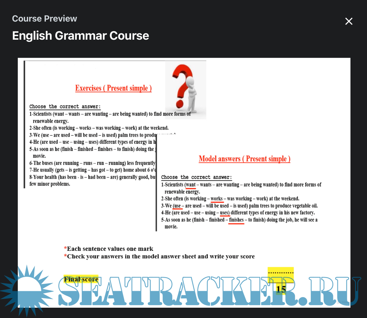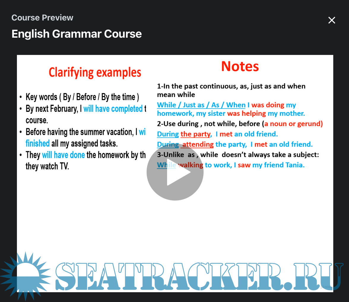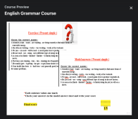 This English grammar course consists of: *Auxiliary verbs : Verb to be / Verb to do / Verb to have *Pronouns: *Types of sentences : Simple statement / Question / Negative / Order *The 12 English tenses with detailed description: -the usage and form of each tense reinforced with detailed examples about each single point. -all linkers related to the tenses with the exception rules. -clarifying sentences to learn and understand each tense well. -a quiz after each tense to support your understanding and usage to the grammar rules. -a pdf practice sheet after each tense to be well trained after studying this tense. -a model answer sheet to give yourself a score and evaluate your progress. -a pdf sheet about regular and irregular verbs. -a comparison between some tenses during explaining some rules. *Passive -Usage and form in all tenses *Causative -Active and passive causative with have & get *Articles (a/an/the) *Countable and uncountable nouns ( much / many / a lot of / few / a few / little / a little / some / any ) *Question tags ( Basic and exceptions ) *Conditional If Conditional if one / if two / if three / mixed if / alternative words (as long as, suppose, provided ......) / unless / without / but for *Wish / If only / as / as though / it's time / it's high time / would rather *Relative clauses who / which / that / whose / where / when *Reported speech *So / such / too / enough *Contradiction Linkers -but / although / though / even though / despite (this) / in spite of (this) / despite the fact / in spite of the fact (that) -however / whatever -nevertheless / yet / as *Distributives 1-all / all of 2-both / both of 3-either / either of 4-neither / neither of 5-half / half of 6-each / each of 7-every *Modal verbs - (can / could / shall / should / will / would / must / have to / has to / had to / may / might / need to / ought to) - Modal verbs ( deduction / necessity / lack of necessity / prohibition / advice ) -Modal verbs ( present simple / past simple / present con. / past con. )