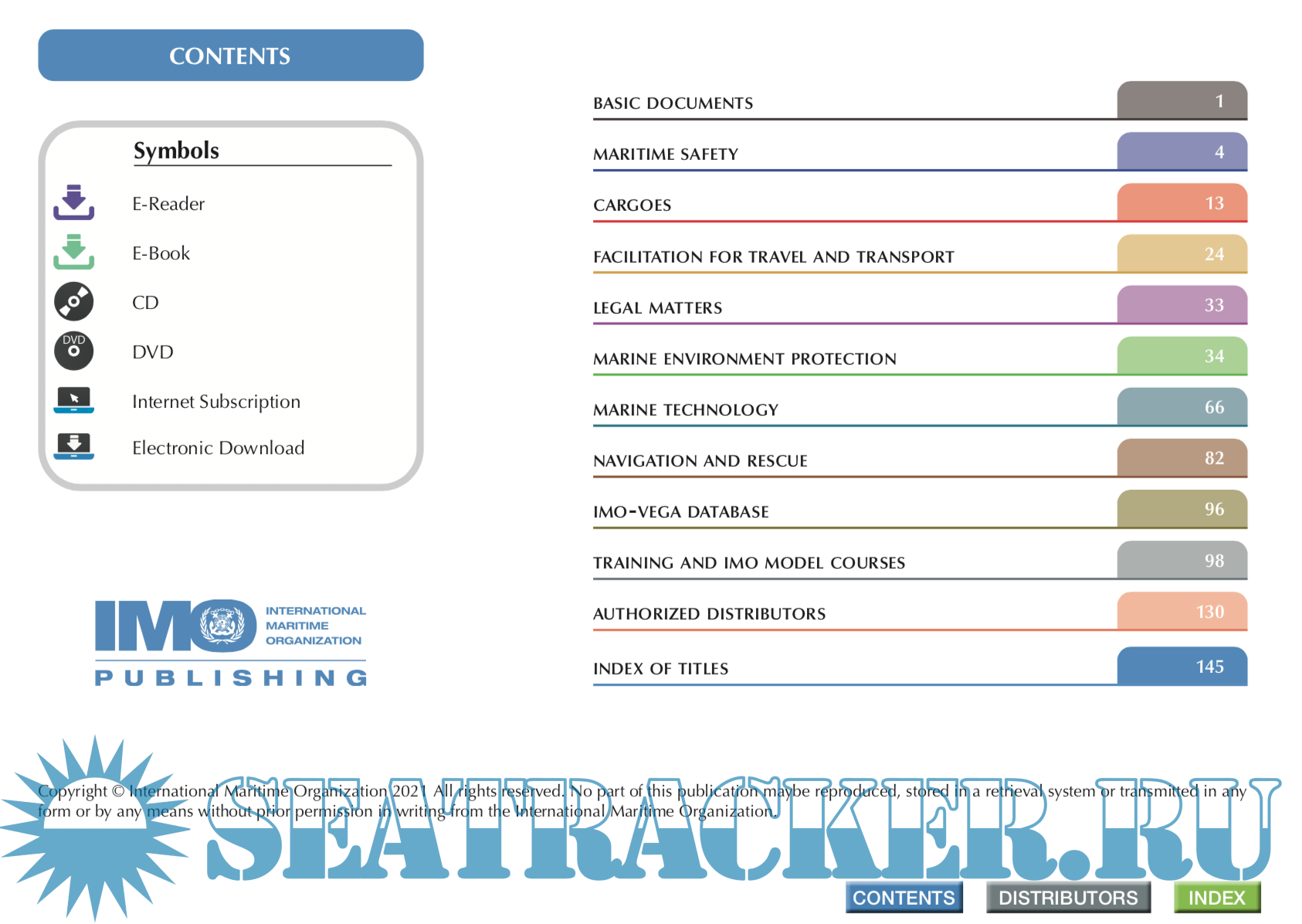 Year: 2021 Language: english Author: IMO Genre: Catalogue Publisher: IMO Format: PDF Quality: eBook Pages count: 79 Description: IMO Publishing’s activities provide the world’s maritime community with numerous texts (conventions, codes, regulations, recommendations, guidelines, etc.) prepared by the Organization. There are over 200 titles available in English. Many are translated into Arabic, Chinese, French, Russian and Spanish. IMO Publishing also produces digital products, namely e-books, e-readers, electronic downloads, CDs and internet subscriptions. The dissemination of this information, including attendance at maritime exhibitions worldwide and regular e-newsletters to interested parties, plays an important role in promoting shipping as a safe, secure, efficient and environmentally-friendly method of transporting goods around the globe Additional info: New version of https://seatracker.club/viewtopic.php?t=42133