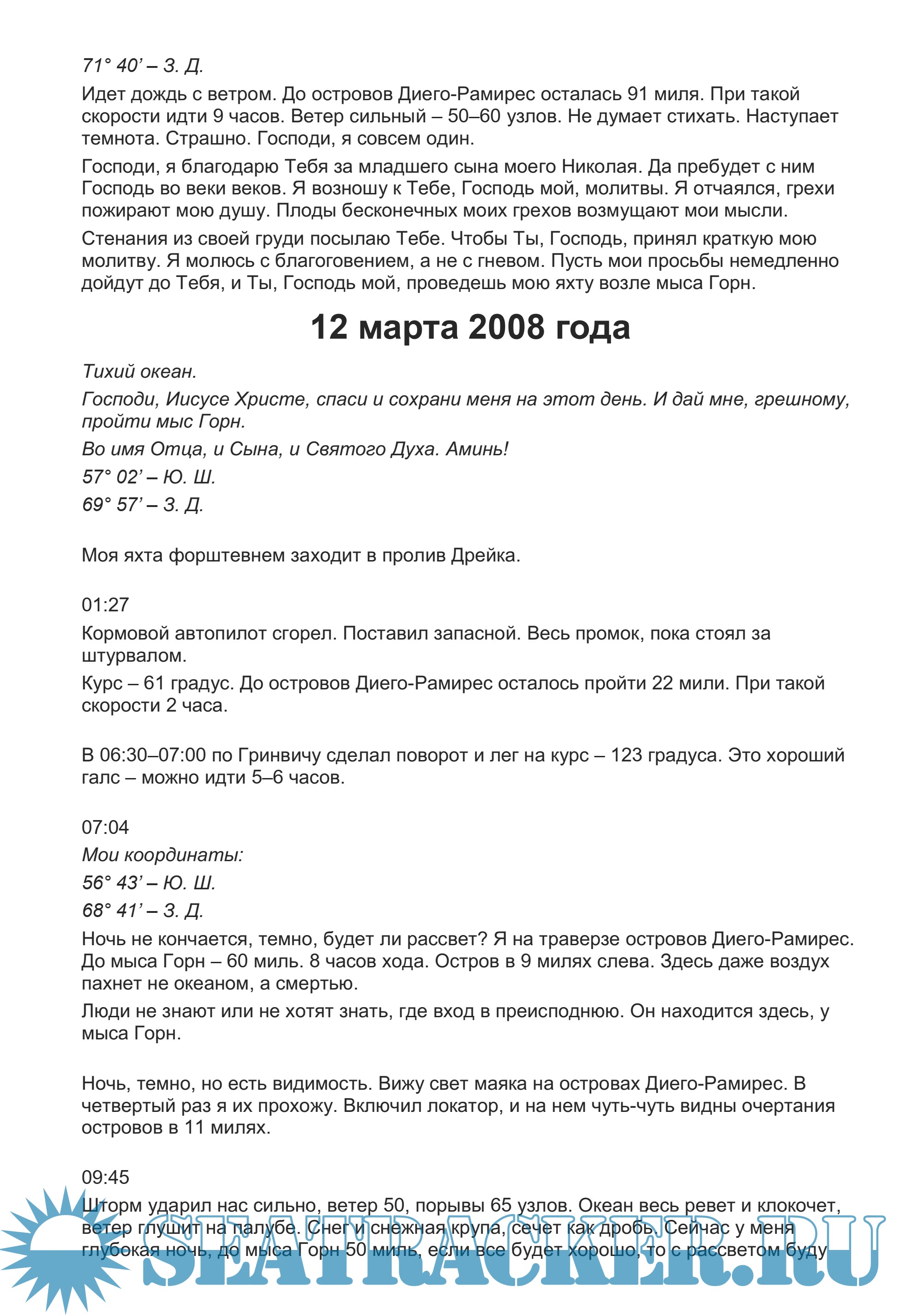 Автор рассказывает о сложном приключении, когда он два дня провел в сильнейшем шторме: там любое неверное движение могло стать первым и последним. В книге много полевых заметок, личных мыслей автора, его размышлений по поводу того, что помогает человеку держаться на грани жизни и смерти.