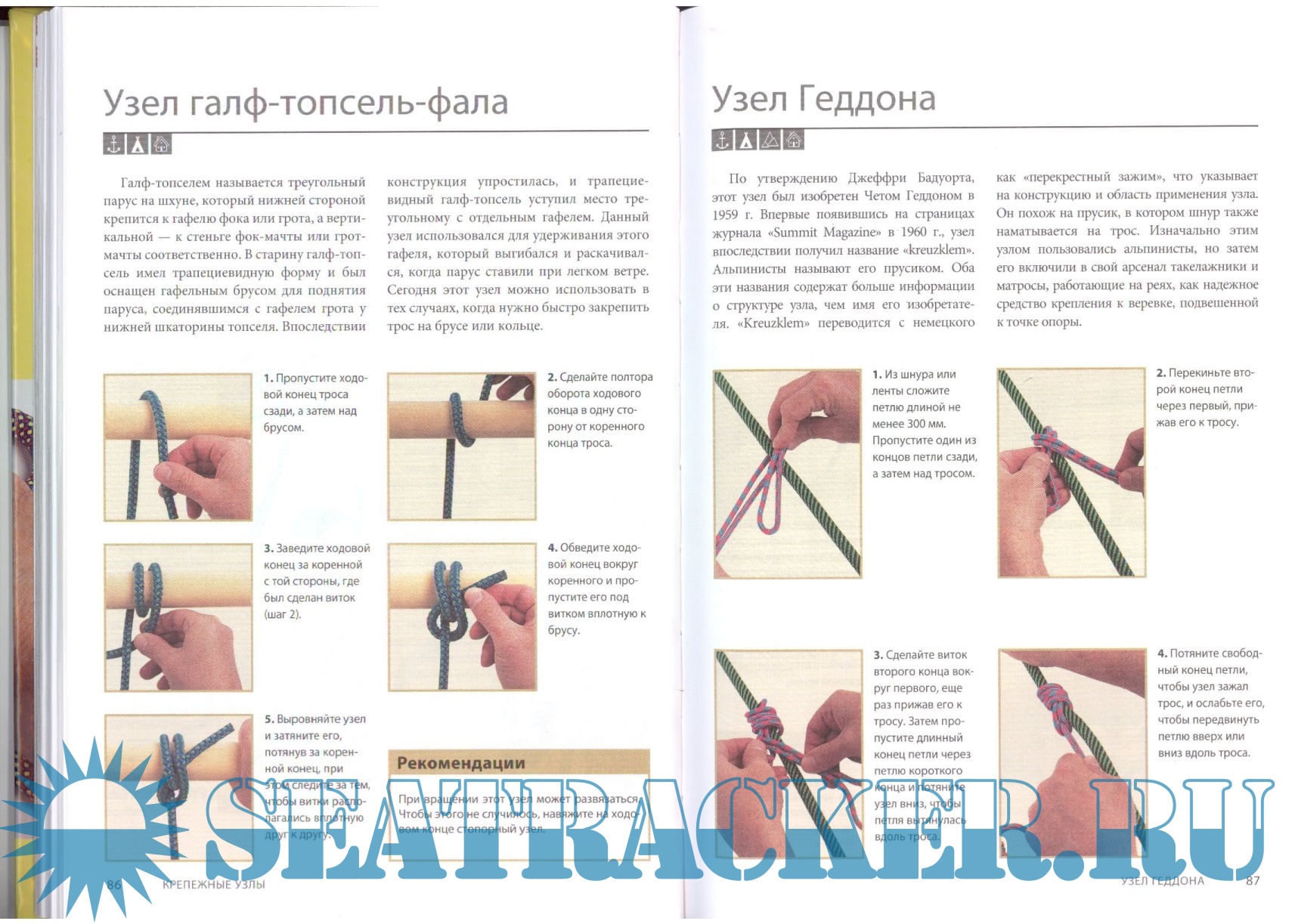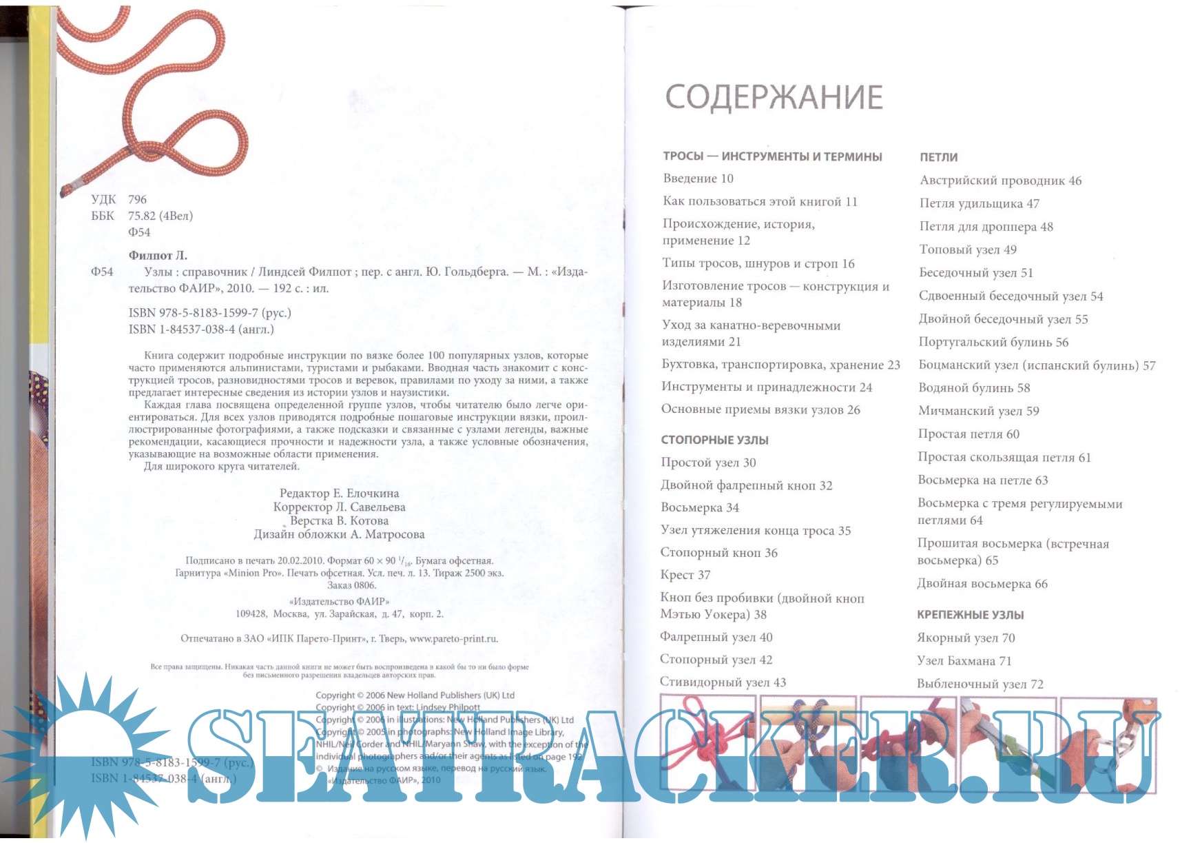 Вводная часть знакомит с конструкцией тросов, разновидностями тросов и веревок, правилами по уходу за ними, а также предлагает интересные сведения из истории узлов и наузистики. Каждая глава посвящена определенной группе узлов, чтобы читателю было легче ориентироваться. Для всех узлов приводятся подробные пошаговые инструкции вязки, проиллюстрированные фотографиями, а также подсказки и связанные с узлами легенды, важные рекомендации, касающиеся прочности и надежности узла, а также условные обозначения, указывающие на возможные области применения.