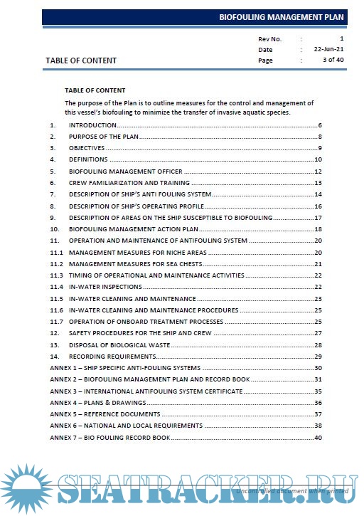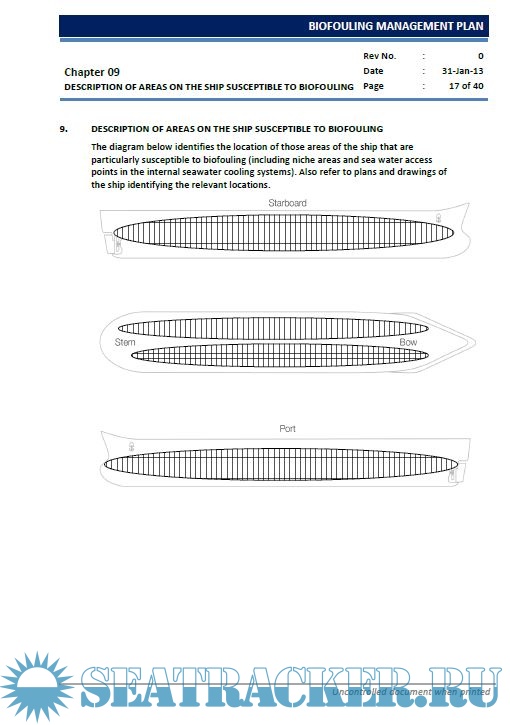 The Plan is following the outline given in the IMO guideline, MEPC.207(62), dated 15 July 2011, Guidelines for the control and management of ship’s biofouling to minimize the transfer of invasive aquatic species.