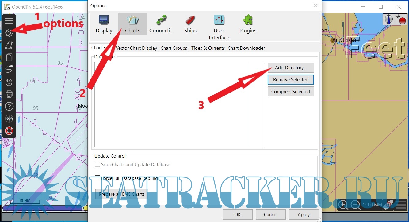 3. after openCPN is installed, open it and click on "options'' then click on "charts", now click on "add Directory" and select the extract folder of World Charts. and finally click on OK. (like the pic below)