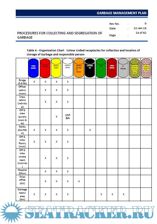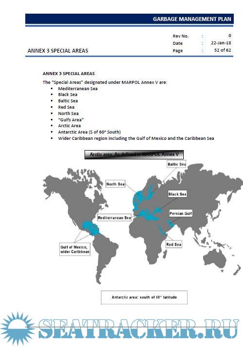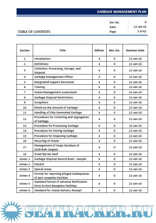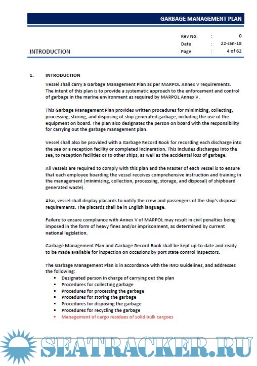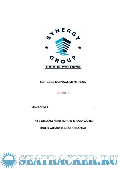 Year: 2018 Language: english Author: Synergy Maritime Pvt. Ltd. Genre: Manual Publisher: Synergy Maritime Pvt. Ltd. Edition: 4 Format: PDF Quality: eBook Pages count: 62 Description: Garbage Management Plan as per MARPOL Annex V requirements. The intent of this plan is to provide a systematic approach to the enforcement and control of garbage in the marine environment as required by MARPOL Annex V. This Garbage Management Plan provides written procedures for minimizing, collecting, processing, storing, and disposing of ship‐generated garbage, including the use of the equipment on board. The plan also designates the person on board with the responsibility for carrying out the garbage management plan.