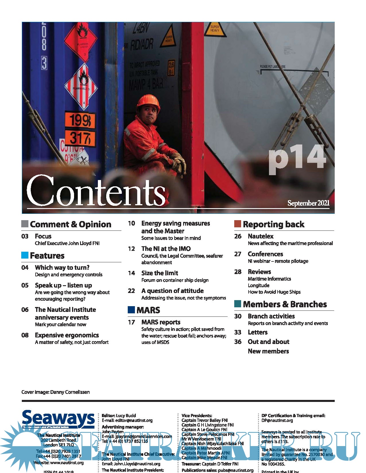 Year: 2021 Language: english Author: The Nautical Institute Genre: Periodical (magazine) Format: PDF Quality: Unknown Pages count: 40 Description: Edition September, 2021 Seaways Recognised as one of the leading maritime journals, Seaways is sent out to all members monthly. It is the international journal of The Nautical Institute and has the most vibrant professional correspondence section to be found anywhere in the industry. The vitality of the journal is shared by those who contribute to it and those who read it. It is designed to advance high professional standards and promote fellowship within the profession. This is achieved through contributions and debate directed at a practical level, designed to improve the safe and efficient operation of ships and other maritime ventures.Seaways is the vehicle which links professionals worldwide and enables members to be kept up-to-date with changes in legislation, management and technical procedures, new ideas and books, and announcements. It is also a steadying influence on impractical proposals.