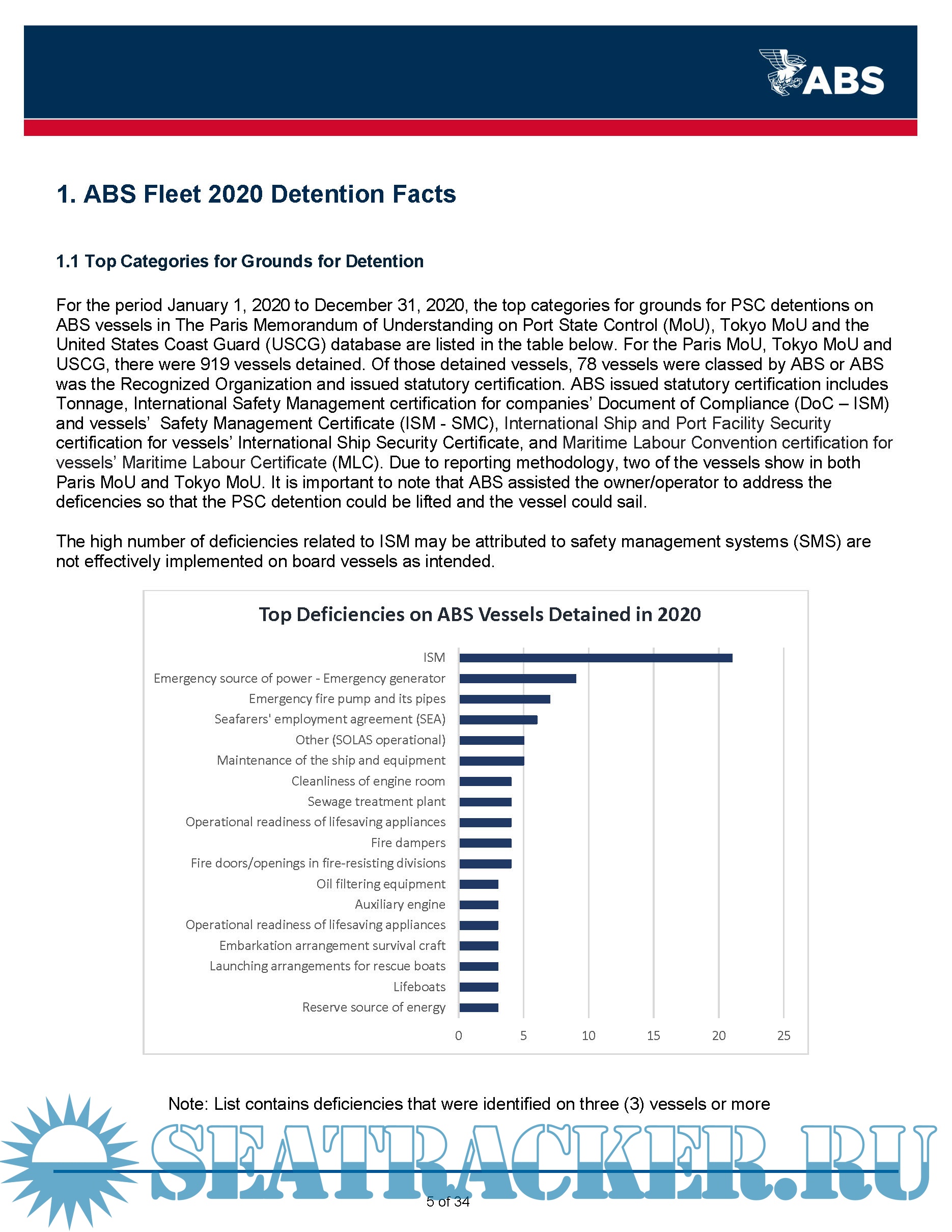 Description: This ABS Annual Report on Port State Control (PSC) provides information to owners on deficiencies identified on ABS vessels during inspections carried out by the various PSC regimes globally during the 2020 calendar year. This report is being made available to assist owners by providing awareness of potential areas of concern that have been identified on ABS classed vessels.