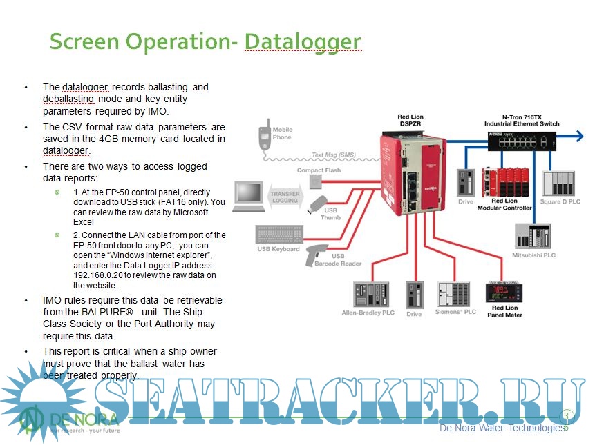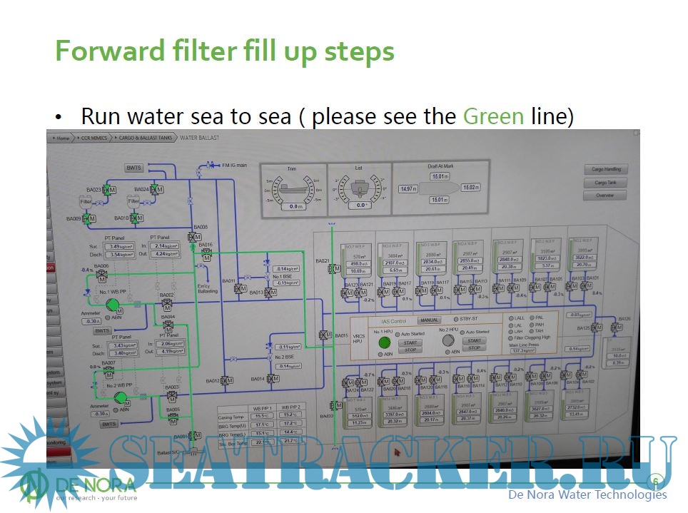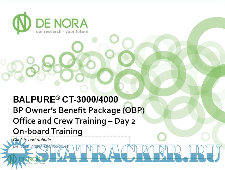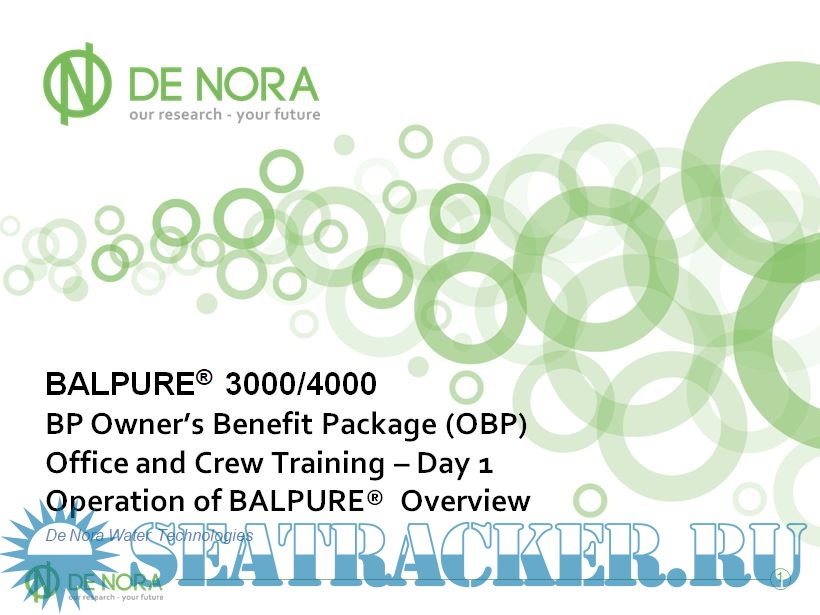 Year: 2014 Language: english Author: De Nora Publisher: De Nora Water Technologies Format: PPT Quality: eBook Pages count: Multiple Description: Introduction to BALPURE: Balpure is a ballast water treatment system that uses in-situ electrochlorination, a proven and efficient method for disinfection. DNWT developed Balpure’s two-phase process concept: main flow filtration for ballast water and slip stream electrochlorination for treatment. Main Flow Filtration filters the incoming ballast water down to 40 micron. Slipstream Electrochlorination enables the BALPURE® system to operate in any water conditions (approx. 1% of ballast water is used). Strong chlorination during ballasting restricts potential regrowth of organisms with a Cl2 residual after ballasting is complete. Additional info: British Petroleum Owner's Benefit Package (OBP).