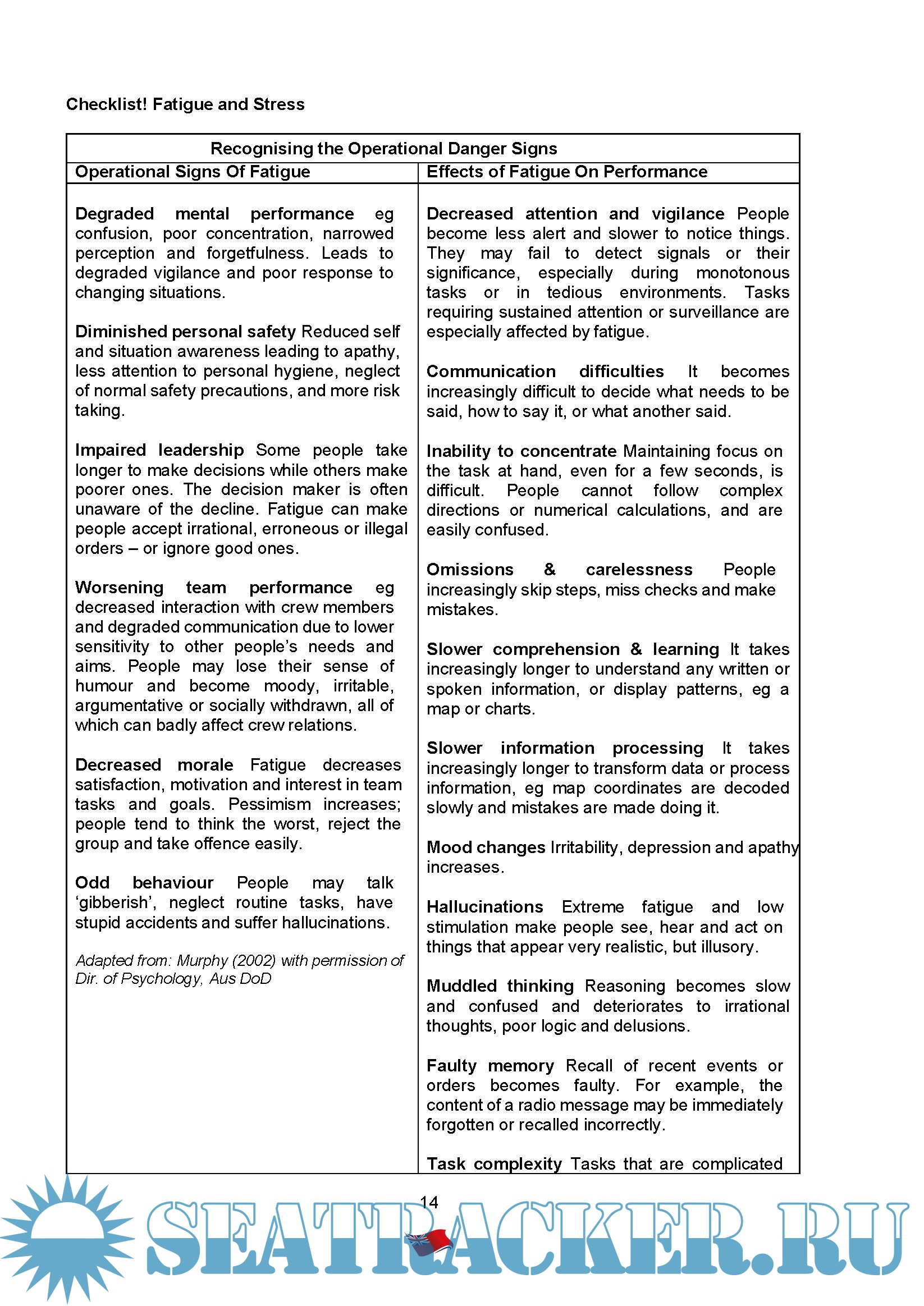 Year: 2021 Language: english Author: MCA Genre: Guide Format: PDF Quality: eBook Pages count: 26 Description: HUMAN ELEMENT GUIDANCE- PART 1 MGN505 Amendment 1 Fatigue and Fitness for Duty: Statutory Duties, Causes of Fatigue and Guidance on Good Practice Notice to all Ship Owners, Ship Operators and Managers, Masters, Officers and Crew of Merchant Vessels, Skippers and Crew of Domestic Passenger Ships and Inland Waterway Vessels. This Marine Guidance Note: 1. Reminds owners, operators, managers and all personnel working on board seagoing, domestic and inland waterway vessels about their duties under UK and international shipping legislation in relation to fatigue, and 2. Provides some practical information and guidance for consideration about; i. Factors leading to fatigue and impaired fitness for duty, ii. Policies and practices which can reduce the cause and impact of fatigue and other performance impairing factors iii. Development and use of fatigue management plans to improve the identification, management and reduction of fatigue and other performance impairing factors, iv. Useful checklists to help identify fatigue and stress and take preventative actions, and v. Useful sources of additional information about fatigue and fatigue management.