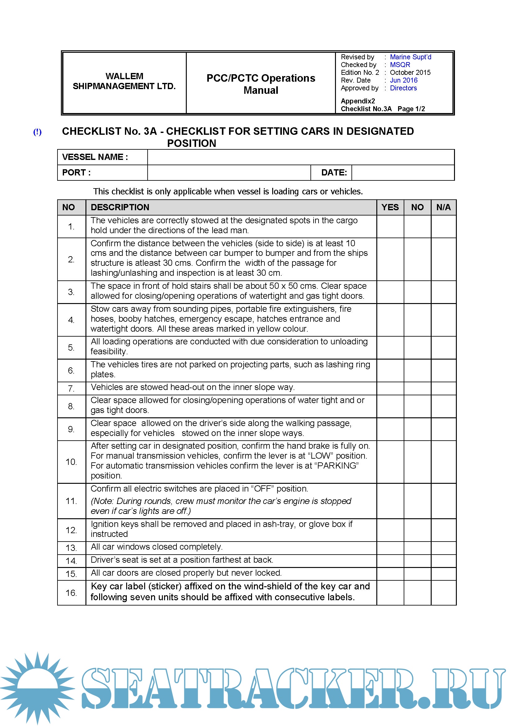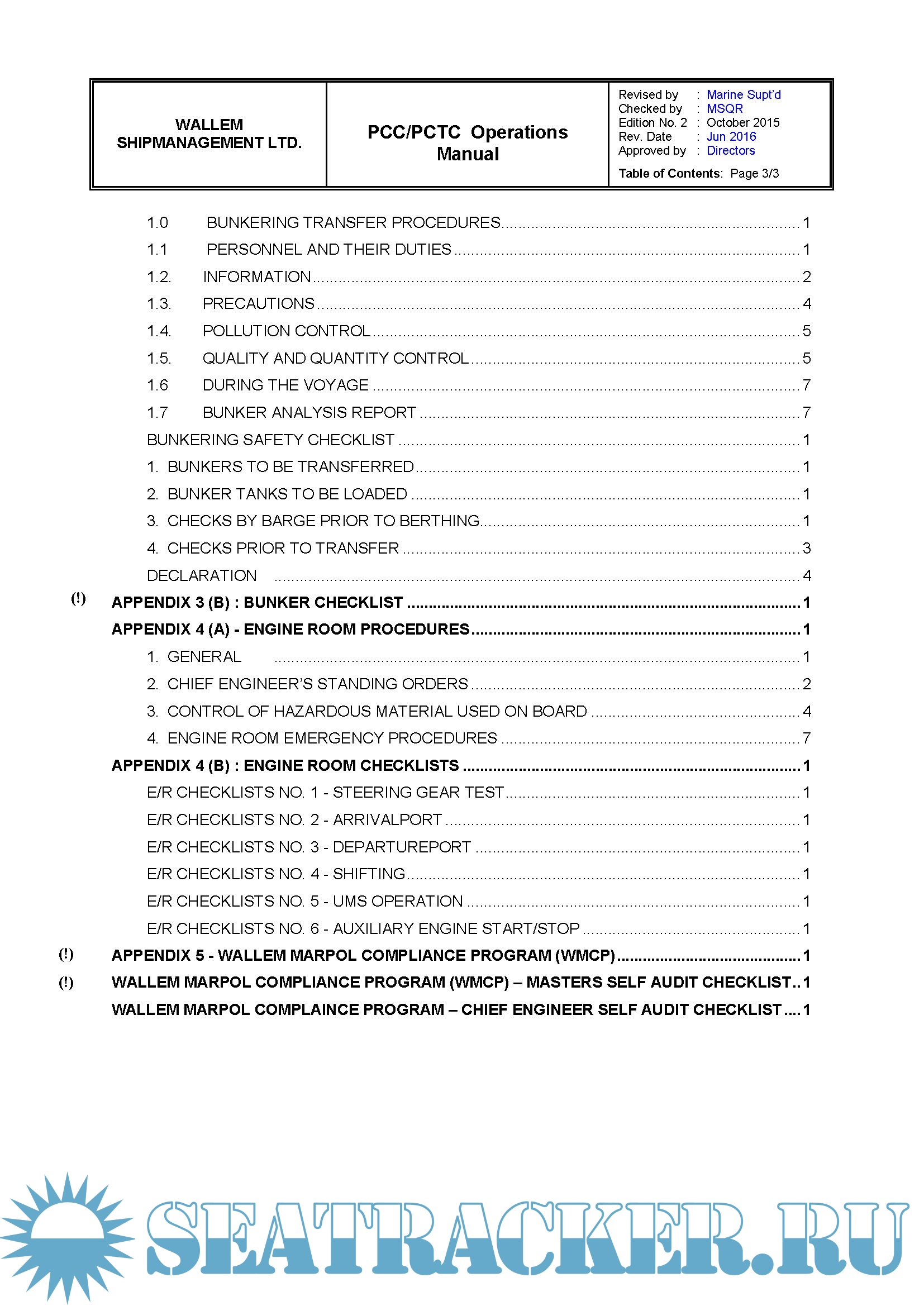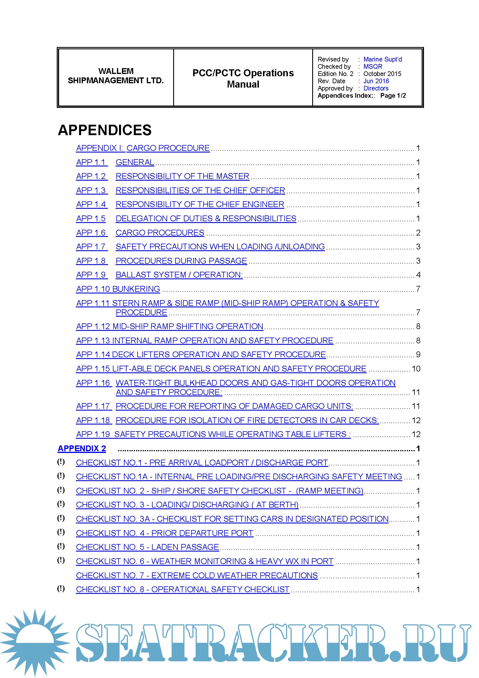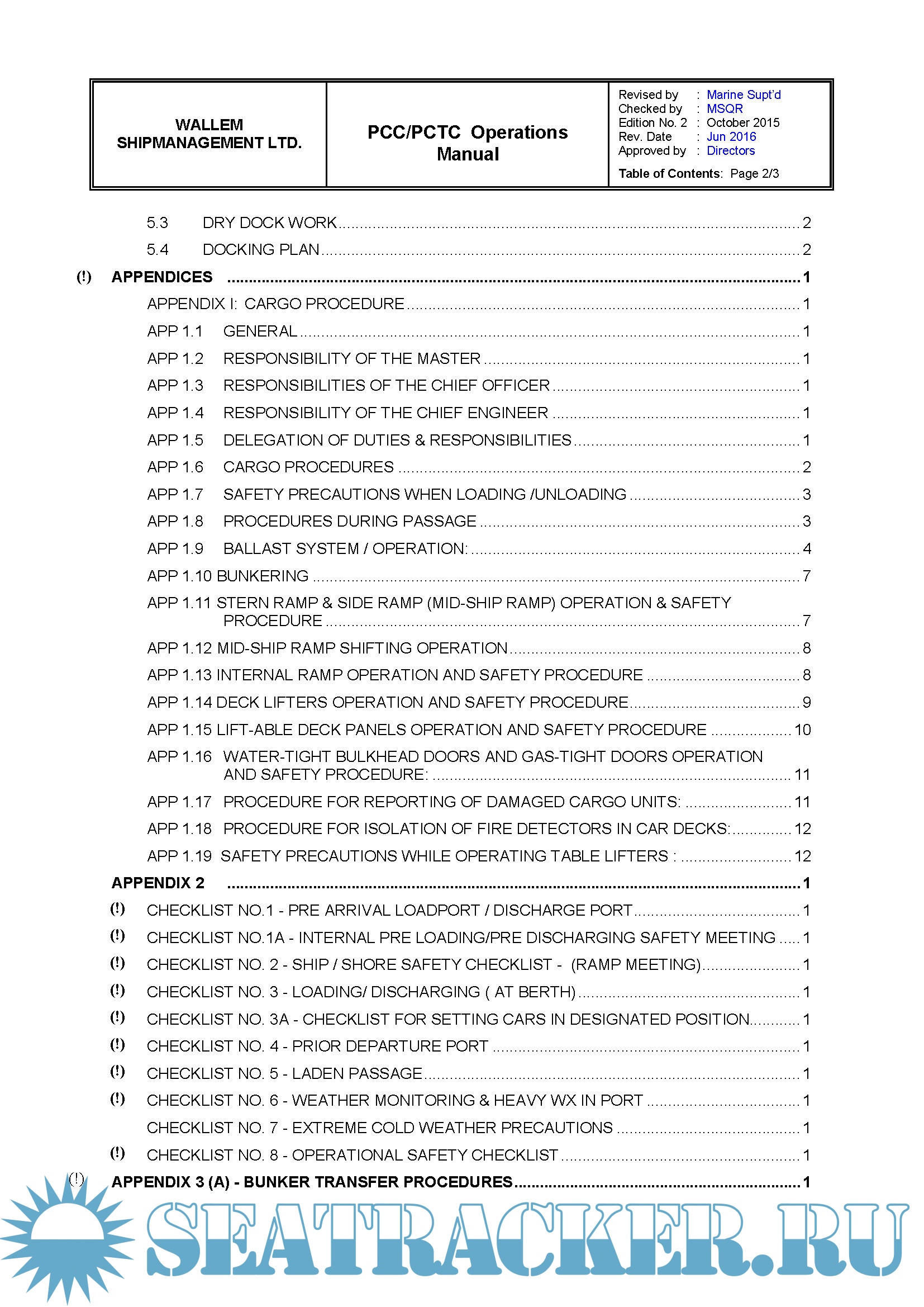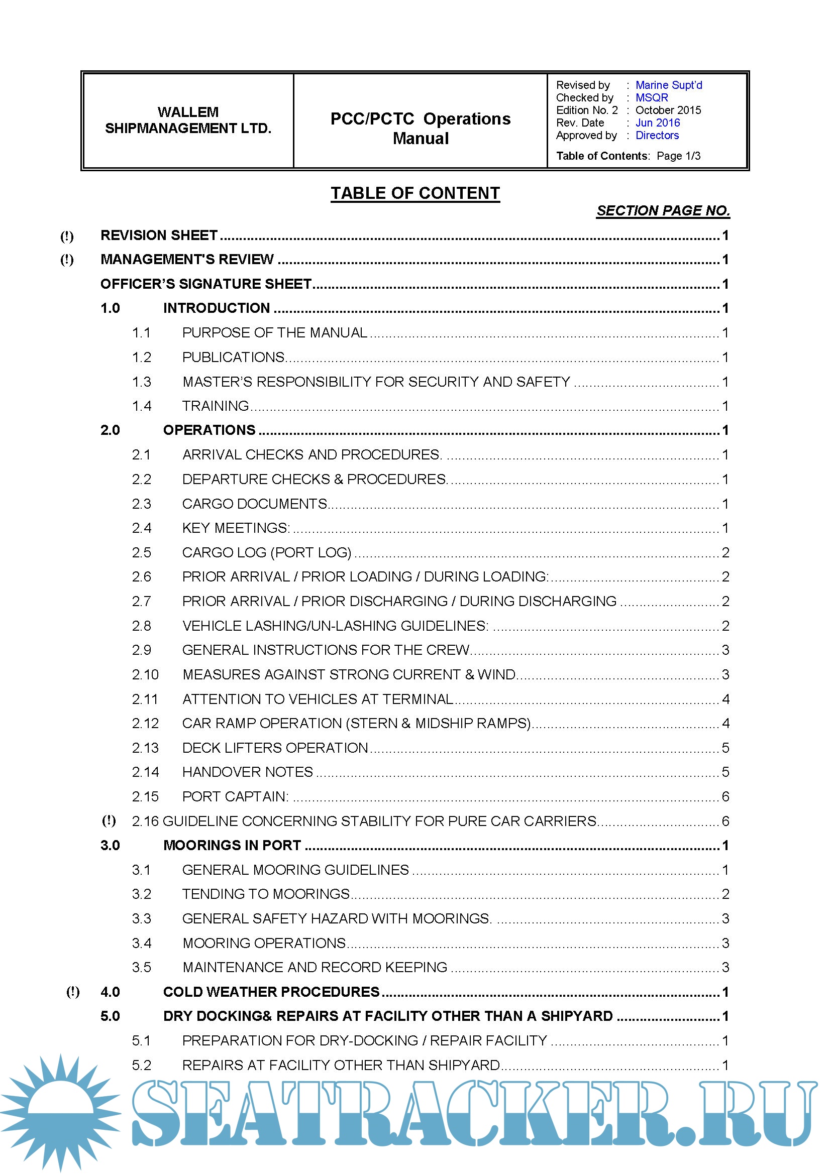 Description: The purpose of this manual is to provide guidance to the Master, Officers and appropriate Ratings on the procedures to be followed on board a PCC / PCTC in order to attain safe and efficient Operation.