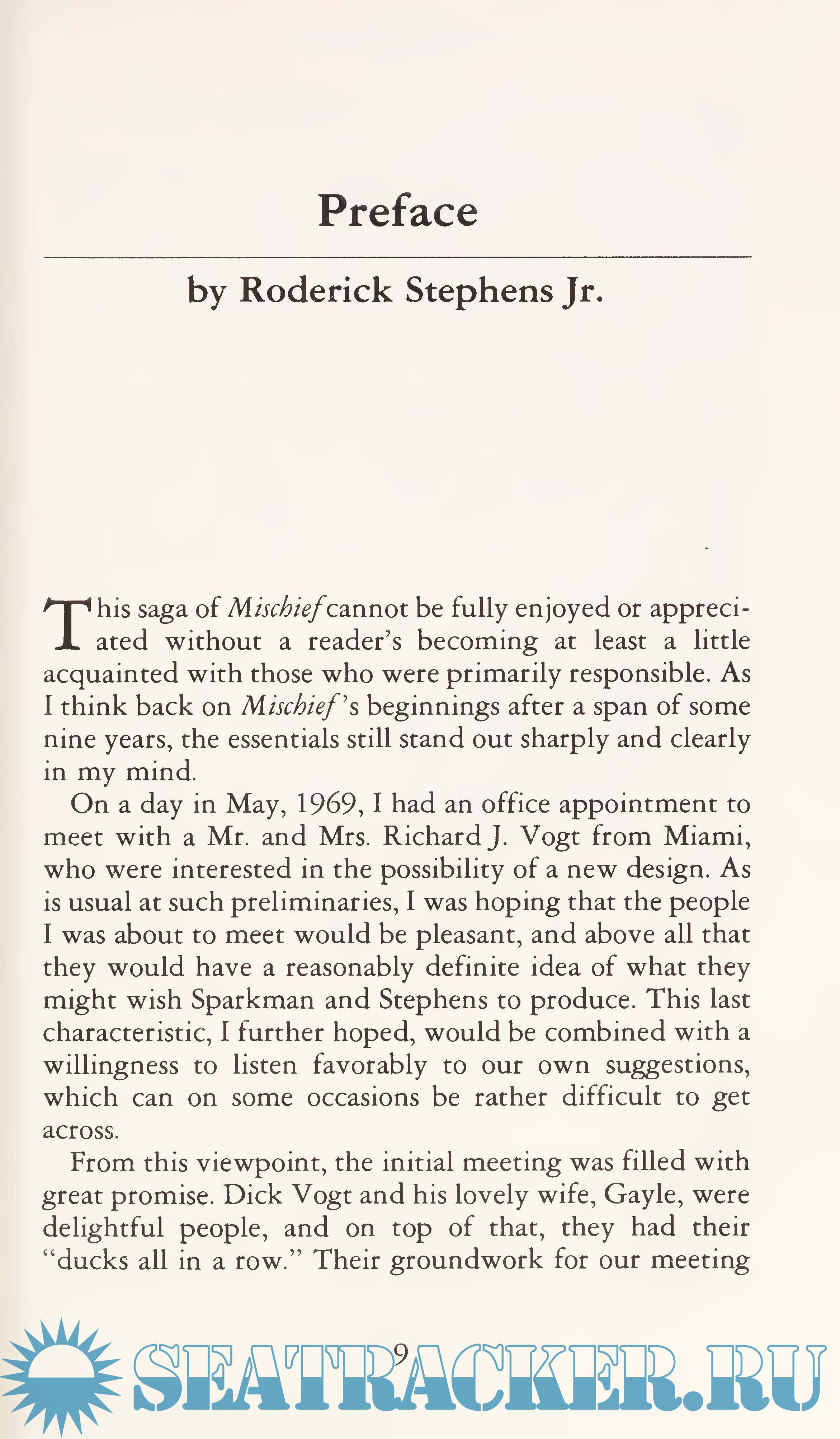 Description: This is the account of a Florida banker and his wife, a college professor, who decided in mid-life to quit their jobs, sell their home, and build a boat to spend the rest of their days cruising in different parts of the world. Not just another nautical adventure story, this book instead is the story of one couples carefully planned realization of the dream so many people share. It is also a celebration of their boat, Mischief', one of the best-known custom- built ocean cruisers of the '70's.