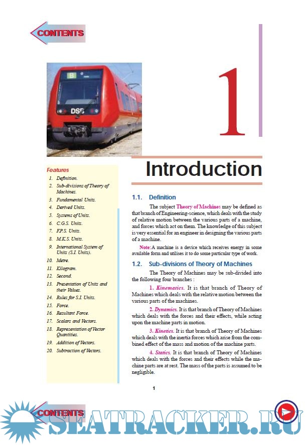 Description: The book begins with an introduction to the subject. This is followed by chapters on kinetics and kinematics of motion, velocity and acceleration in mechanisms, friction, gear trains, toothed gearing, dynamo-meters and brakes. Chapters on concepts like cams, rotating and reciprocating masses, transverse and longitudinal vibrations, torsional vibrations, and automatic control are also included in the book. A separate chapter is dedicated to computer-aided analysis and synthesis of mechanisms.