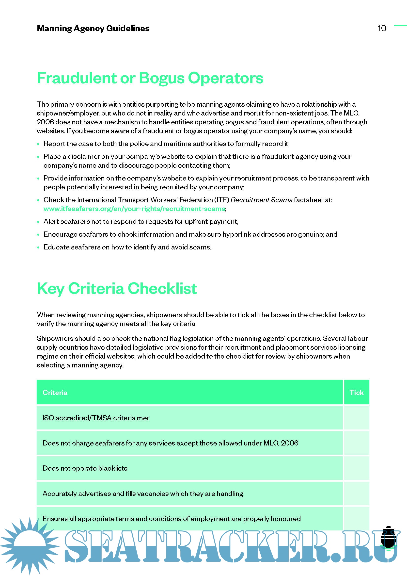 • Help shipowners ensure their relationship with their manning agencies upholds seafarers’ rights and