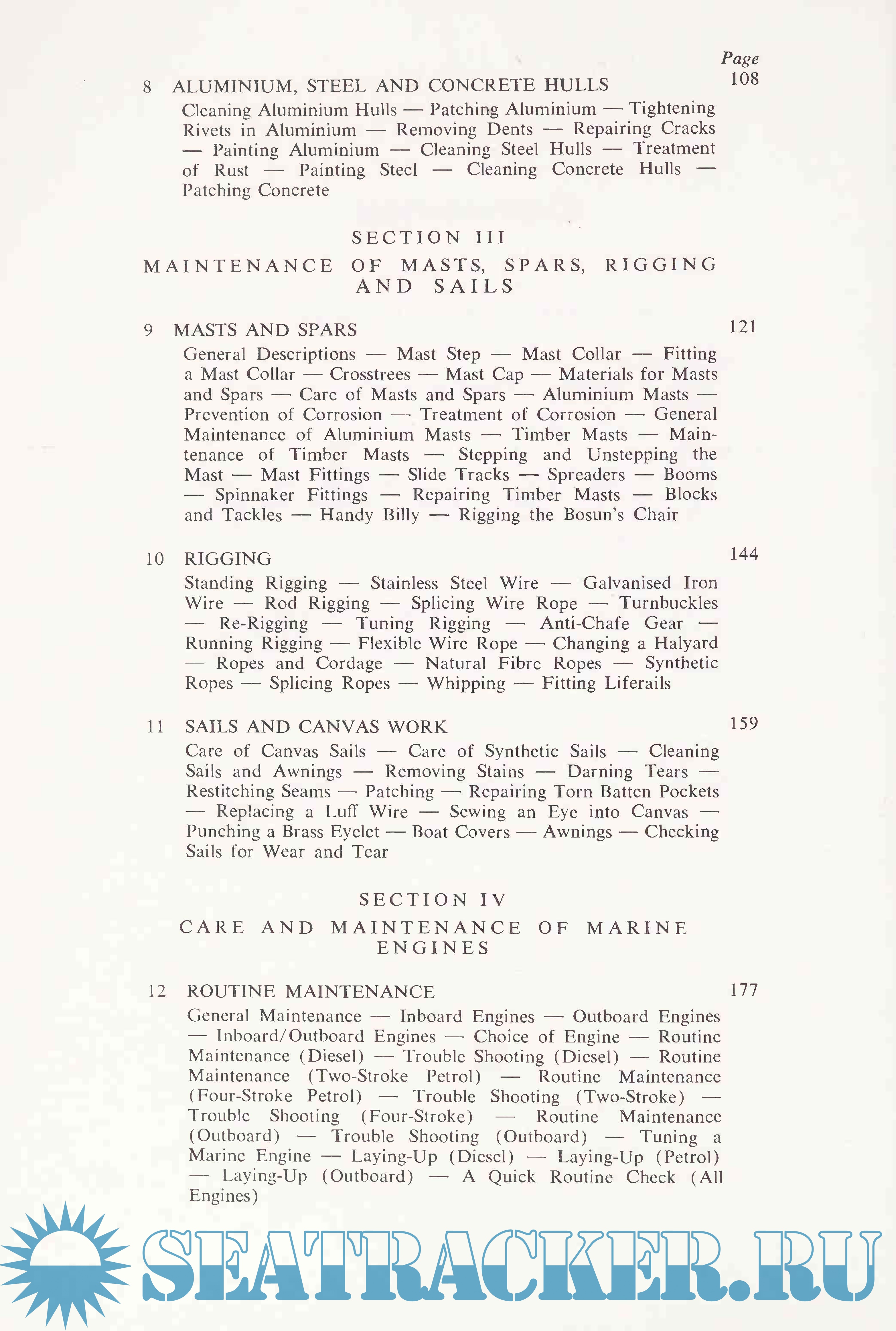 Sailboat maintenance is fully covered with a discussion of the care and repair of masts, spars, sails and rigging.
